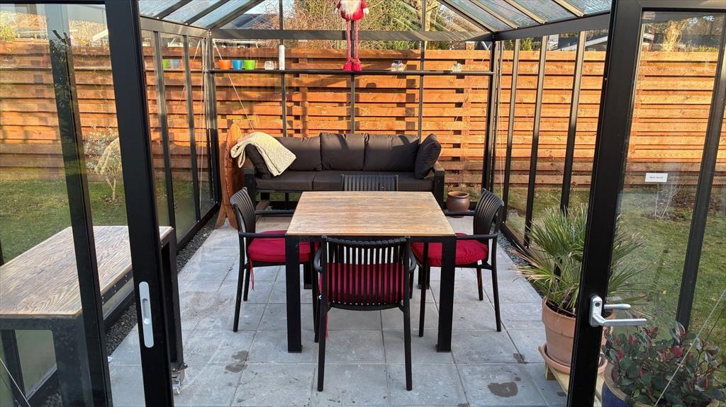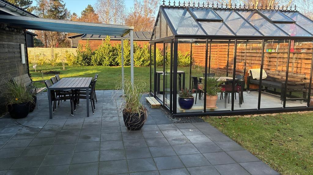 Drivhuset giver haven en ekstra dimension og bliver hurtigt et sted, man naturligt søger hen – hvad enten det er til en kop kaffe, en stille pause eller en lun sommeraften, når duggen begynder at falde. Udelivet er en integreret del af ferien her, og haven indbyder både til afslapning og nærvær.