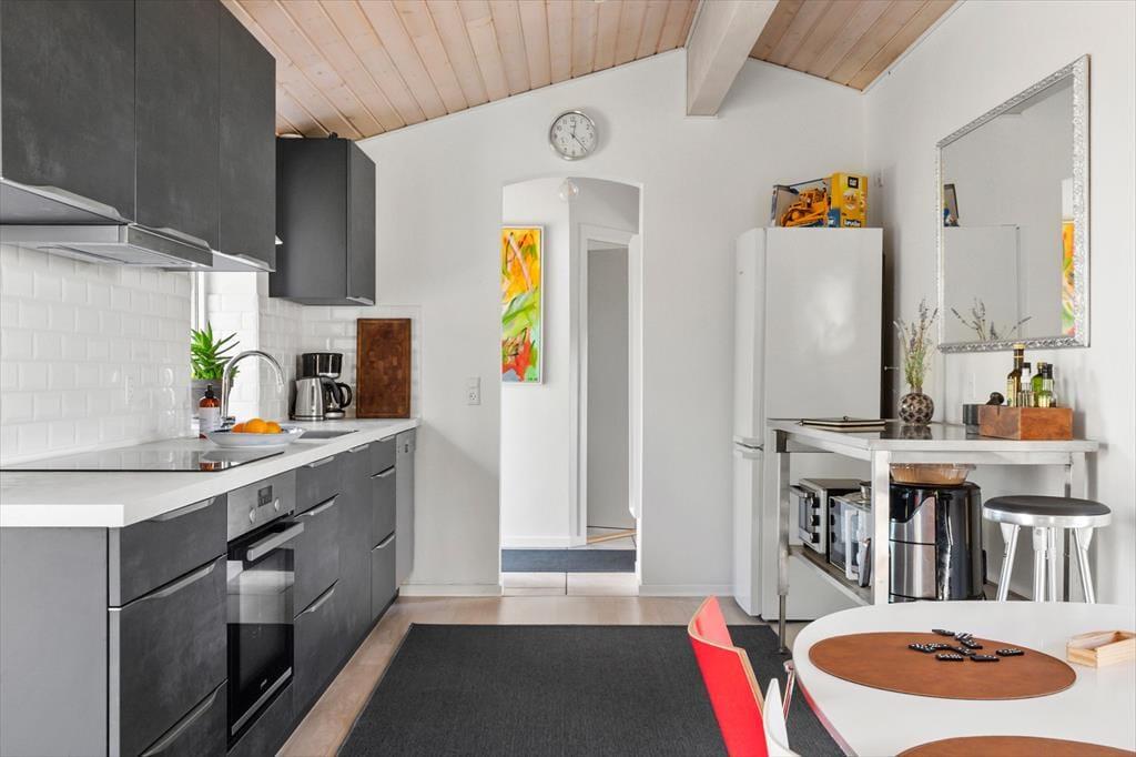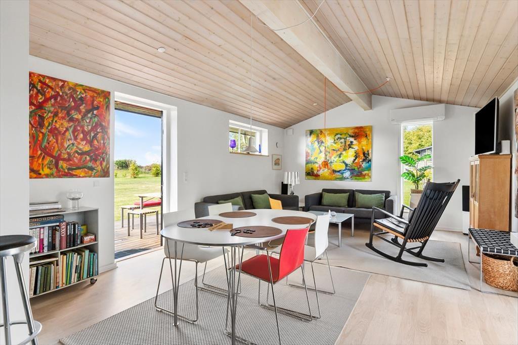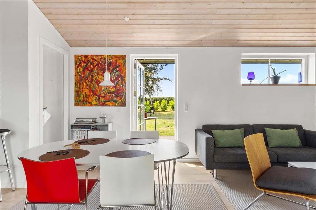 Indenfor møder du et ordentligt og lyst sommerhus, hvor stemningen er afslappet og lige til at være i. Stuen fungerer som husets naturlige samlingspunkt – et rum, hvor ferien får lov at udfolde sig i et roligt tempo. Lyset falder generøst ind og skaber en lethed, som gør rummet behageligt dagen igennem, uanset om I samles omkring et måltid, et spil eller blot nyder stilheden.