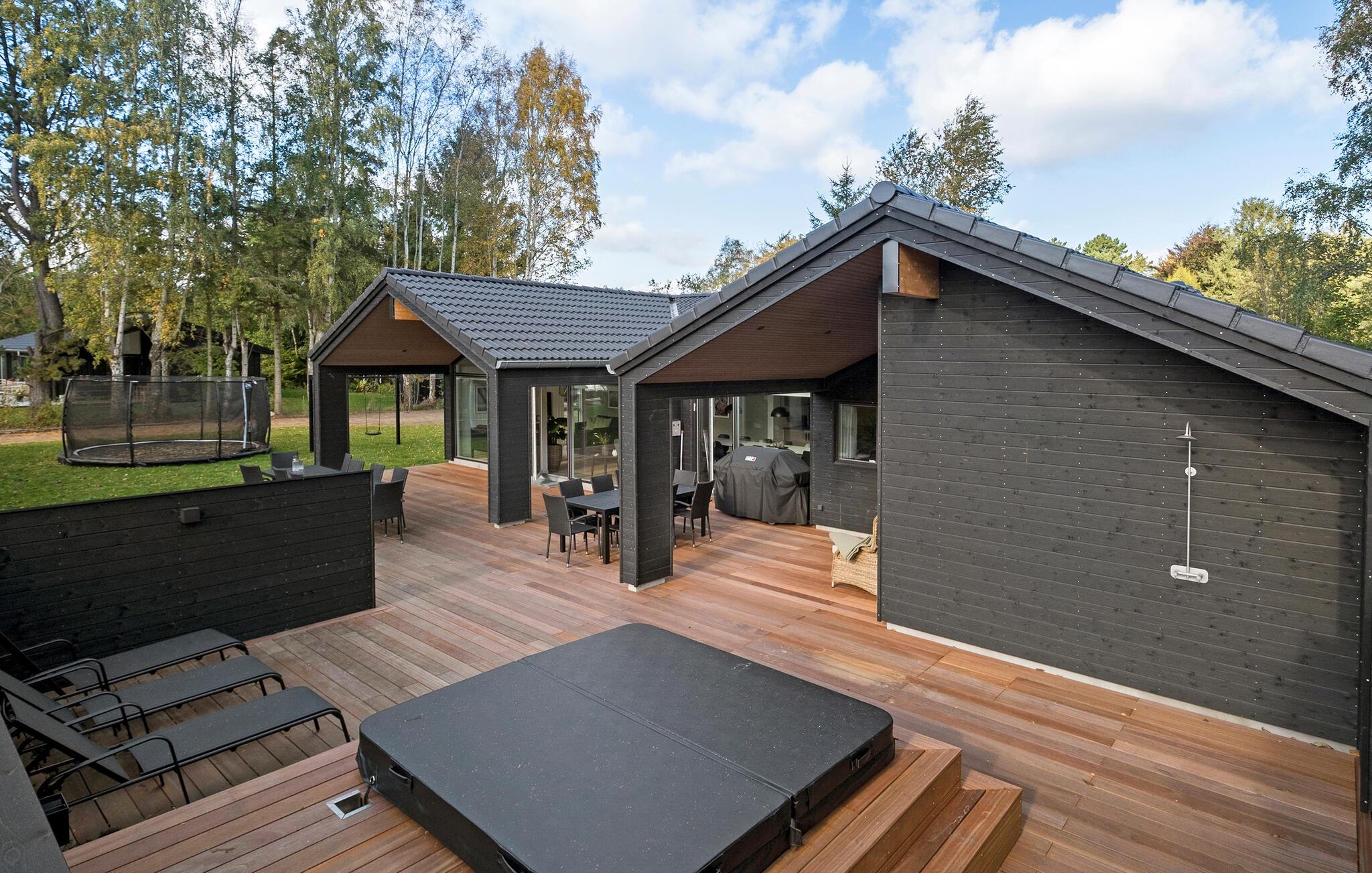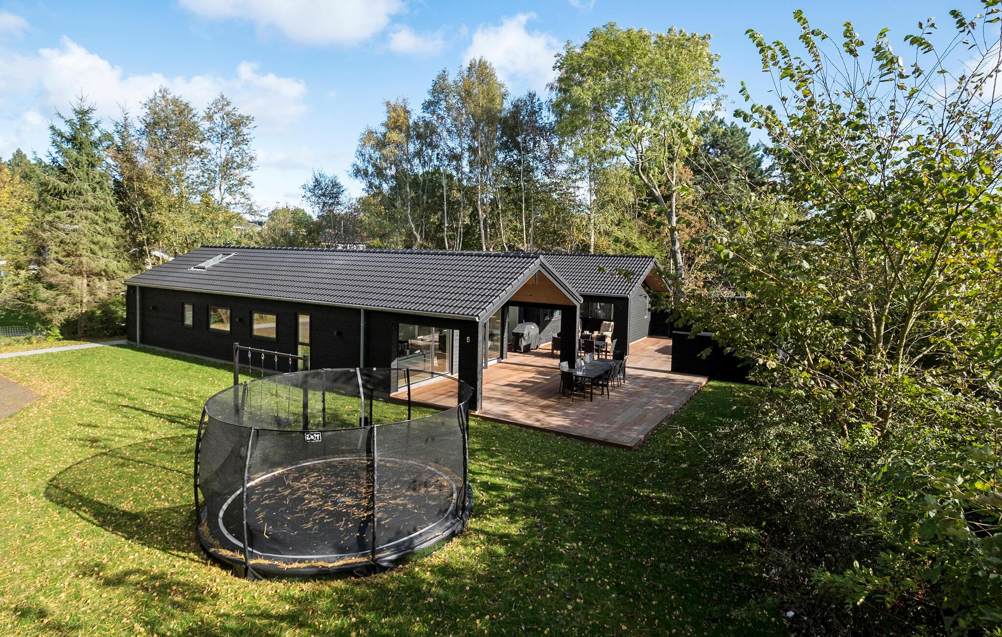 Tag jer en afslappende pause i den opvarmede udendørs jacuzzi og lad hverdagens stress forsvinde i det varme vand. Benyt også trampolinen, som vil bringe glæde for både børn og voksne. Et legetårn til de mindste sørger for, at hvert familiemedlem kan have det sjovt udendørs. Derudover er der udenfor en stor terrasse med havemøbler og grill.