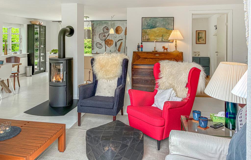 Velkommen til et skønt sommerhus, hvor man helt automatisk sænker skuldrene. Den førsteklasses beliggenhed og den private badebro på den nærliggende strand gør stedet til en helt særlig feriedestination. Træd indenfor og bliv budt velkommen af den lyse og venlige atmosfære. Opholdsstuen med komfortable lænestole og en brændeovn lægger op til at tilbringe afslappende timer. Tilbered kulinariske lækkerier i det moderne køkken med store bordplader og apparater af høj kvalitet.