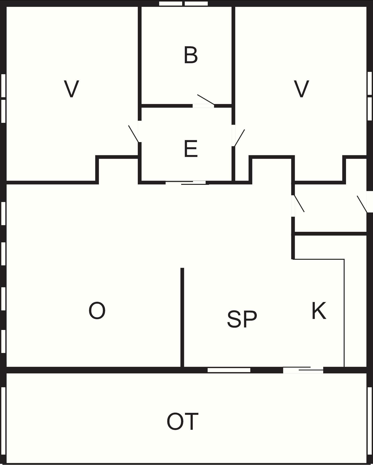 Dette kysthus er indrettet med entre og fordelingsgang samt to soveværelser, hvoraf det ene er med dobbeltseng. Det andet værelse i huset indeholder to enkeltsenge samt to køjesenge. Husene indeholder derudover en stor lys stue med brændeovn samt et stort køkken-alrum med spiseplads. Der er fra stuen direkte adgang til den store overdækkede terasse. I disse typer er der to badeværelser i boligen.