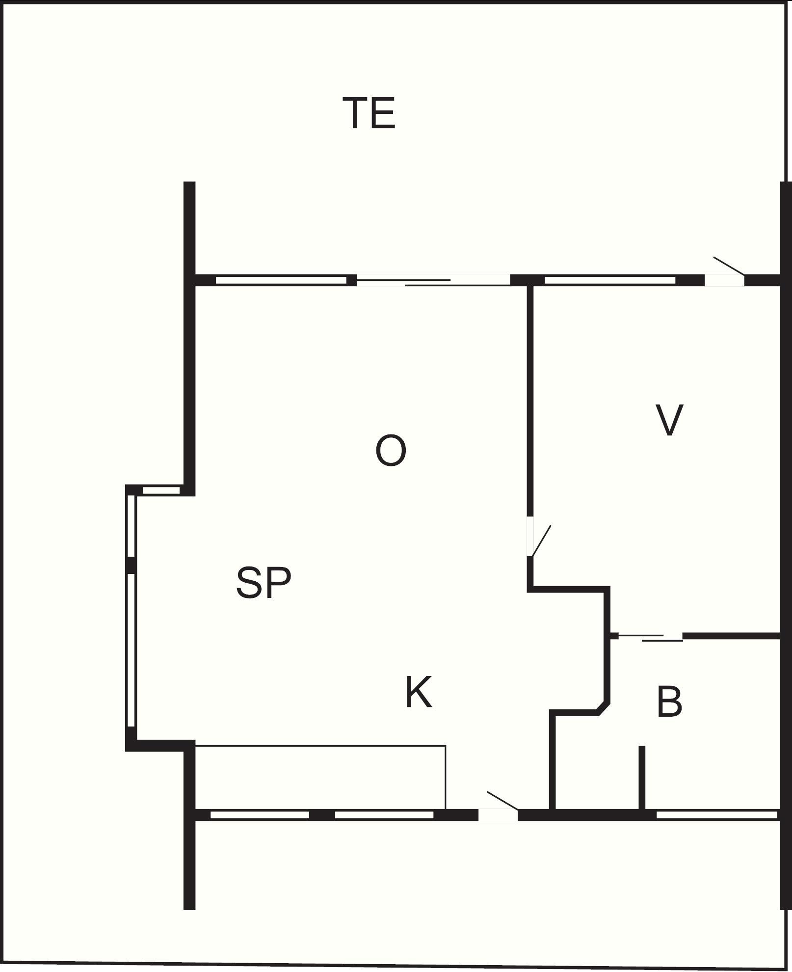Dette kysthus er indrettet med entre og fordelingsgang samt to soveværelser, hvoraf det ene er med dobbeltseng. Det andet værelse i huset indeholder to enkeltsenge samt to køjesenge. Husene indeholder derudover en stor lys stue med brændeovn samt et stort køkken-alrum med spiseplads. Der er fra stuen direkte adgang til den store overdækkede terasse. I disse typer er der to badeværelser i boligen.