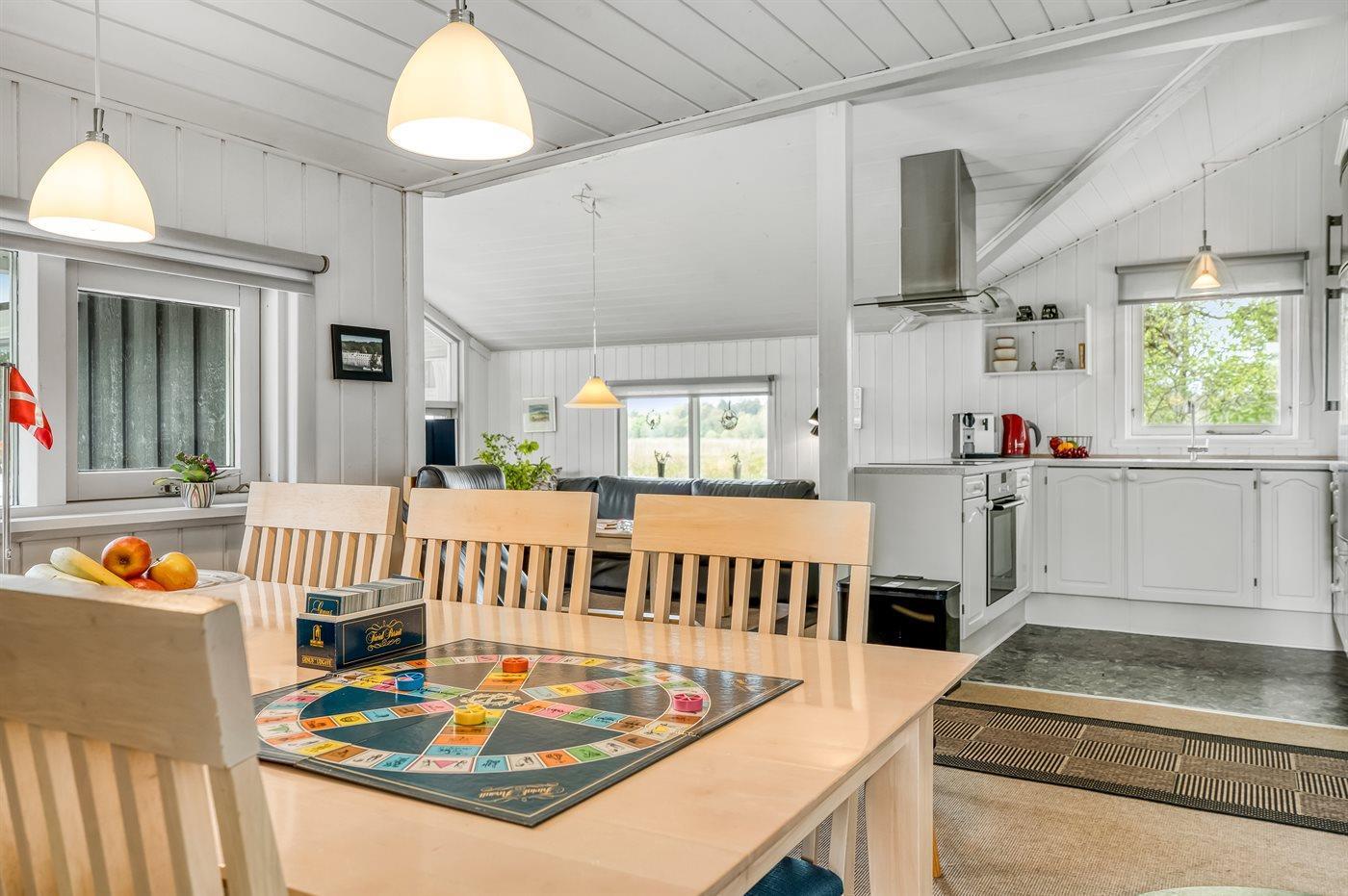 Køkkenet er udstyret med 1 køleskab. Der er 4 keramiske kogeplader, varmluftovn samt opvaskemaskine.