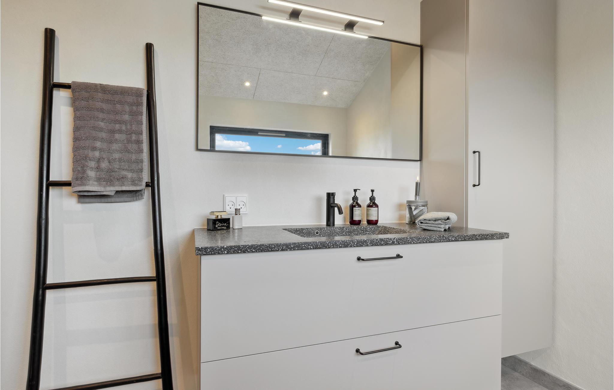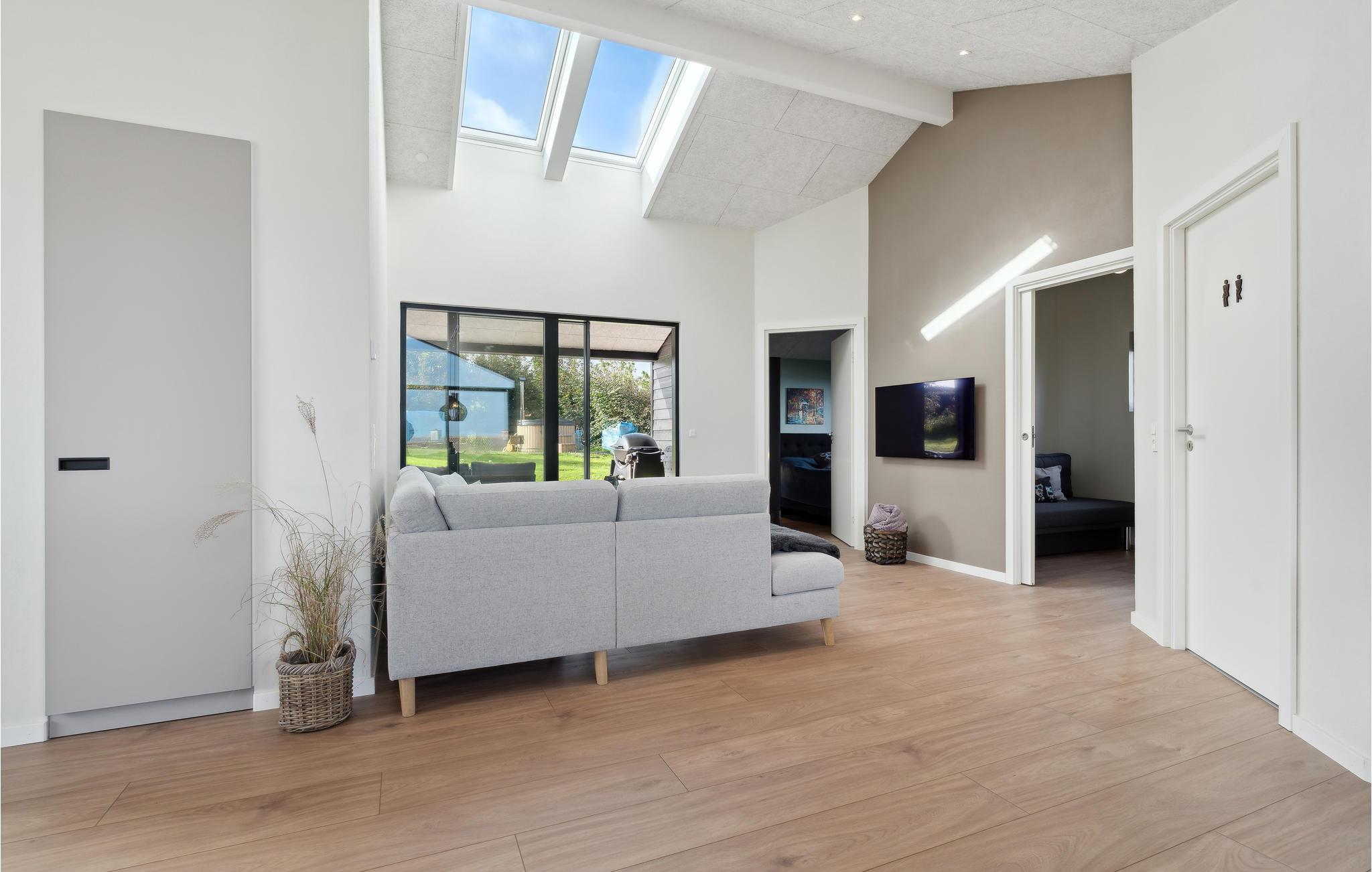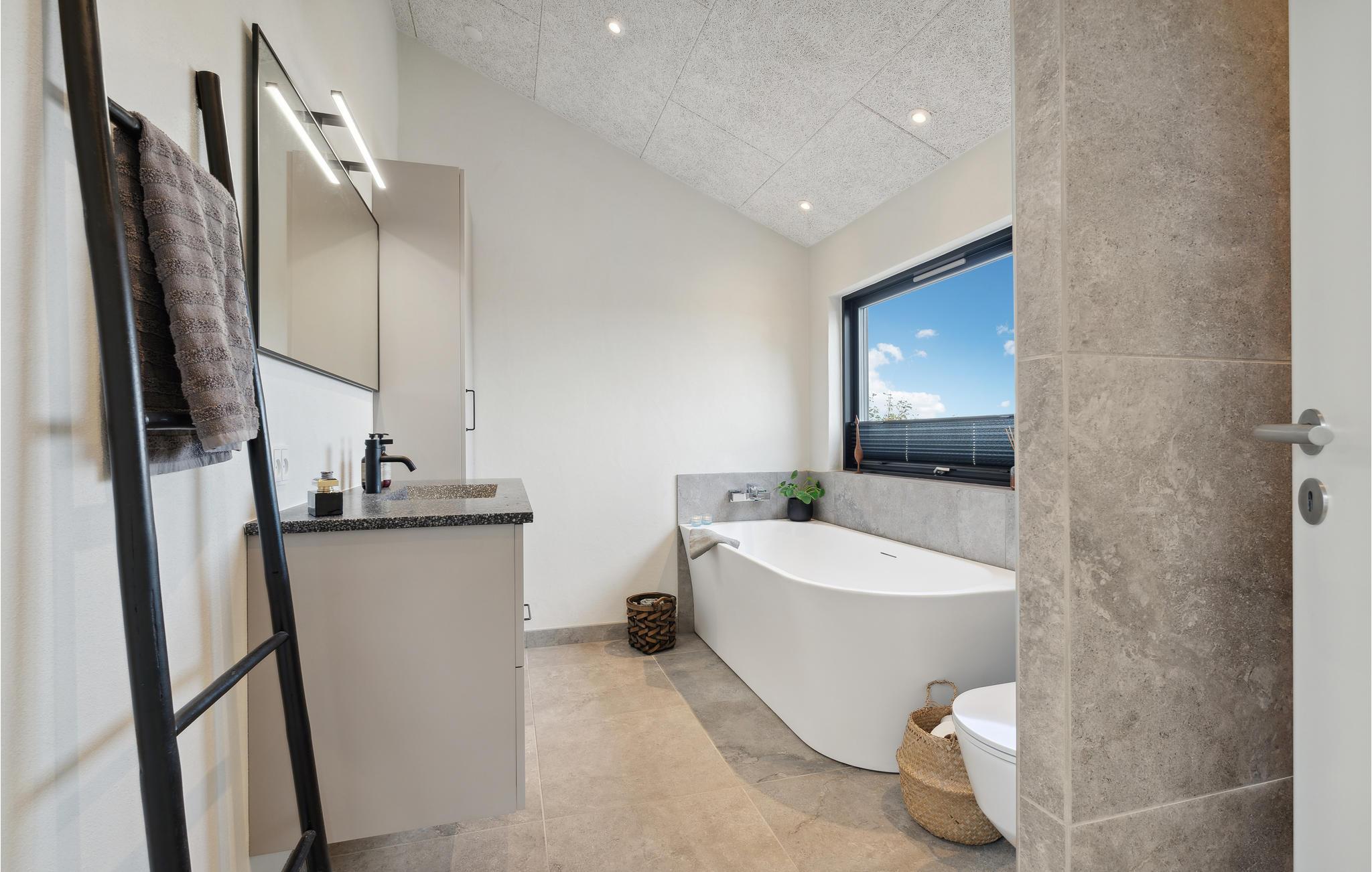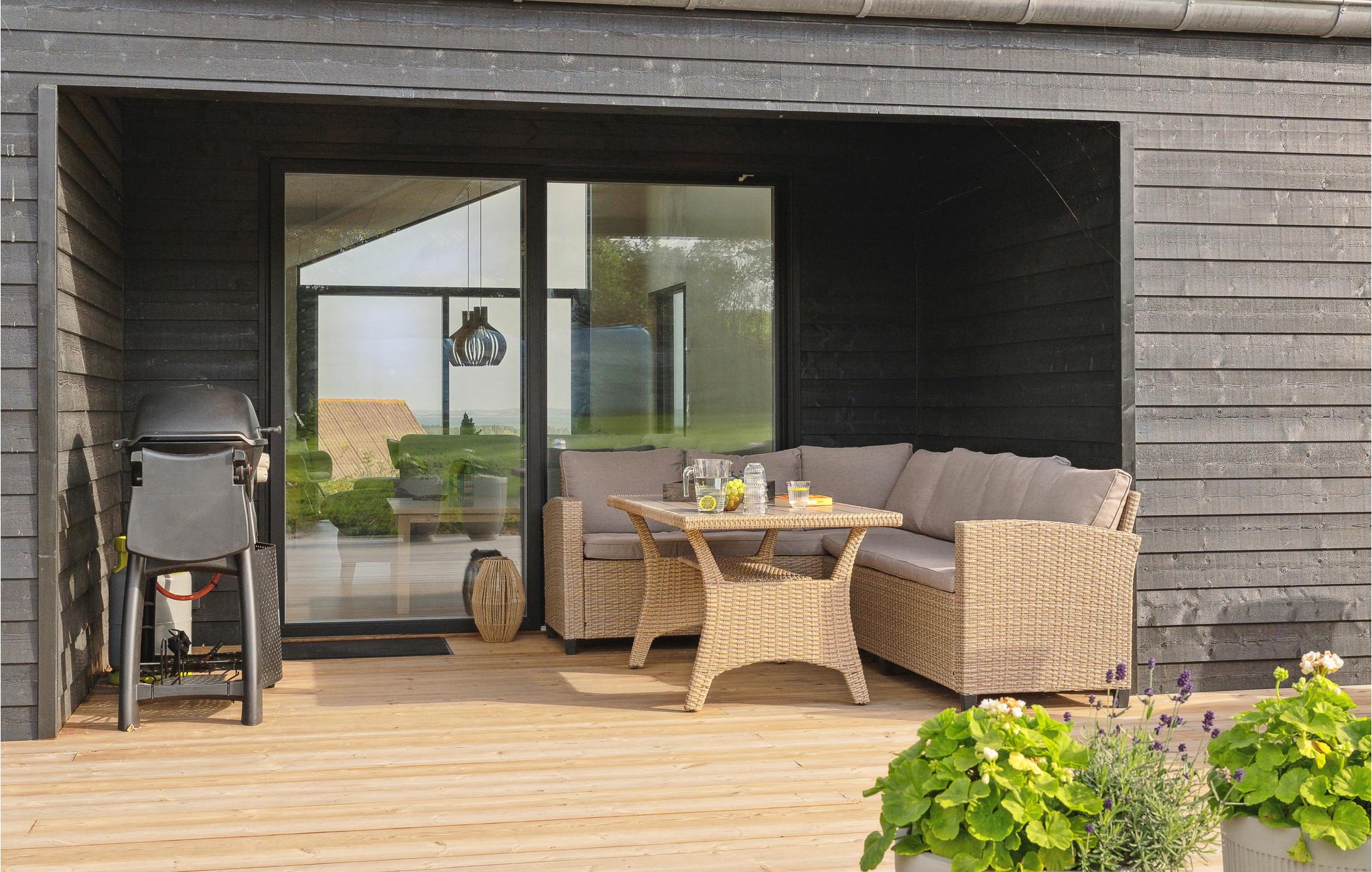 Nyd et skønt ophold i dette komfortable og smagfulde feriehus med en fantastisk udsigt fra spisestue og køkken. Med et gennemført moderne design, stilrene linjer, panoramavinduer fra gulv til loft og høje lofter med ovenlysvinduer er huset en oplevelse i sig selv. Det byder på en dejlig atmosfære og de ideelle rammer for en ferie med afslapning og skøn familietid. Spil dart i det tilstødende værelse eller nyd solen og panoramaudsigten på terrassen, der bekvemt snor sig rundt om huset. På den måde kan I altid finde en solrig eller skyggefuld plads, afhængigt af tidspunktet på dagen. Vildmarksbadet i haven er særligt behageligt, og her kan I rigtig slappe af.