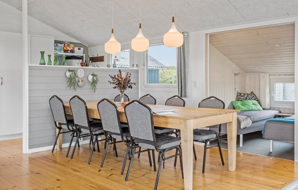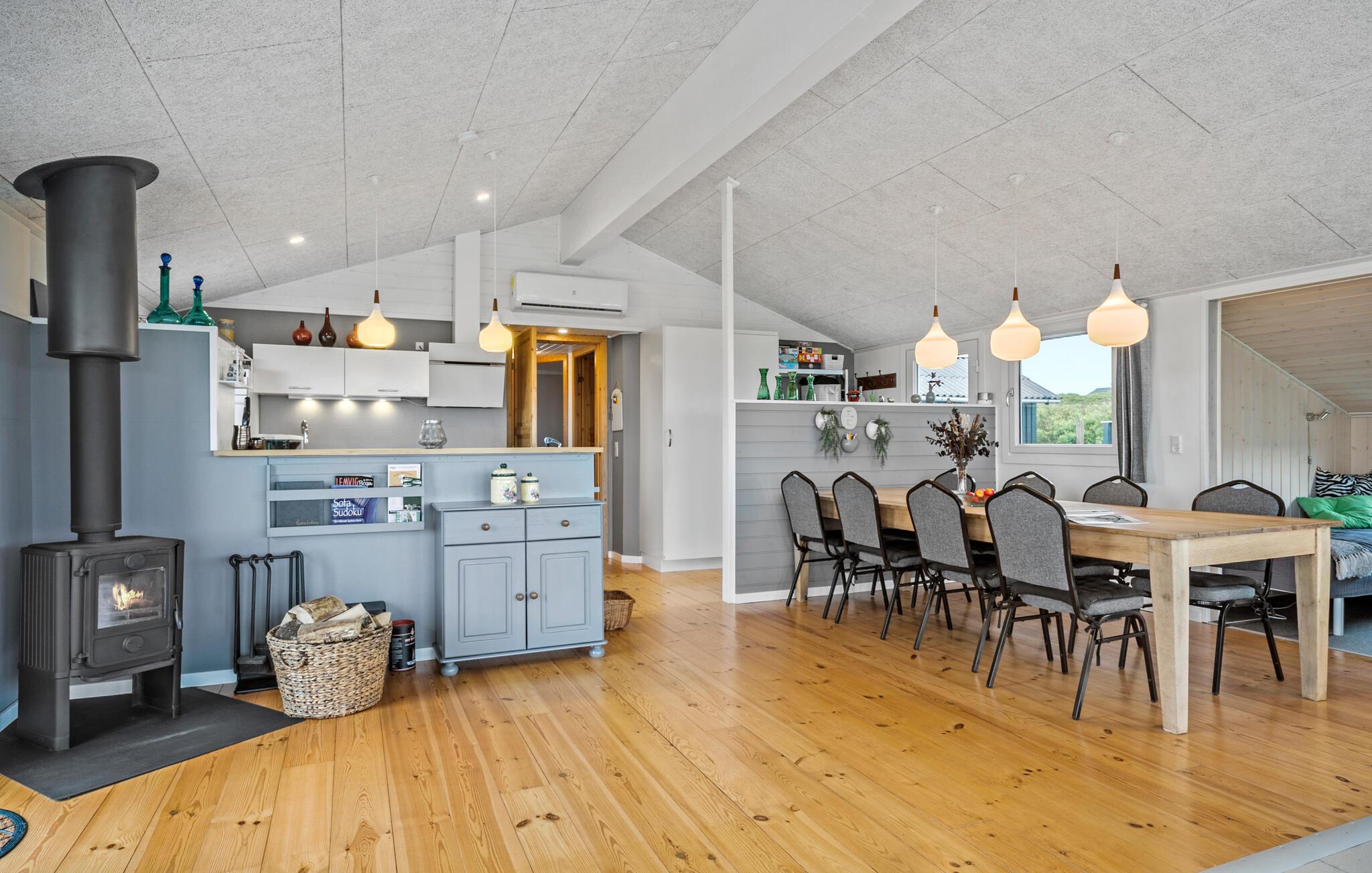 Velkommen til dette attraktive hus, der ligger i skønne omgivelser tæt på Nissum Bredning, og som danner rammen om årets bedste uger med dem, I holder af. Indretningen fremtræder lyst og luftigt med åbent boligkoncept, loft til kip og store vinduespartier, der lader dagslyset sive ind og samtidig giver en vidunderlig udsigt til markerne og helt ud til fjorden. Køkkenet er veludstyret, så lad blot familiens kokke tage sig god tid med madlavningen, mens andre dækker op ved spisebordet eller tænder op i brændeovnen på en gråvejrsdag. Efter aftensmaden kan I hive brætspillene frem eller rykke over i sofaen med snacks og en god film på tv'et, mens I lægger planer for de kommende dage.