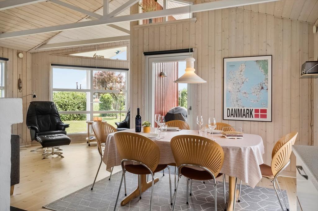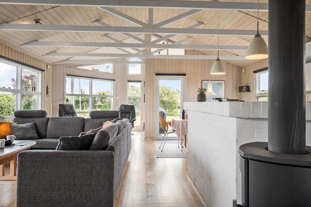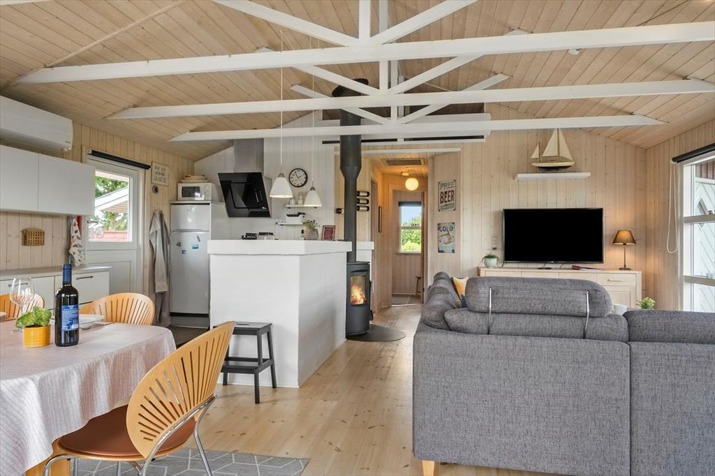 Når du træder ind i sommerhuset på Porsevej 115, fornemmer du med det samme en afslappet og hjemlig stemning. Her er tænkt på, at ferien skal kunne rumme både fælles oplevelser og stille stunder, og særligt stuen med brændeovn lægger op til netop det. Læn dig tilbage i sofaen med en god bog, mærk varmen fra flammerne eller saml hele familien til brætspil og snak, mens dagens eventyr fordøjes. Stuen ligger i åben forbindelse med køkkenet, så der er god mulighed for at være sammen om madlavningen – og for børnene er der plads til at lege og være med på sidelinjen. Alt i alt er sommerhusets indretning både enkel og hyggelig, så du hurtigt føler dig hjemme og kan finde ro i feriestemningen.