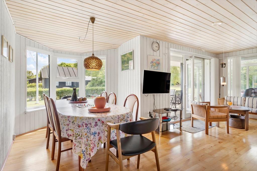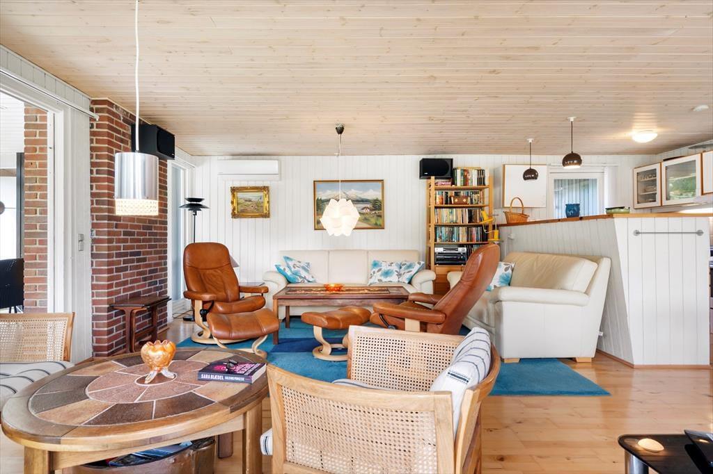 Indenfor i sommerhuset bliver du mødt af en lys og imødekommende stemning, hvor ferien med det samme føles i gang. Indretningen er enkel og hyggelig, og den åbne forbindelse mellem køkken og stue giver dig gode muligheder for samvær – hvad enten I laver mad, spiller kort eller bare slapper af sammen. Stuen indbyder til hygge på alle tider af året, og du finder hurtigt dig selv til rette med et tæppe i sofaen eller med en kop varm kakao ved spisebordet. Med plads til hele familien og en afslappet atmosfære, der emmer af ferie, er det nemt at finde roen – og glæden ved at være sammen uden hverdagens forstyrrelser.