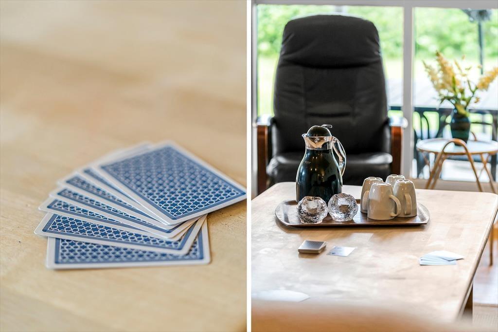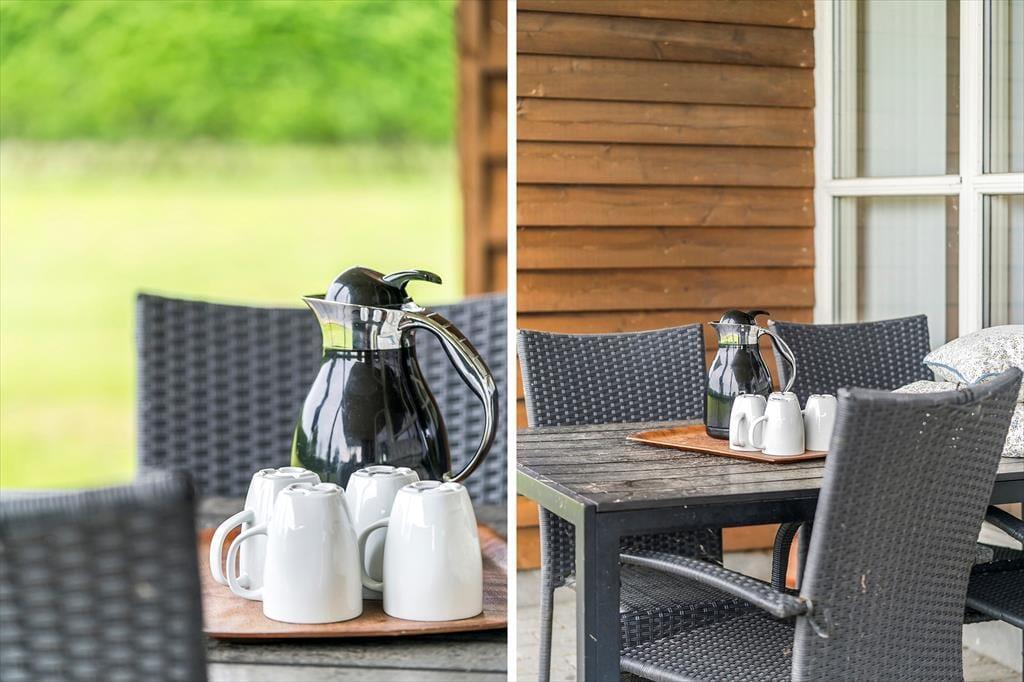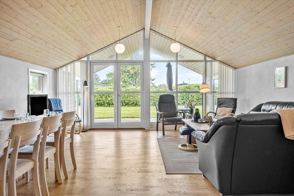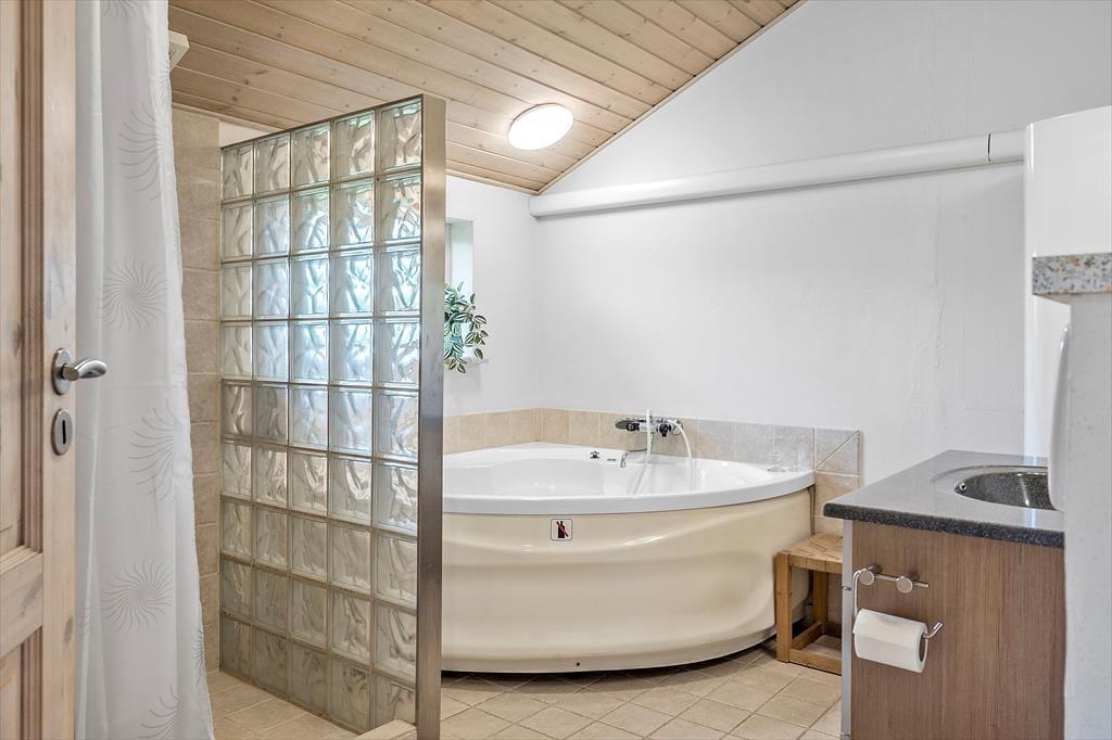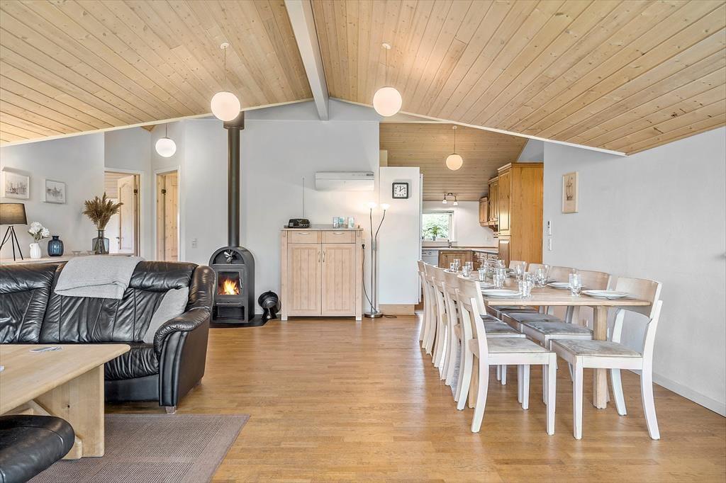 Indenfor i sommerhuset bliver du mødt af en lys og rummelig atmosfære, hvor det høje loft og de store vinduer skaber en dejlig, luftig fornemmelse. Den gennemførte indretning kombinerer moderne komfort med ægte sommerhushygge, og særligt brændeovnen er med til at give stuen en varm og indbydende stemning – perfekt til de stille aftener, hvor I samles i sofaen med kortspil og varme drikke. Køkken og opholdsrum ligger i åben forbindelse, så det er nemt at være sammen, uanset om I laver mad eller bare nyder hinandens selskab. Efter en lang dag ved stranden eller på tur i området, kan du lade kroppen slappe af i husets indendørs spa og sauna – en luksuriøs detalje, der forlænger følelsen af ferie og forkælelse.