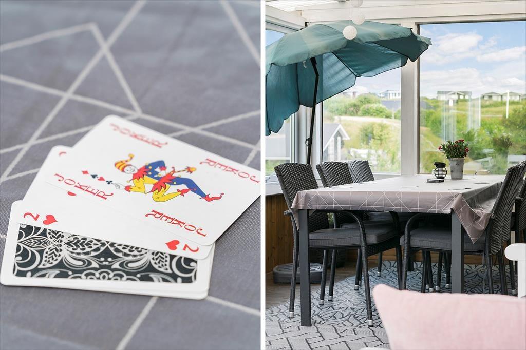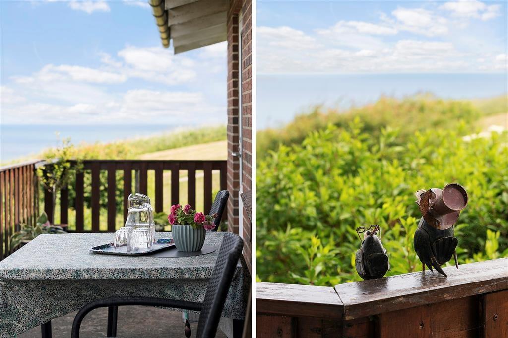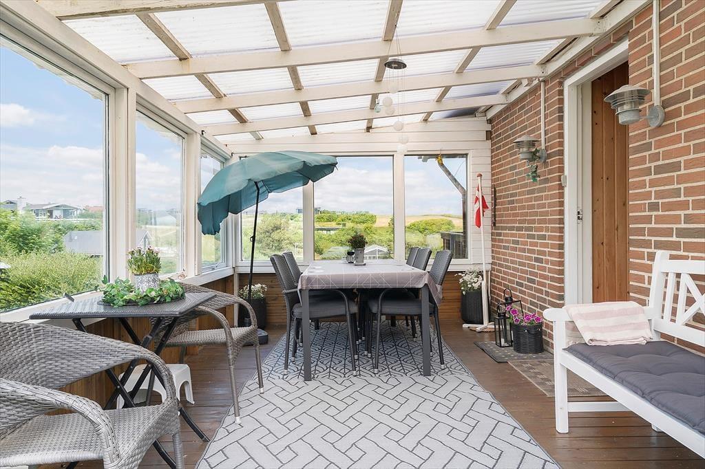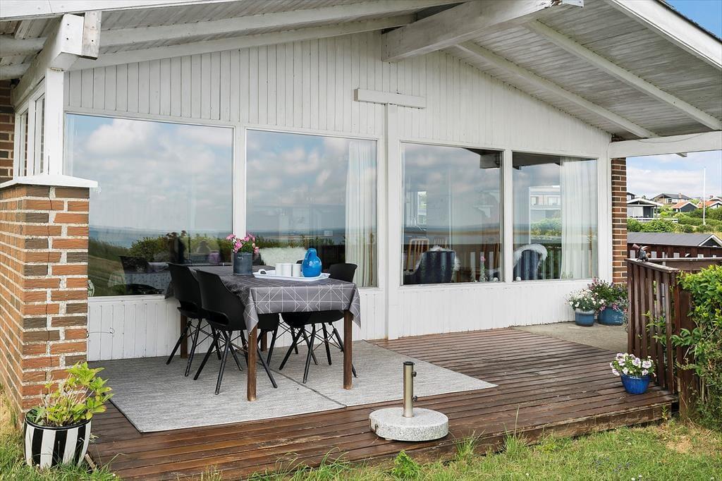 Sommerhusets placering tæt ved vandet kommer for alvor til sin ret, når du træder ud i det afskærmede terrasseområde. Her minder stemningen om en udestue – med læ og ly, men stadig med fri adgang til naturen og den friske fjordluft. Du kan sidde tørt og lunt med en kop te i hånden, selv når skyerne trækker ind, eller nyde dagens måltider under åben himmel, når solen kigger frem. Med fjorden som nærmeste nabo er det oplagt at tage en stille gåtur langs vandet, dyppe tæerne i Limfjordens klare vand eller blot sætte sig og følge bølgernes sagte rytme. Terrassens placering giver dig både privatliv og panorama, og det gør det let at koble helt fra – måske med en god bog, måske med et glas vin i solnedgangen.