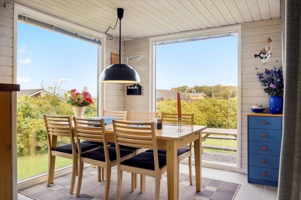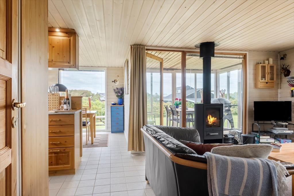 Sommerhuset er indrettet i en lys og venlig stil, hvor du straks føler dig hjemme. Stuen er husets naturlige samlingspunkt, og her kan I samles til spil, film og lange snakke, mens flammerne knitrer i brændeovnen og skaber en varm atmosfære. Fra stuen er der direkte adgang til den hyggelige udestue, hvor du kan nyde udsigten til haven, mens solens stråler luner bag ruderne – også på dage, hvor vinden rusker lidt udenfor. Køkkenet ligger i åben forbindelse med opholdsrummet, så feriens måltider kan tilberedes i selskab med resten af familien, og med flere gode soveværelser er der plads til, at alle kan finde sig til rette og slappe af efter en dag fuld af oplevelser.