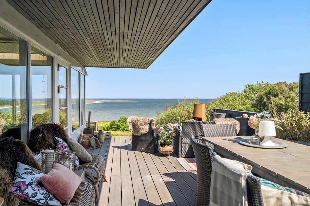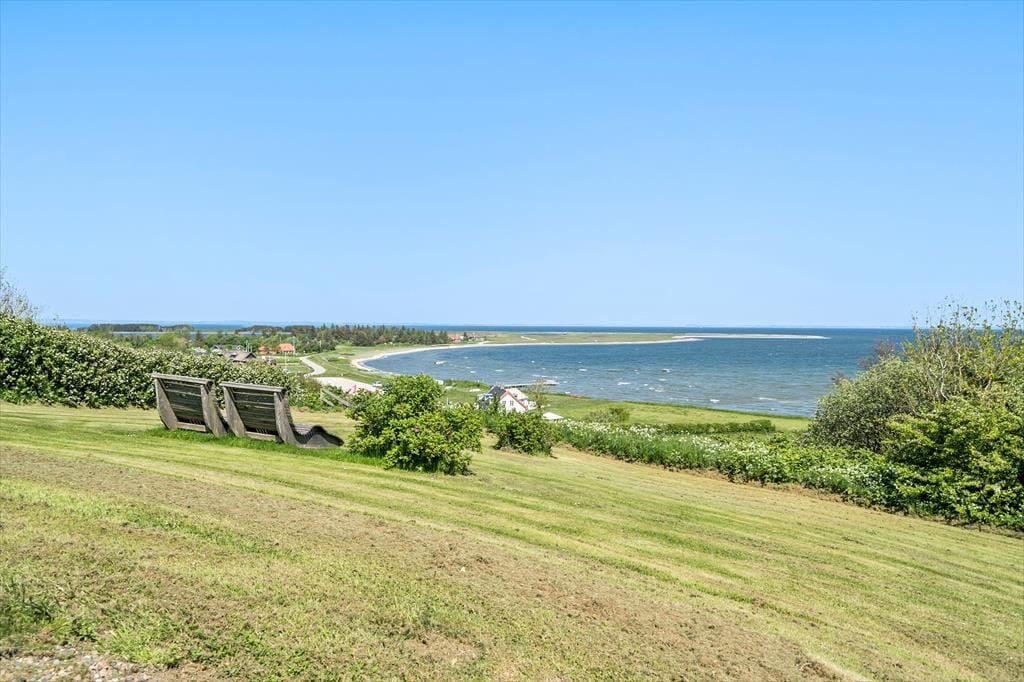 Sommerhuset ligger midt på en mere end 1500 m2 stor grund, der har en dejlig, skrånende græsplæne. Rundt om huset finder du flere terrasser, der giver dig og dine kære en perfekt ramme om driverlivet: Her er der lækre kvalitetshavemøbler at slå sig ned i, og med grillpejs, puder og andre hyggedetaljer er det tydeligt at se, at udelivet kan blive mindst lige så komfortabelt som de indendørs afslapningsstunder. Den sydøstvendte terrasse vil sandsynligvis blive din foretrukne, for når du sidder her, kan du dvæle ved fjordudsigten, mens du lytter til fuglesang og nyder solen.