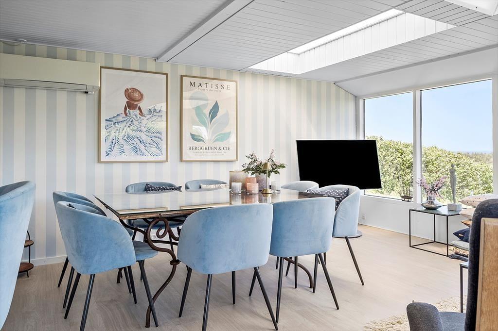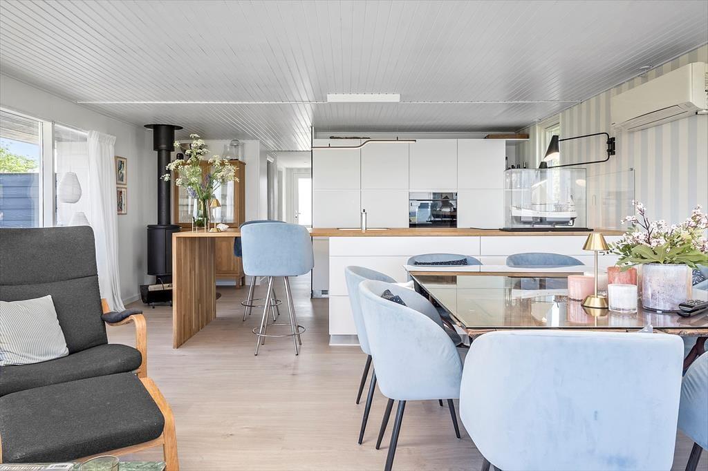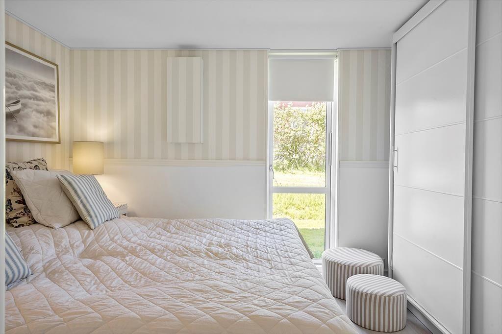Da sommerhuset blev moderniseret i 2024, lagde man vægt på at fylde rummene med stilfuldt interiør og lyse farvetoner, og resultatet er yderst vellykket, så det er en ren fornøjelse at opholde sig inden døre. Et lækkert køkken ligger i åben forbindelse med stuen, og her er det selvfølgelig ikke kun indretningen, men også den spektakulære fjordudsigt, der vil fange dit blik. De store vinduespartier inviterer landskabet indenfor såvel som dagslyset, og ovenlysvinduerne bidrager til det lette og luftige udtryk. Den gennemførte indretningsstil kan du også nyde på husets to soveværelser og endda på badeværelset, der har et lækkert rainshower i brusenichen. Få skridt fra hoveddøren finder du for øvrigt et anneks, så alt i alt er der sengepladser til seks personer.