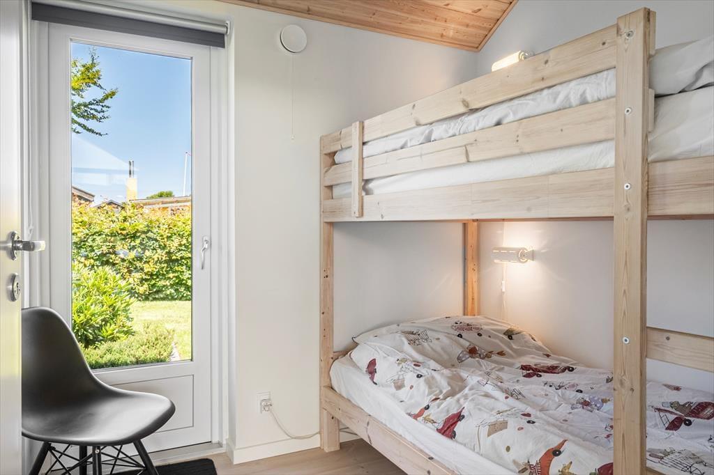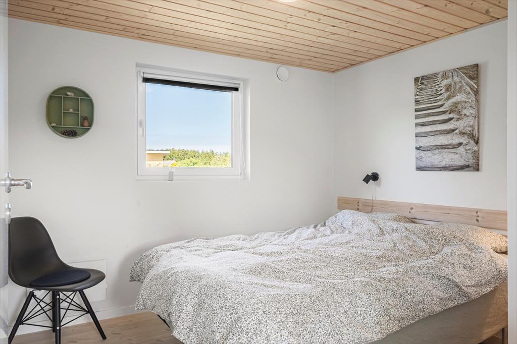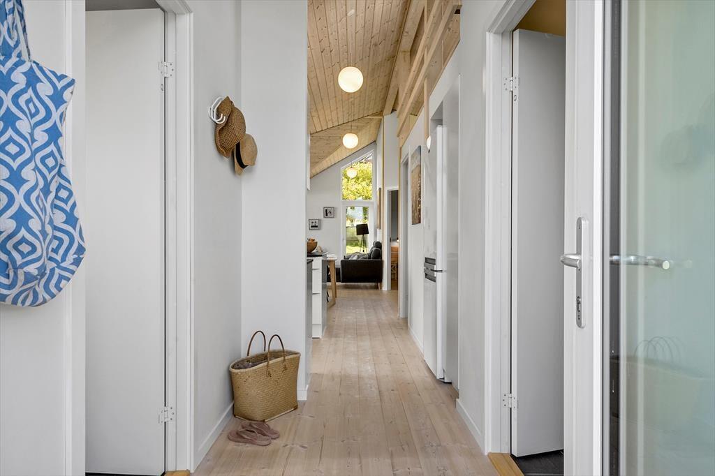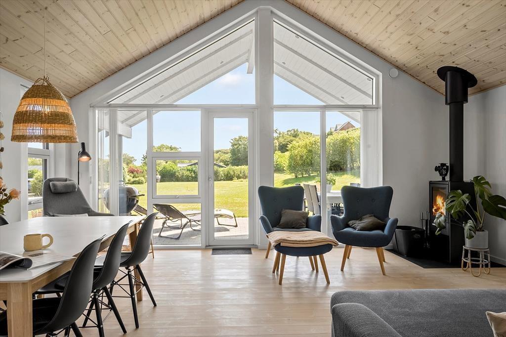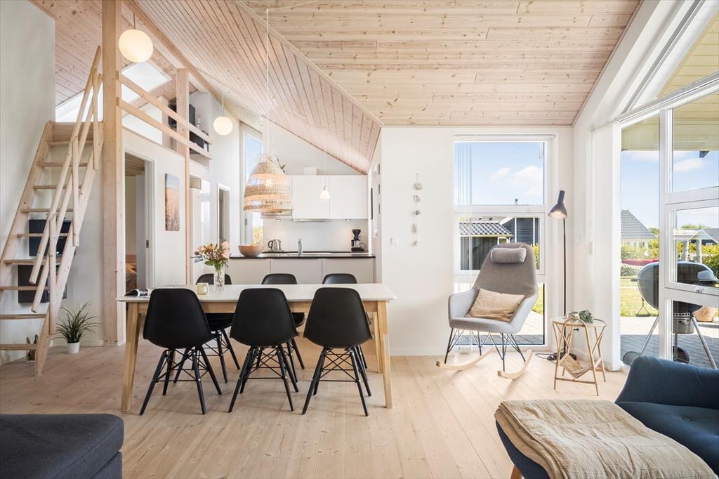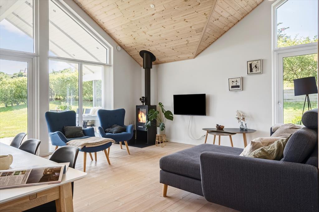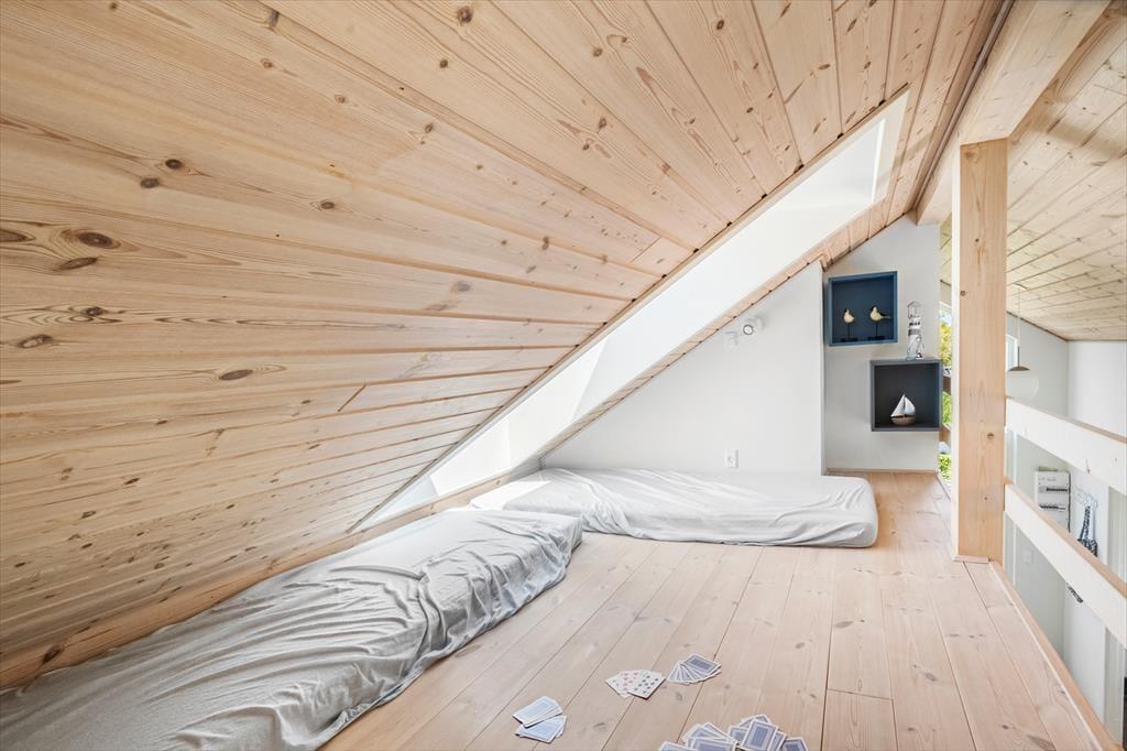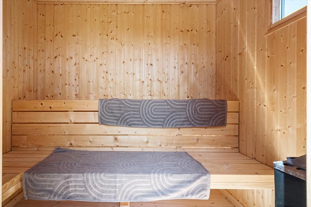 Indenfor møder du en lys og indbydende indretning, hvor alt er gennemtænkt for at skabe en afslappende og hjemlig atmosfære. Loft til kip og store vinduer giver opholdsrummet en dejlig rummelighed, og det åbne køkkenalrum indbyder til fælles madlavning og hyggelige timer omkring spisebordet. I stuen kan du smide benene op i sofaen og nyde varmen fra brændeovnen, mens flammerne knitrer i baggrunden – den perfekte stemning til en rolig ferieaften med kortspil, brætspil eller bare ro og fordybelse. Huset har en fin hems, som både børn og barnlige sjæle vil elske at kravle op på – det er et lille gemmested til leg og afslapning. Når du trænger til lidt ekstra velvære, kan du sætte kurs mod saunaen og mærke varmen løsne op i kroppen.