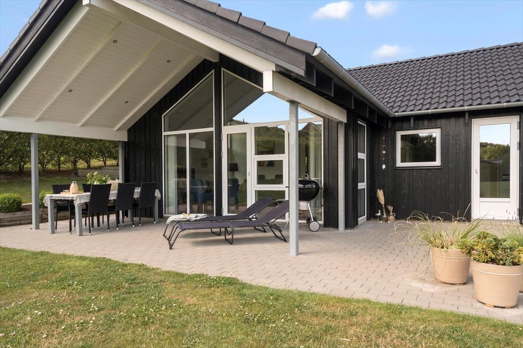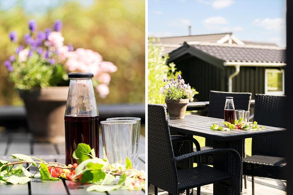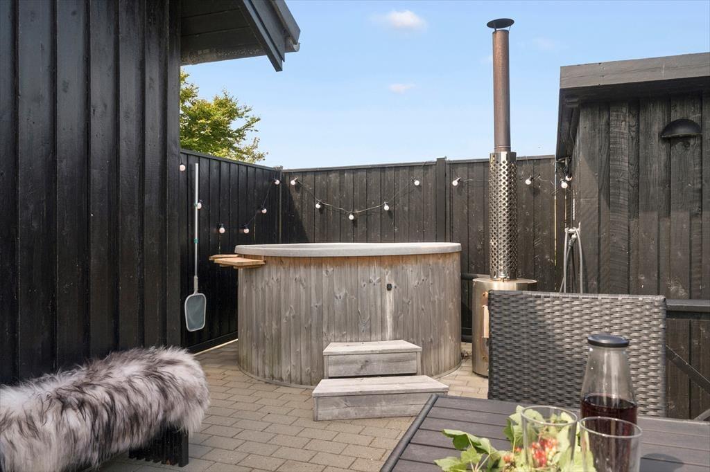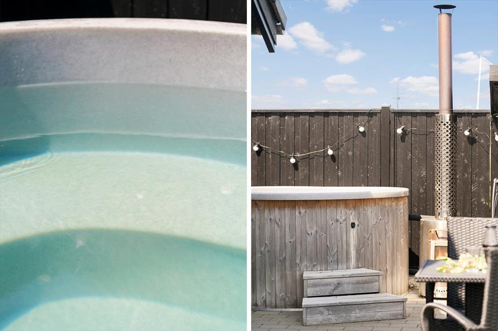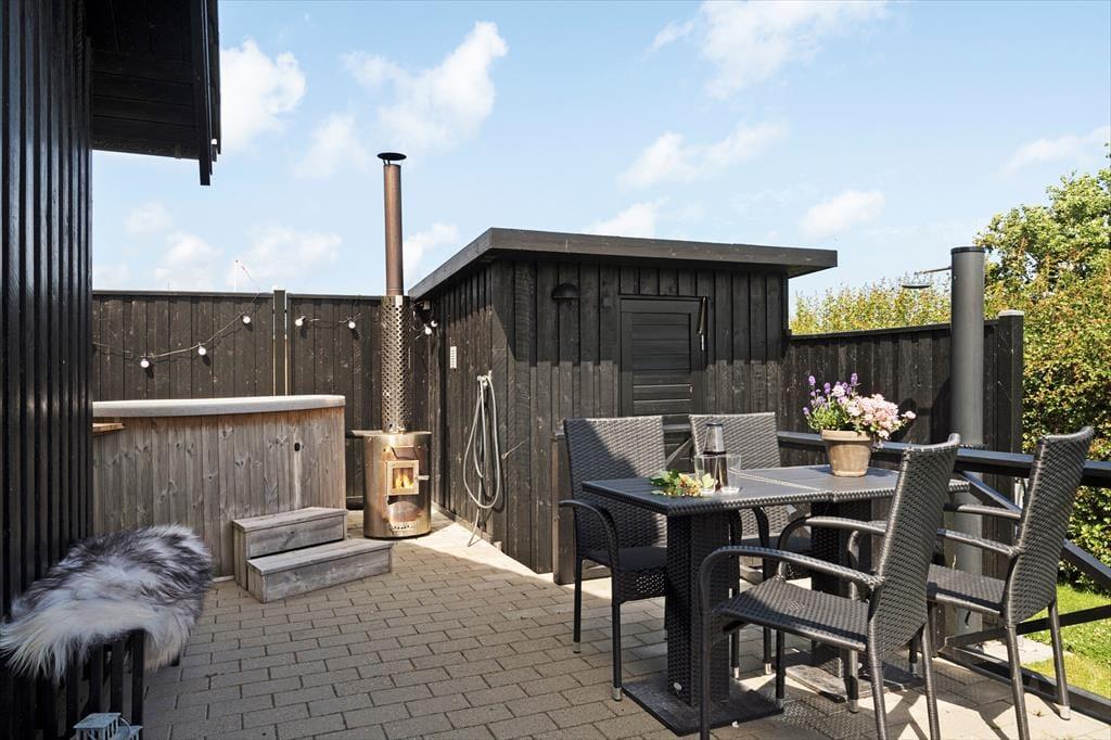 Terrassen udenfor fungerer som et ekstra opholdsrum i sommerhalvåret – og med både lækroge, spiseplads og selvfølgelig det indbydende vildmarksbad er her lagt op til lange dage i det fri. Nyd stilheden, mærk solen i ansigtet, og lad udsigten til den omkringliggende natur gøre resten. Her er masser af plads til, at børnene kan lege på græsset, og hvis I får lyst til at tænde op i grillen og lave aftensmad under åben himmel, er der intet, der forstyrrer den afslappede feriestemning. Når mørket falder på, og luften bliver kølig, er det ren luksus at lade dagens oplevelser synke ind, mens du sidder i det varme vildmarksbad og kigger op på stjernerne.