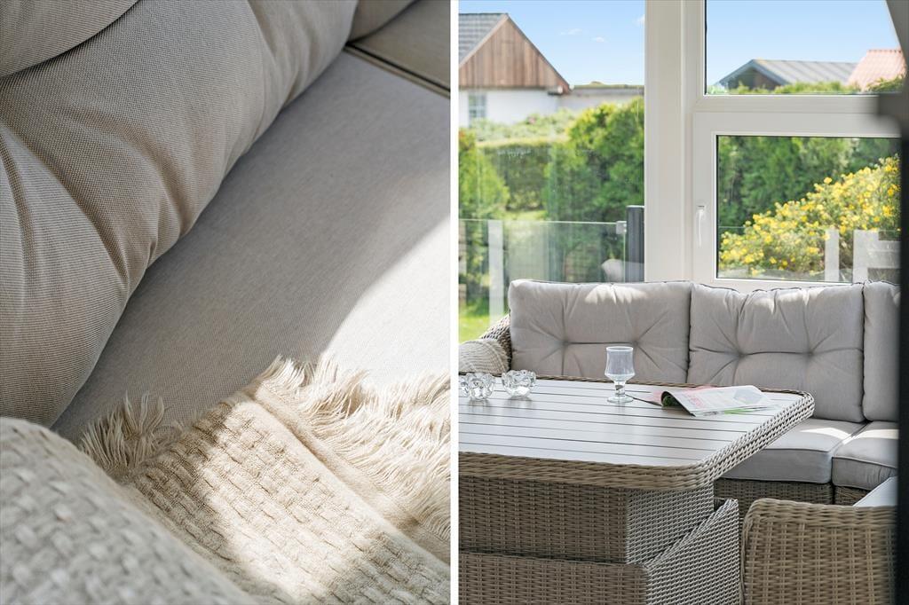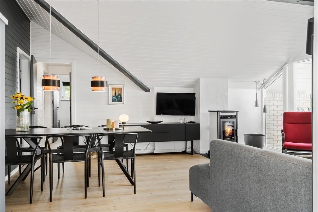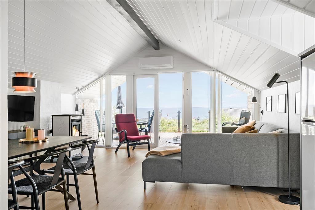 Indendørs venter en lys og indbydende bolig, hvor stemningen hurtigt indfinder sig. Indretningen er moderne og samtidig hyggelig, så du både får det komfortable og det hjemlige med i feriekufferten. Det centrale opholdsrum er lyst og åbent, og herfra kan du nyde den fantastiske udsigt gennem de store vinduer, der samtidig lukker et skønt dagslys ind. Det åbne køkken og alrummet danner rammen om samvær, fælles madlavning og nærvær ved spisebordet, mens stuen er det oplagte sted at finde ro med en god bog, en kop kaffe eller brætspil med børnene. Udestuen er en ekstra bonus – her kan du sidde lunt og tørt og nyde udsigten i al slags vejr. Hele indretningen er præget af lethed, og det føles nemt at slappe af, lige fra du træder ind ad døren.
