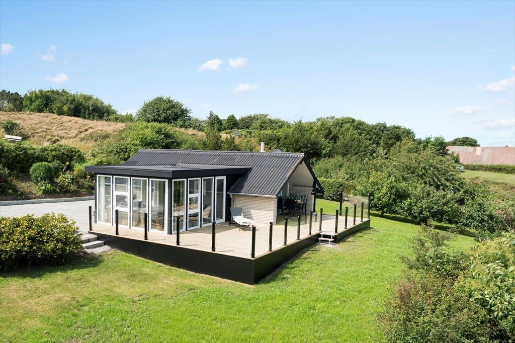 Skovstjernevej 57 i Gjellerodde er et rigtig godt bud, hvis du drømmer om en ferie, hvor natur, ro og udsigt går op i en højere enhed. Det moderne og velholdte sommerhus ligger på en dejligt kuperet grund, og både fra stuen og udestuen er der direkte udgang til terrassen, hvor du kan nyde udsigten over det åbne landskab og glimt af Limfjorden. Her bor du midt i et fredeligt sommerhusområde med kort afstand til strand, stisystemer og en af områdets bedste udsigtspladser.