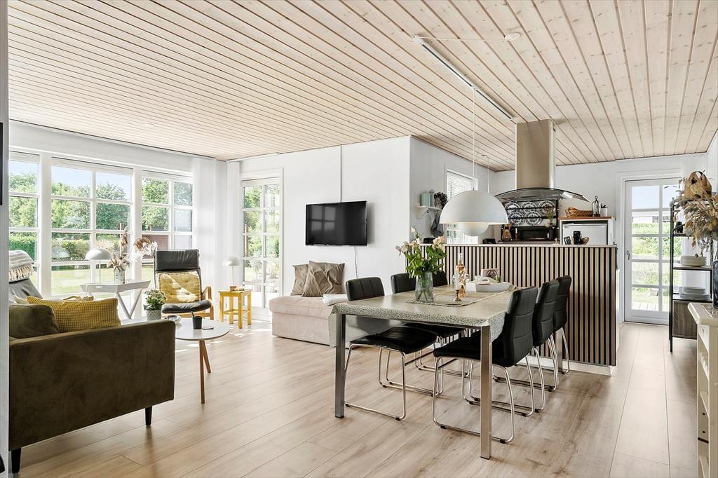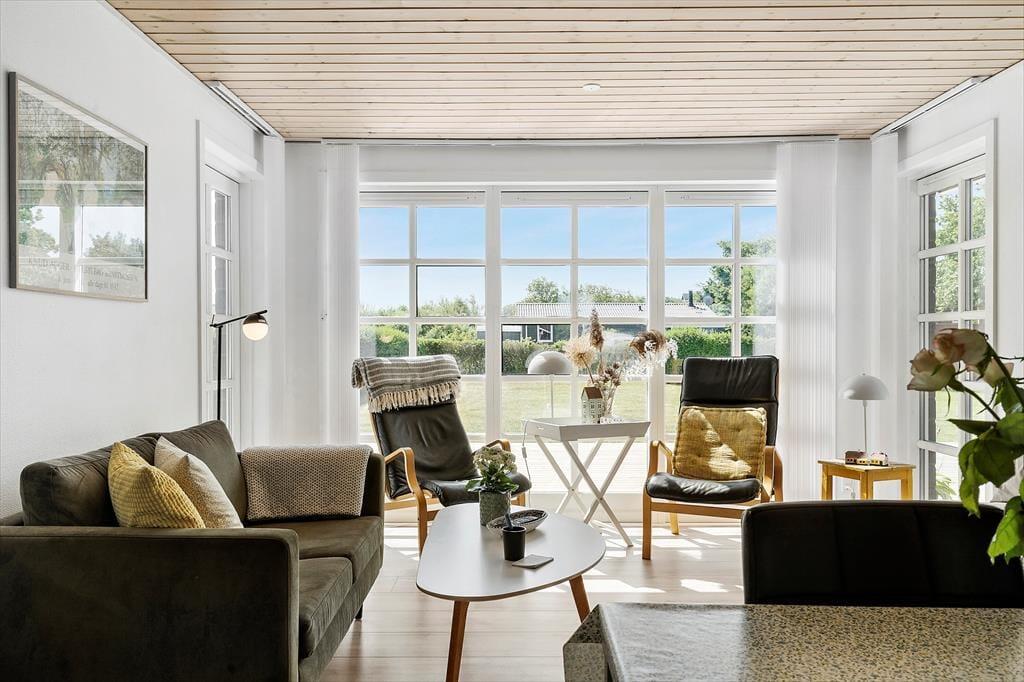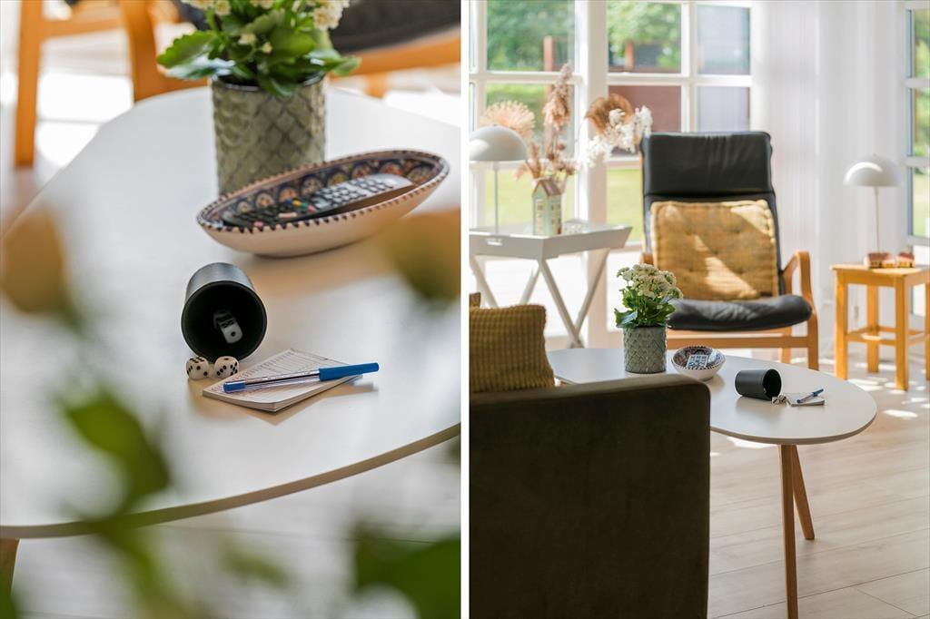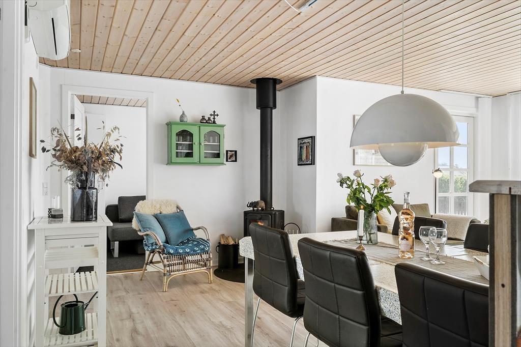 Inde i huset mødes du af en lys og åben atmosfære, hvor især stuen imponerer med store vinduespartier, der lader lyset strømme ind og skaber en let og behagelig stemning. Indretningen er enkel og hyggelig, og her får du nemt følelsen af, at ferien for alvor er begyndt. Brændeovnen står klar til at sprede varme og hygge, når aftenerne bliver kølige – perfekt til en rolig stund i sofaen med en kop te eller en god bog. Stue og køkken ligger i åben forbindelse, hvilket gør det nemt at være sammen, uanset om der bliver lavet mad, spillet spil eller blot slappet af i fællesskab. Det er et sted, hvor både par, venner og familier hurtigt vil føle sig hjemme.