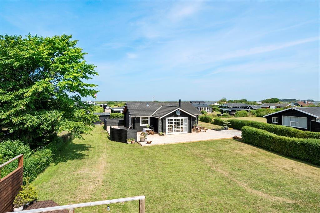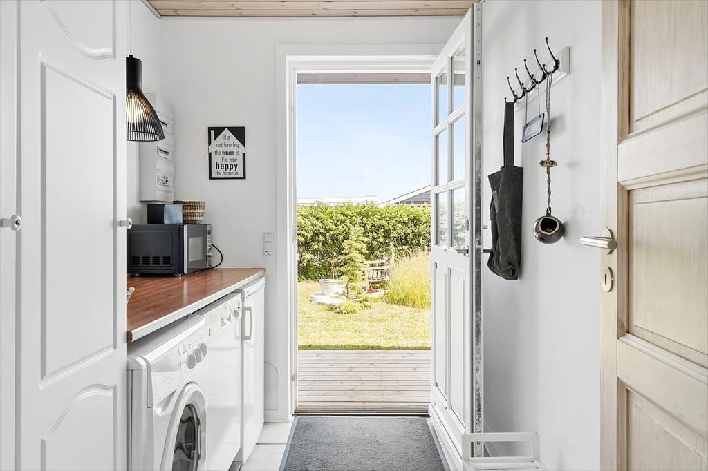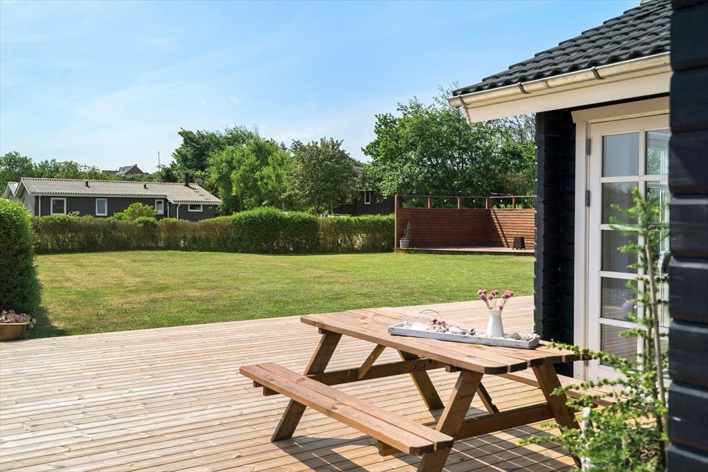 Udelivet på Porsevej 103 er præcis, som det skal være på en afslappende ferie på Gjellerodde. Den rummelige træterrasse danner rammen om feriens måltider i det fri, afslappende stunder i liggestolen og måske en aften med grill og solnedgang i horisonten. Her kan du nyde sommerdage med sol på næsen og fuglekvidder i baggrunden, mens børnene leger i haven, og du selv får et velfortjent hvil. Terrassen har flere hyggelige kroge, hvor du kan finde læ og ro, og placeringen bare 250 meter fra stranden gør det nemt at tage håndklædet over skulderen og gå en tur til fjorden. Det hele er lige ved hånden, og det er netop det, der gør sommerhuslivet på Porsevej så dejligt ukompliceret.