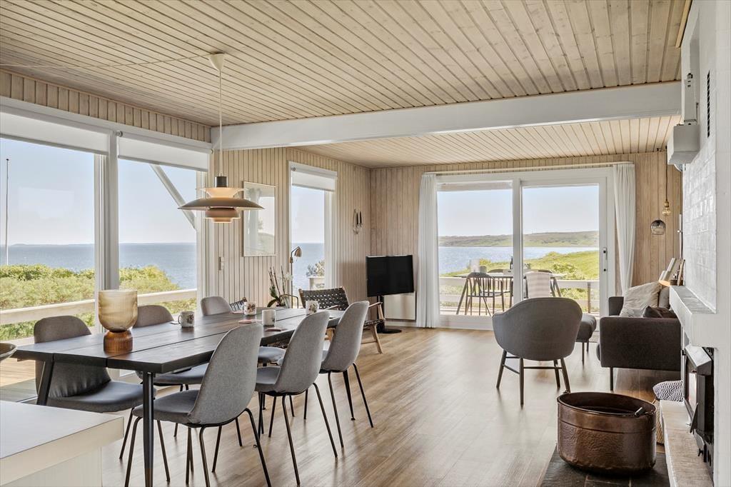 Når du træder ind i sommerhuset på Violvej 19, bliver du straks mødt af det naturlige lys, der strømmer ind gennem vinduerne og spejler sig i de lyse vægge og lofter. Stemningen er imødekommende og enkel – præcis som man håber på, når ferien skal være afslappet og nede på jorden. Det store opholdsrum udgør hjertet af huset, hvor stue og køkken flyder naturligt sammen, og hvor du kan samles med familien over morgenkaffen, spillekort eller en god samtale i sofaen, mens blikket glider ud over vandet. Her kan du vågne til udsigten over fjorden og falde i søvn med roen, der breder sig i rummene. Indretningen er harmonisk og funktionel – og vigtigst af alt: Der er en følelse af hjem.
