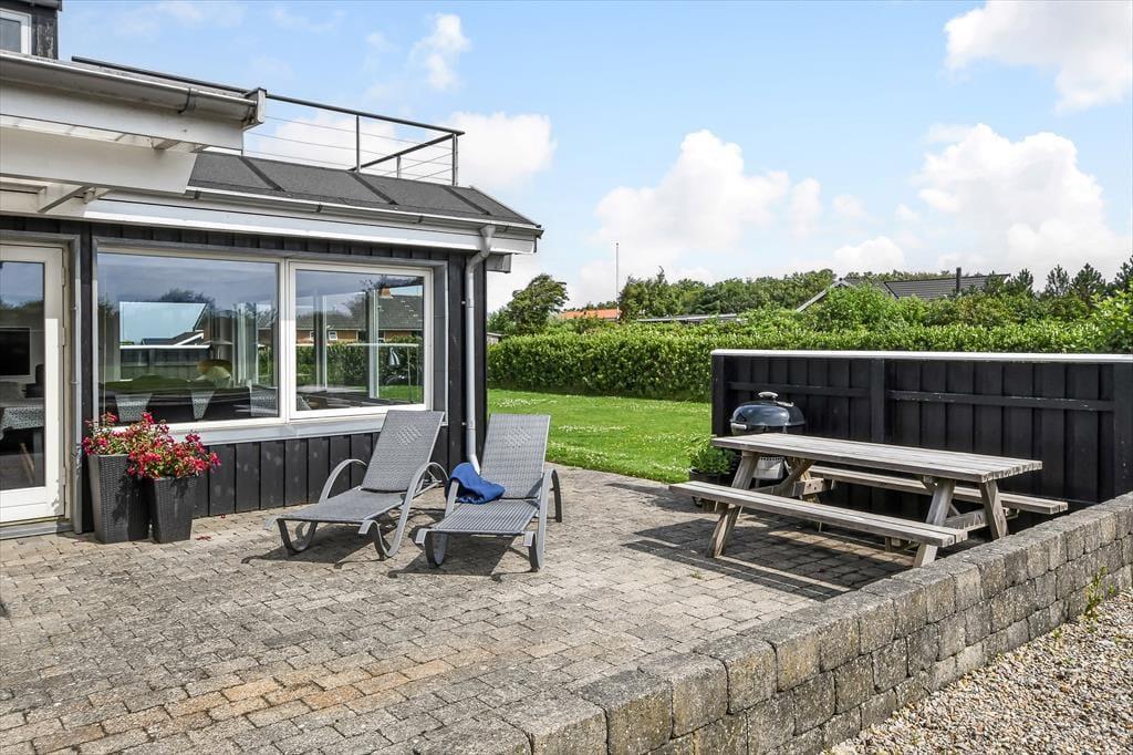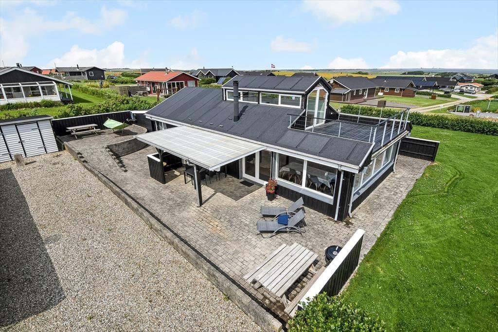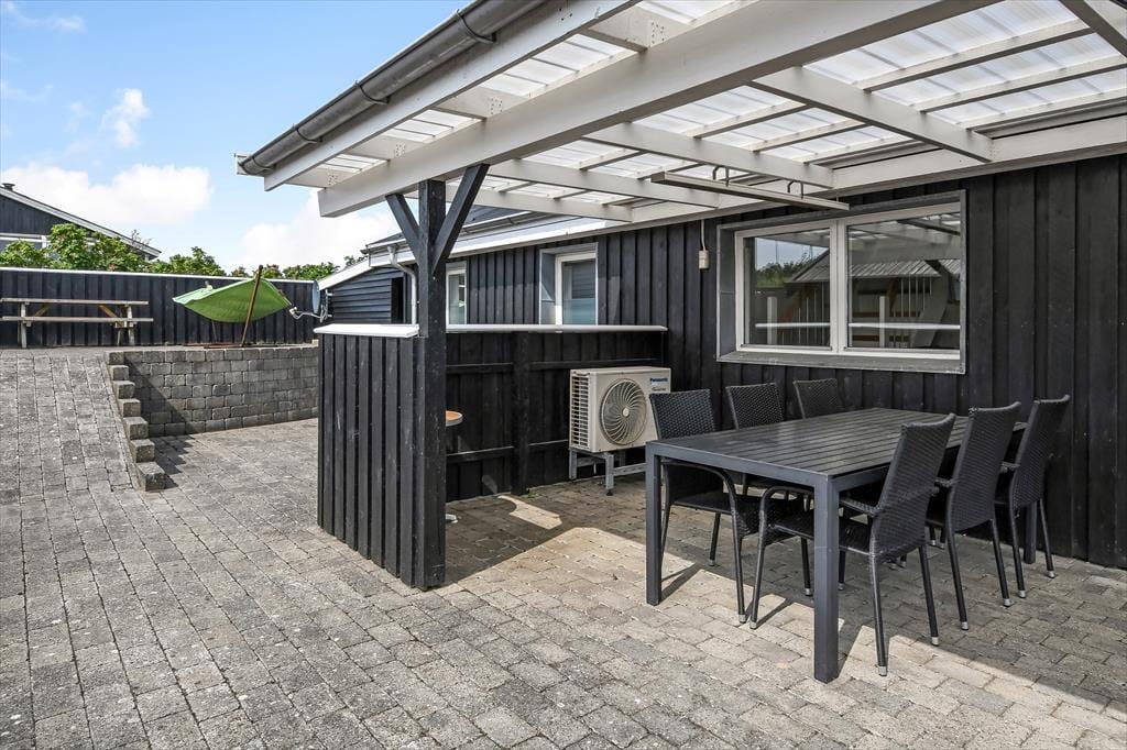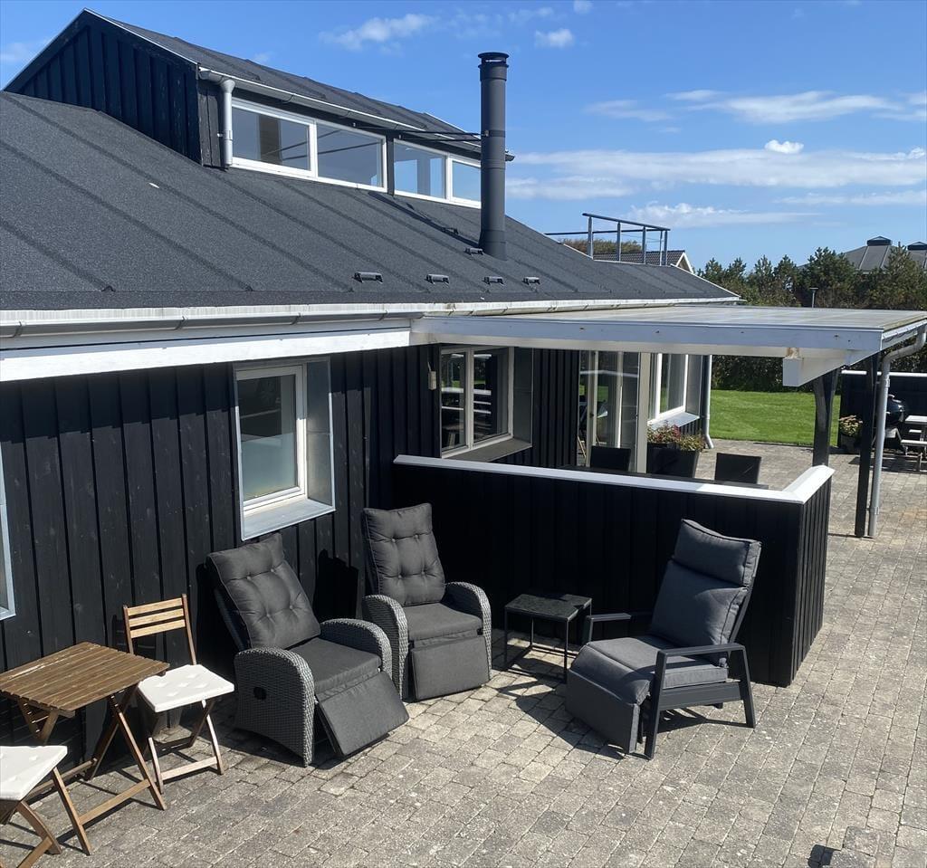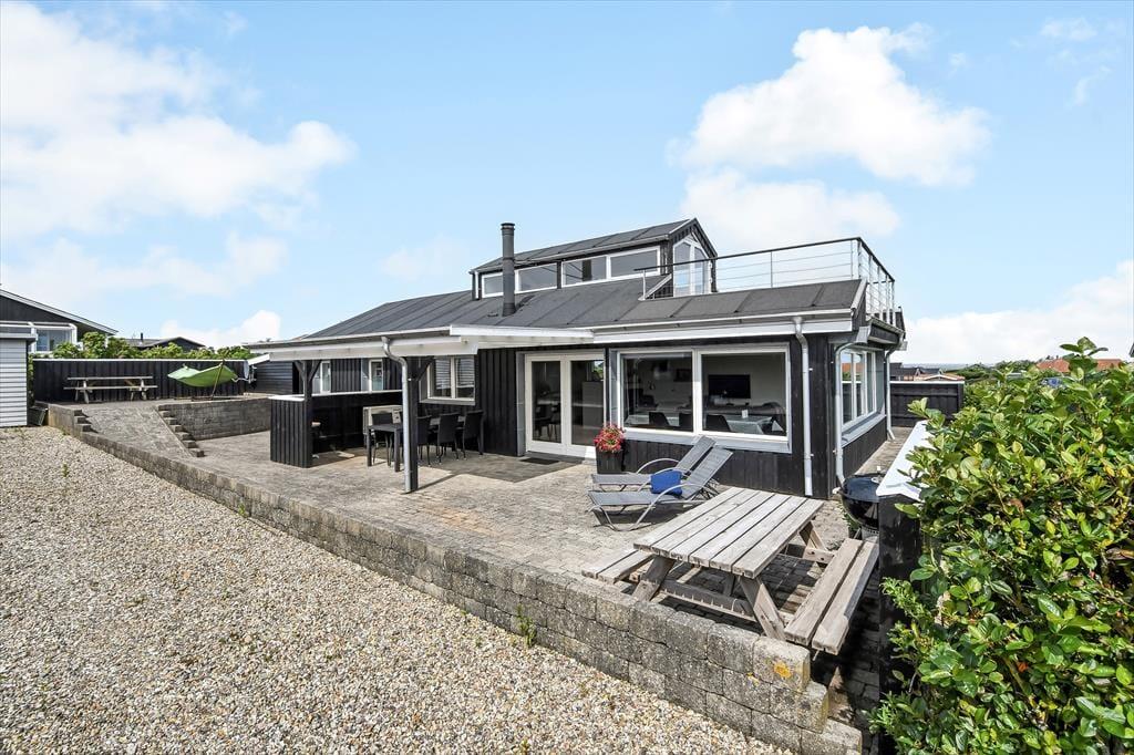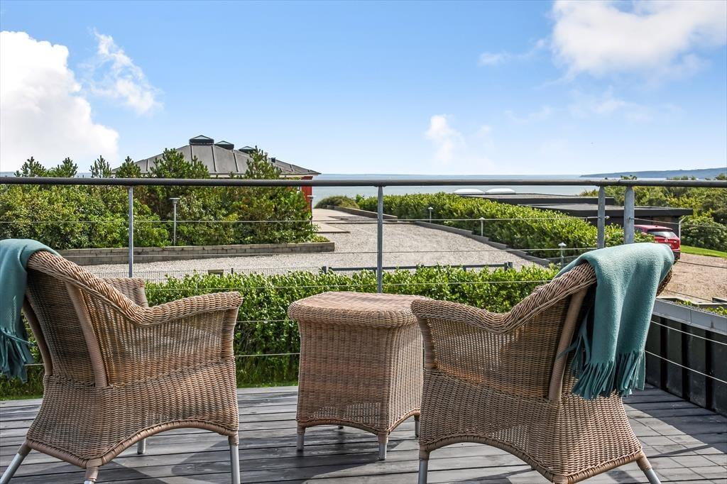Udenfor fortsætter oplevelsen – og bliver kun bedre. Fra huset kan du gå direkte ud på skønne terrasseområder, hvor du altid kan finde en plads i solen eller skyggen alt efter behov. Højdepunktet er dog den velplacerede tagterrasse, hvor udsigten over fjorden for alvor folder sig ud. Her kan du nyde morgenkaffen i stilhed eller runde dagen af med et glas vin i det sidste sollys. Haven omkring huset er grøn og enkel, og den høje placering giver en helt særlig ro – som skabt til at trække vejret dybt og finde roen. Har du hunden med, er det let at slippe den løs i snor og tage en tur gennem området – måske endda hele vejen ned til stranden for en frisk dukkert eller en stille gåtur langs vandet.