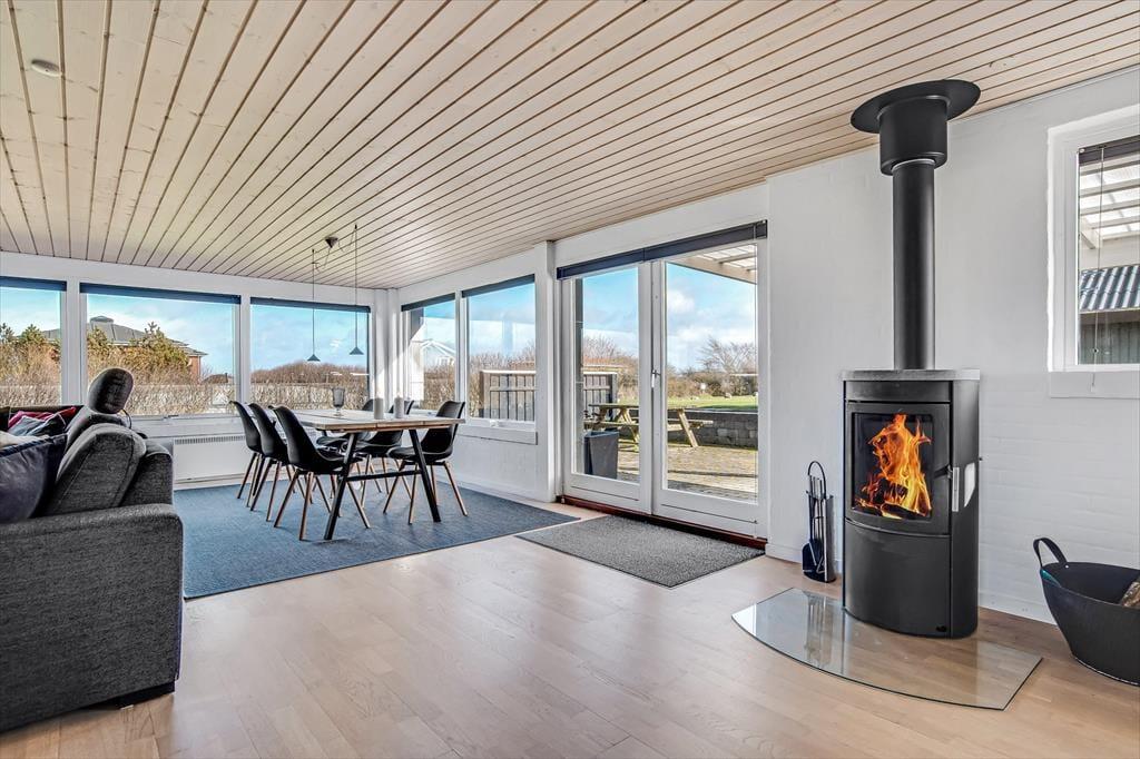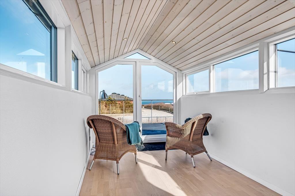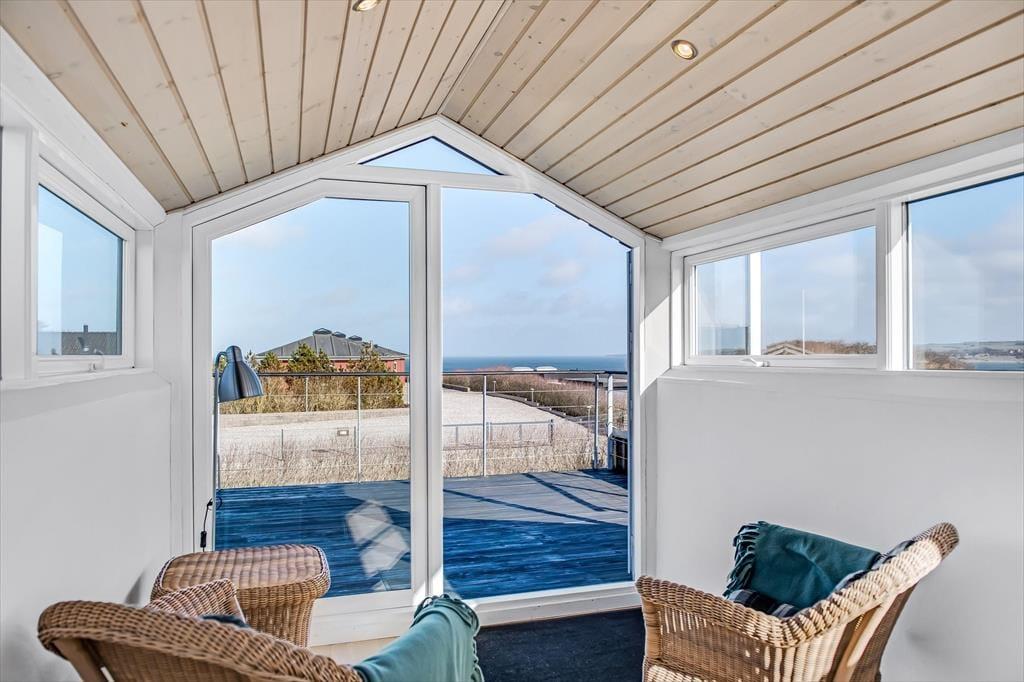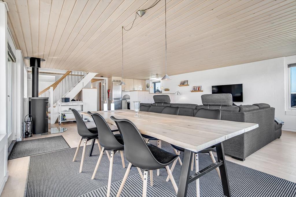 Det første, der møder dig, når du træder ind i sommerhuset på Myntevej 30, er lyset og rummeligheden. Huset breder sig over to plan og har en spændende og funktionel indretning, hvor udsigten hele tiden spiller med – store vinduespartier og opholdsrum i forskellige niveauer sørger for, at du næsten uanset hvor du befinder dig, kan nyde fjordens blå flade i det fjerne. I det åbne køkken- og stueområde er der god plads til både hyggelige måltider og afslapning, og her føles det naturligt at samle sig omkring samtaler, madlavning eller spil på en rolig feriedag. Huset har også en hems, som børnene hurtigt vil tage til sig som et fristed til leg og hygge. Her er en rar og uformel stemning, som gør det nemt at falde i feriemode fra første dag.