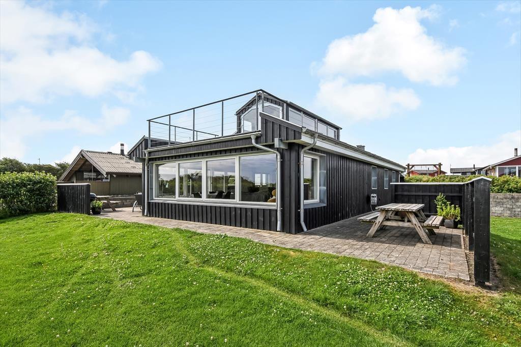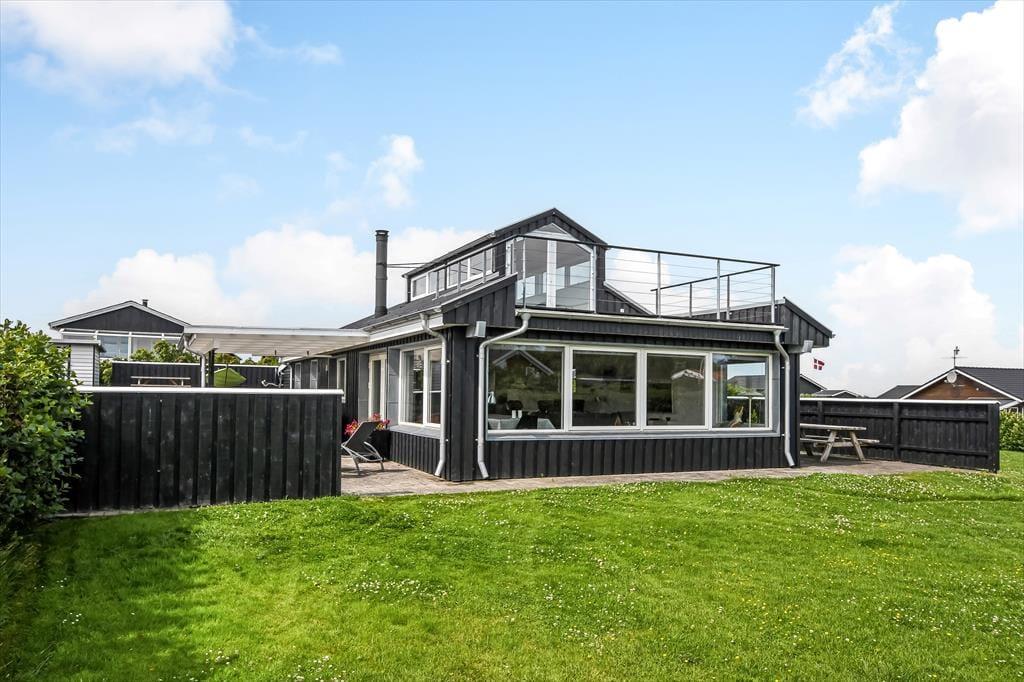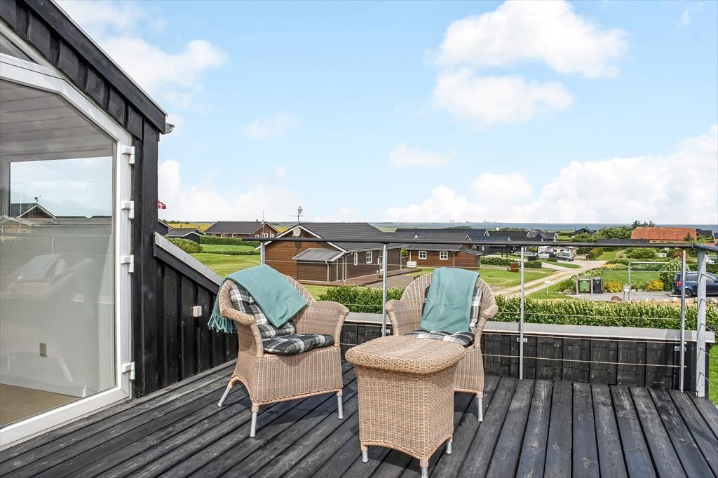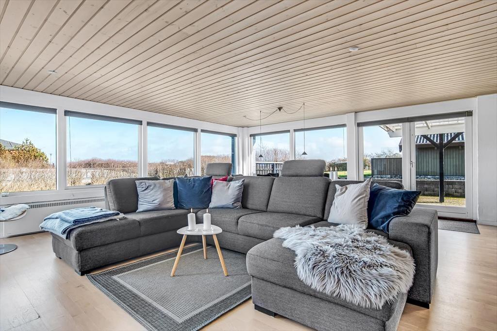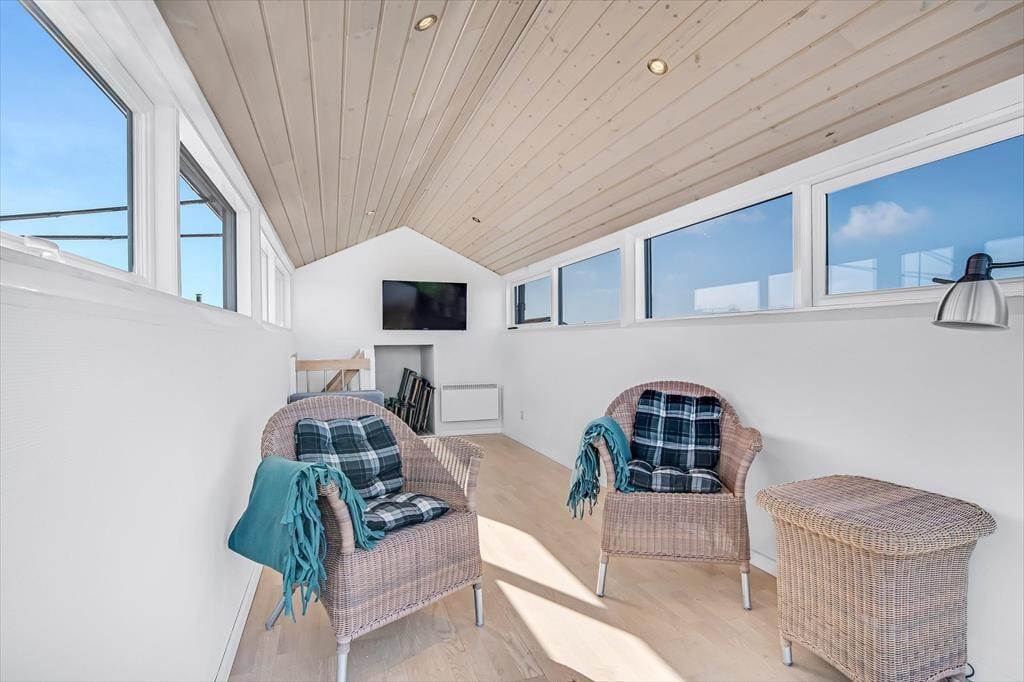 Det første, der møder dig, når du træder ind i sommerhuset på Myntevej 30, er lyset og rummeligheden. Huset breder sig over to plan og har en spændende og funktionel indretning, hvor udsigten hele tiden spiller med – store vinduespartier og opholdsrum i forskellige niveauer sørger for, at du næsten uanset hvor du befinder dig, kan nyde fjordens blå flade i det fjerne. I det åbne køkken- og stueområde er der god plads til både hyggelige måltider og afslapning, og her føles det naturligt at samle sig omkring samtaler, madlavning eller spil på en rolig feriedag. Huset har også en hems, som børnene hurtigt vil tage til sig som et fristed til leg og hygge. Her er en rar og uformel stemning, som gør det nemt at falde i feriemode fra første dag.