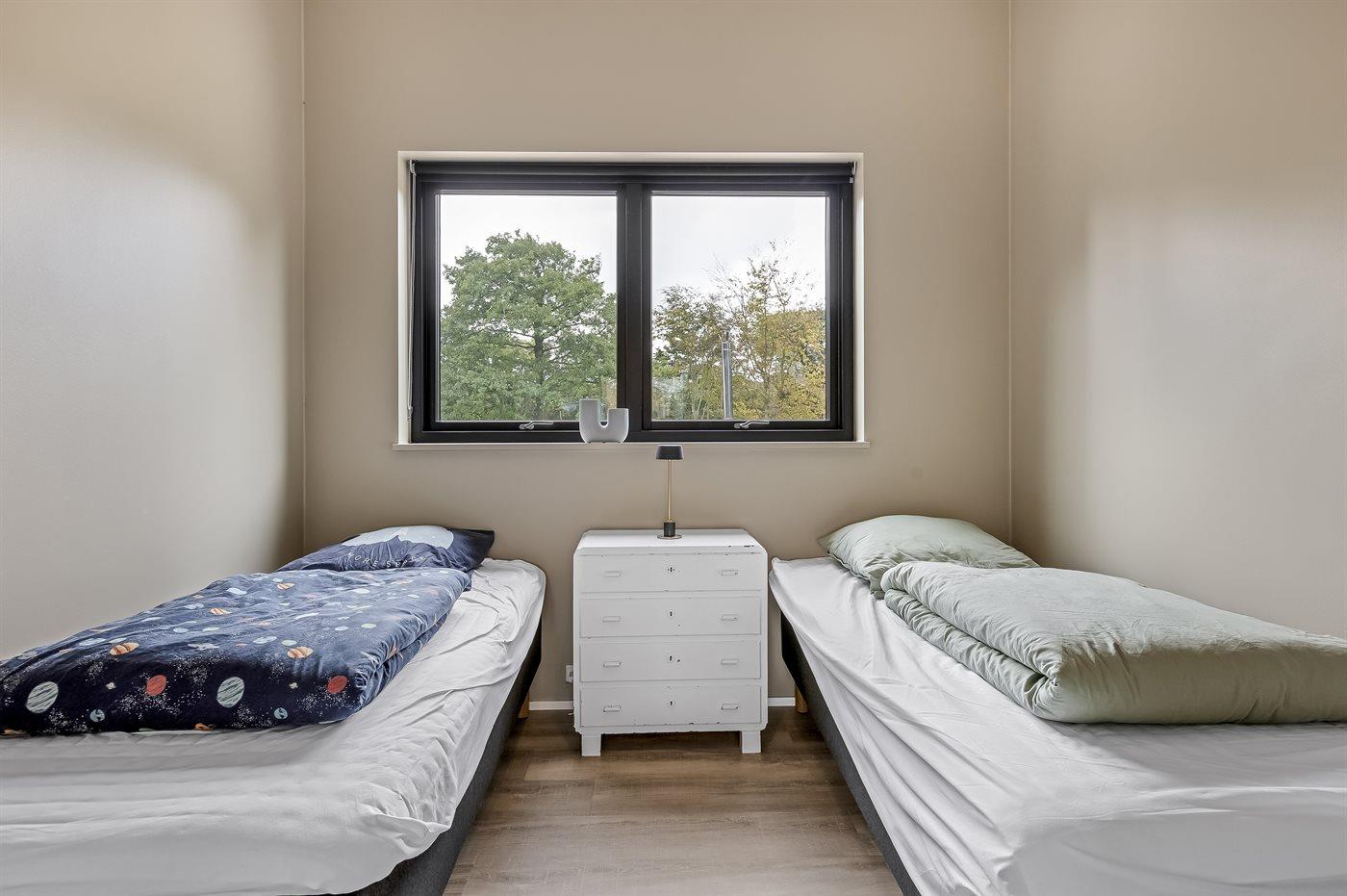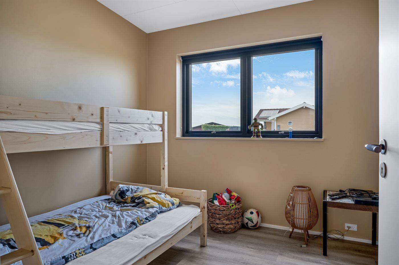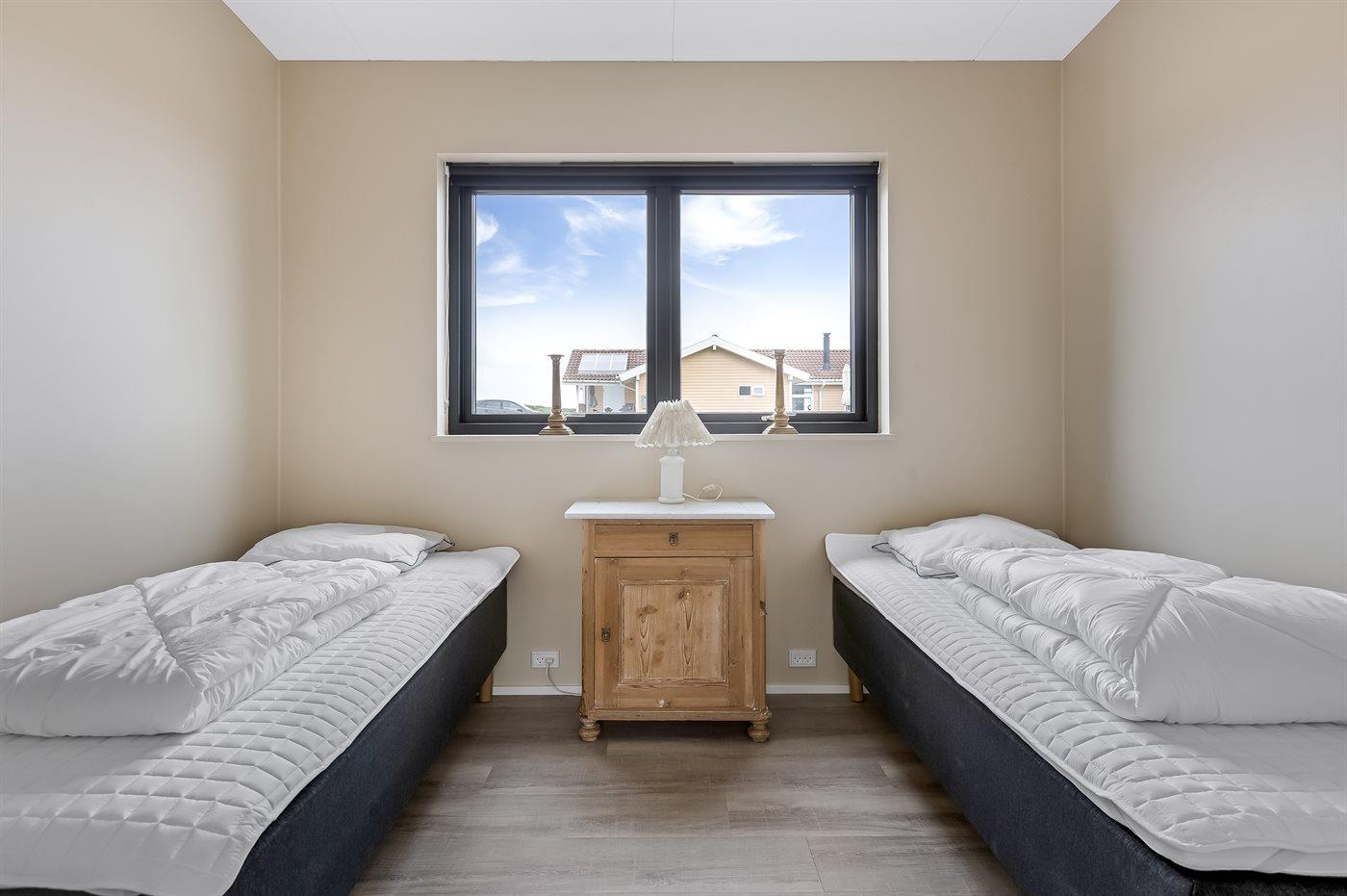 Der er i alt 5 soveværelser. Sovepladserne fordeler sig på: 4 sovepladser i dobbeltsenge. 4 sovepladser i enkeltsenge. 2 sovepladser i køjeseng.