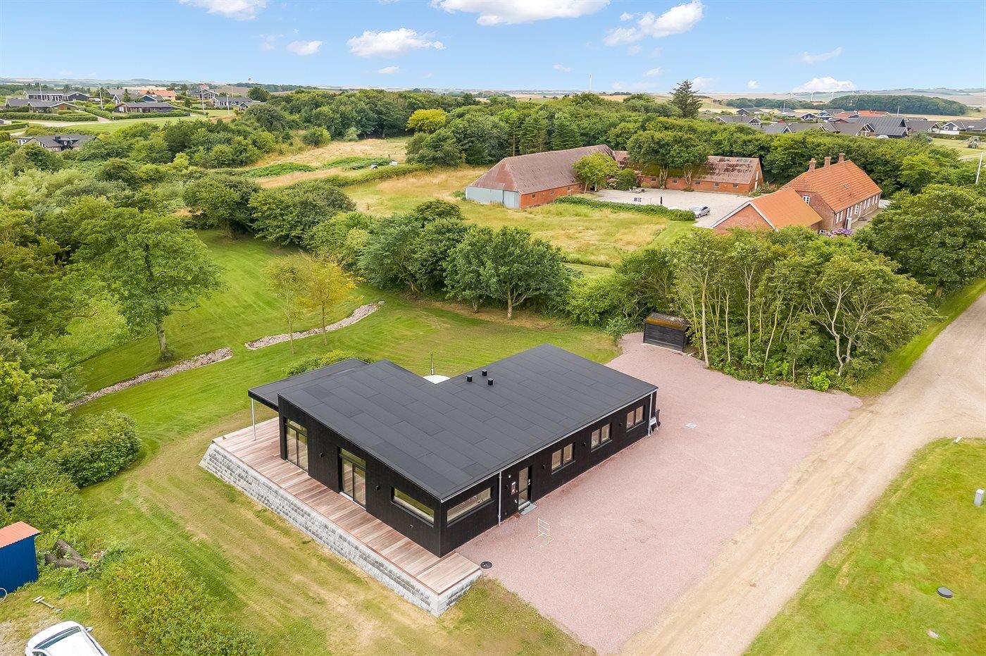Ferieboligen er beliggende på en 2965 m² stor naturgrund. Der er 300 m til fjorden. Nærmeste forretning er beliggende i en afstand af 5000 m. Der er en golfbane i en afstand af 4000 m. Til ferieboligen hører åbent terrasseareal. Desuden er der overdækket terrasse. Der ligger en legeplads i en afstand af 500 m. Udendørs bruser. Der er installeret stik til opladning af elbil. Parkering ved ferieboligen.