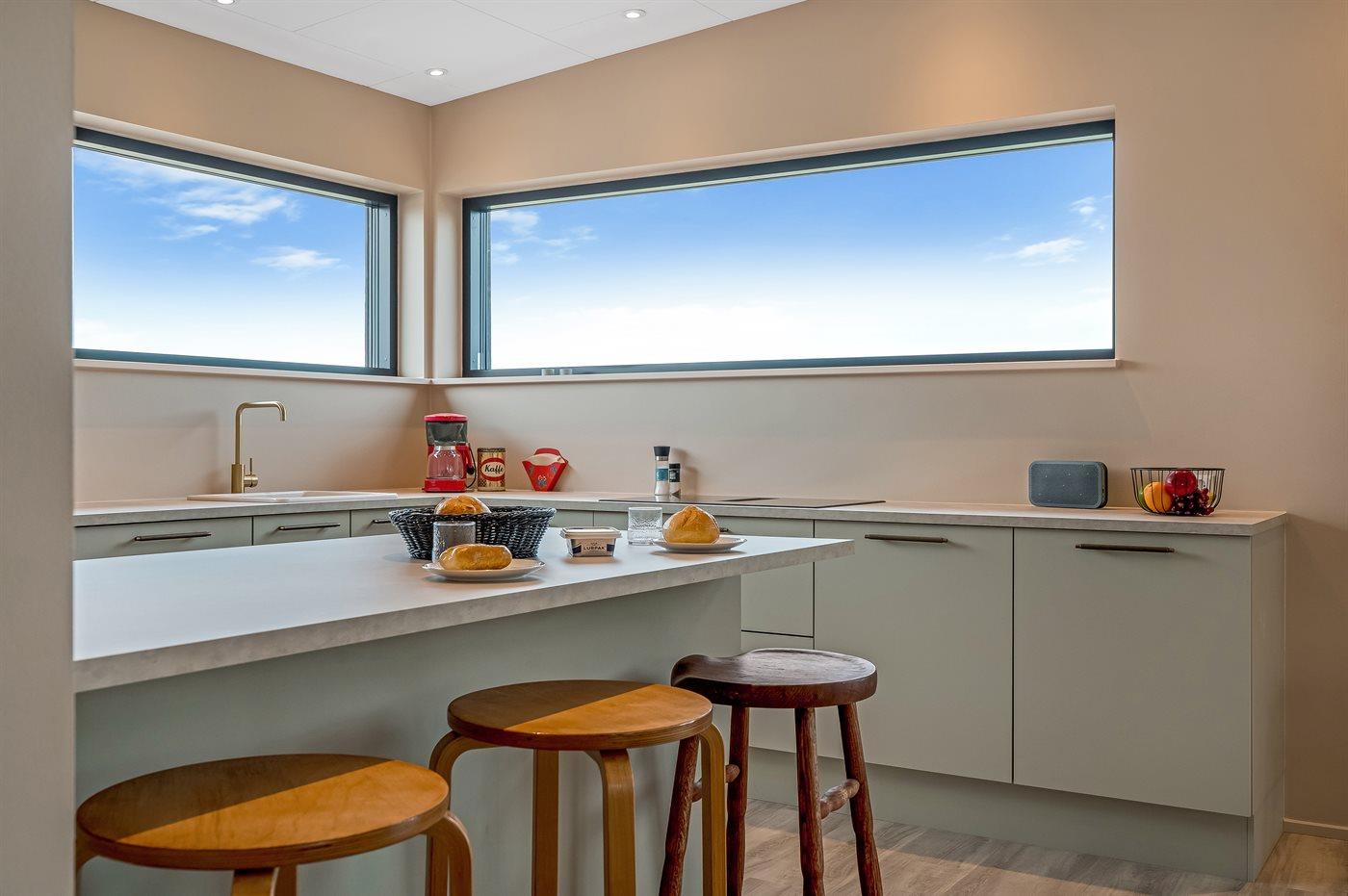 Køkkenet er udstyret med 1 køleskab. Der er 4 induktionskogeplader, varmluftovn samt opvaskemaskine.