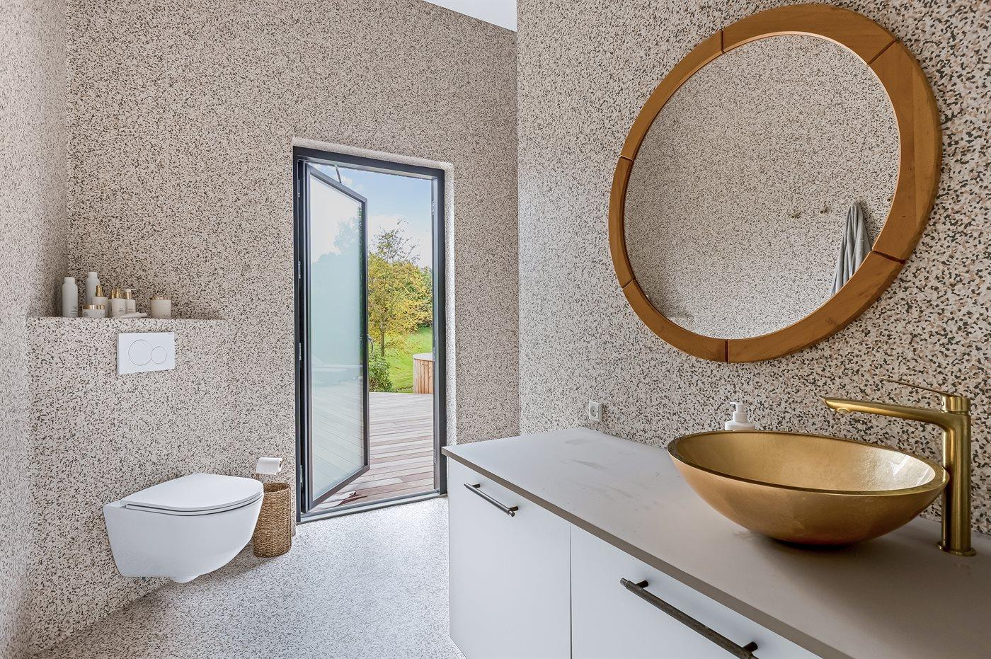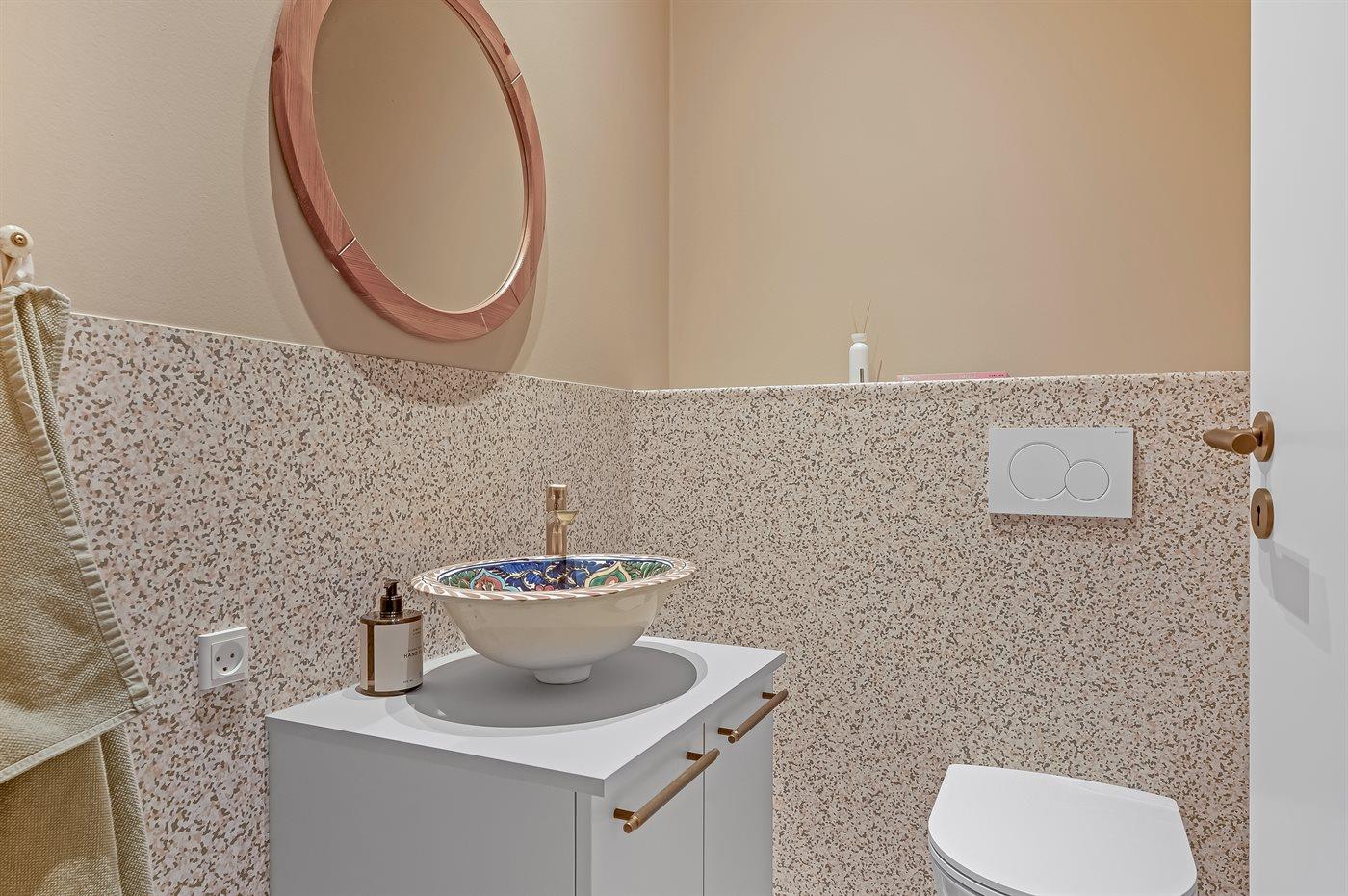 Der er 1 badeværelse med bruseniche og 2 toiletter, heraf 1 gæstetoilet. Der er gulvvarme på 1 badeværelse. Der er gulvvarme på gæstetoilettet.