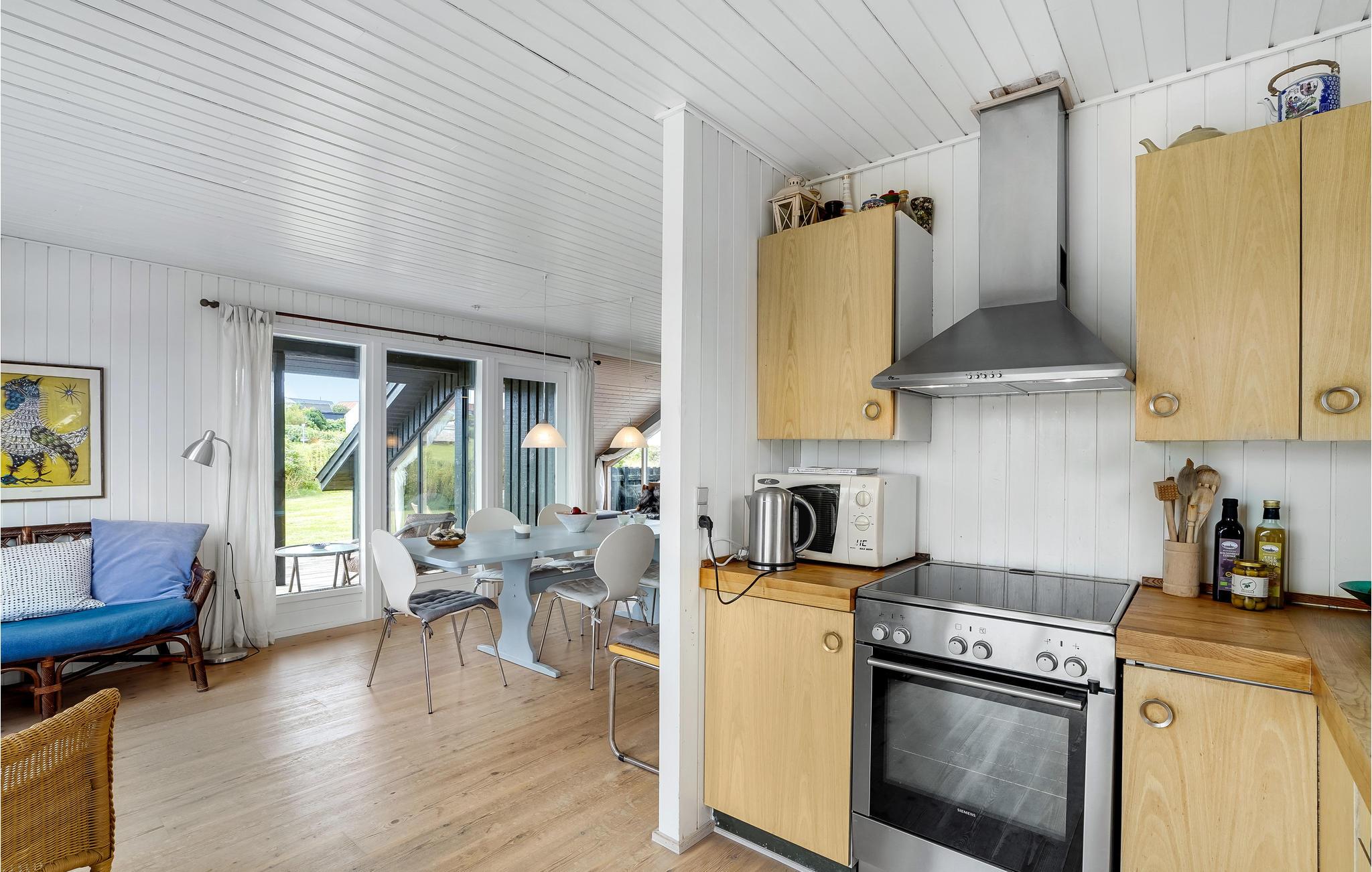 Dette højtbeliggende sommerhus med god udsigt ligger ved Gjeller Odde, som er et familievenligt og uforstyrret område med gode bademuligheder, beliggende i bunden af Nissum Bredning. Huset som emmer af hygge, har udover spisestuen, der ligger i forbindelse med køkkenet, også en dejlig tv-stue med sofagruppe og brændeovn. Huset har to soveværelser, og i forbindelse med dem ligger badeværelset. Fra de store terrasser, der omkranser huset, er der flere steder en helt fantastisk udsigt til bugten og Limfjorden.