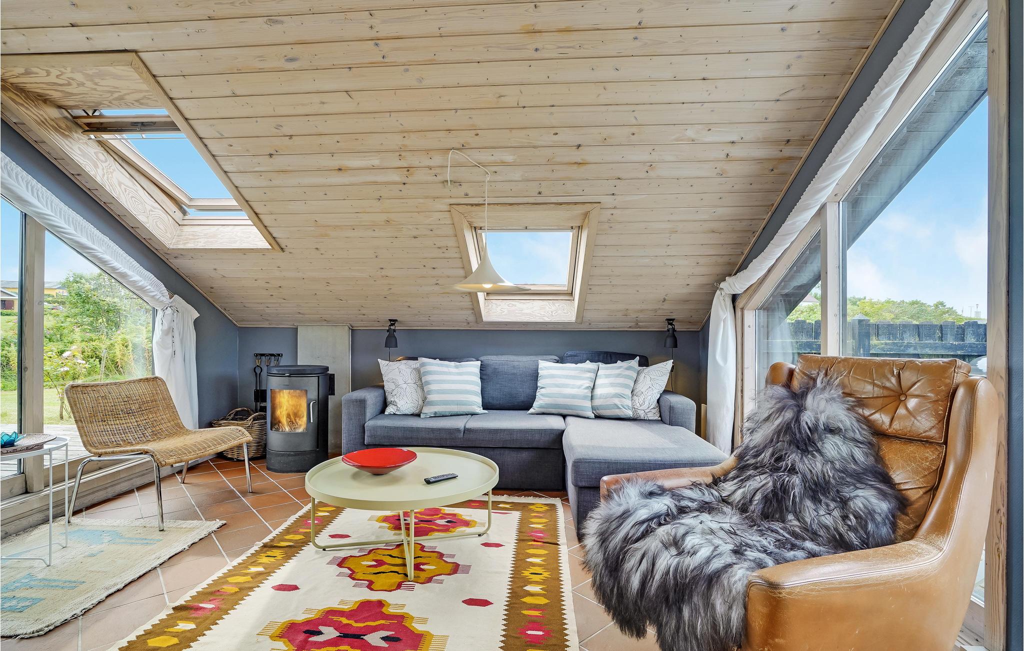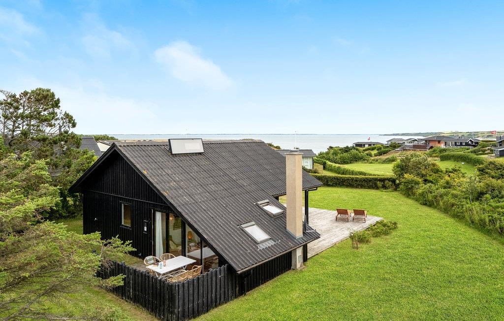 Hyggeligt sommerhus ved Gjeller Odde med fjordudsigt, brændeovn og store terrasser tæt på strand og natur.