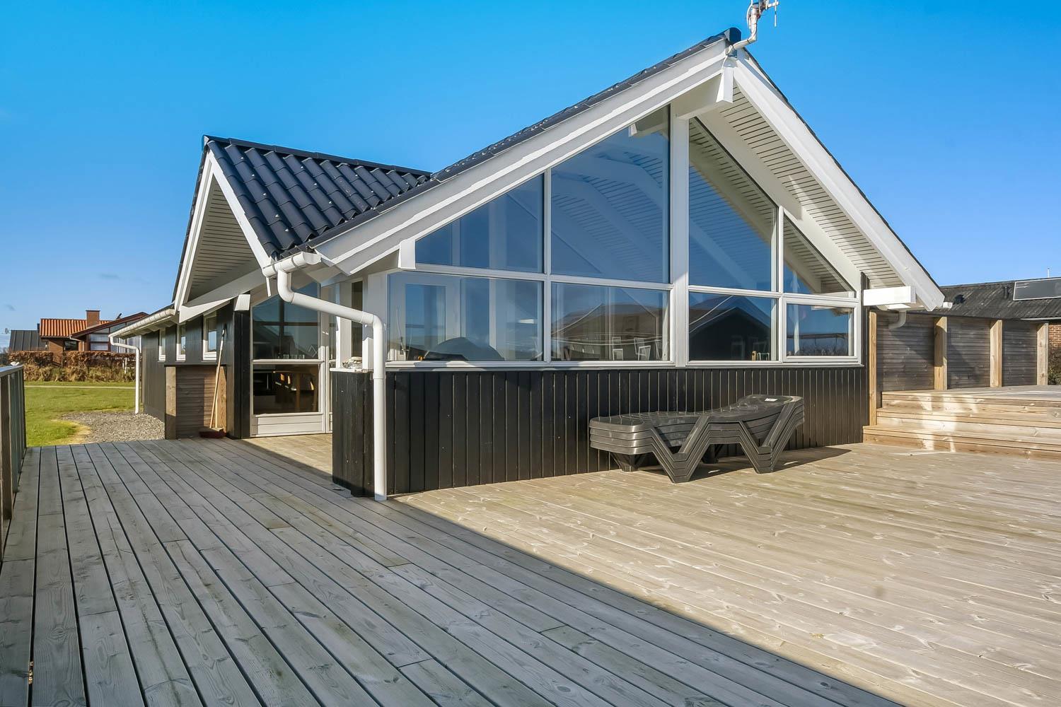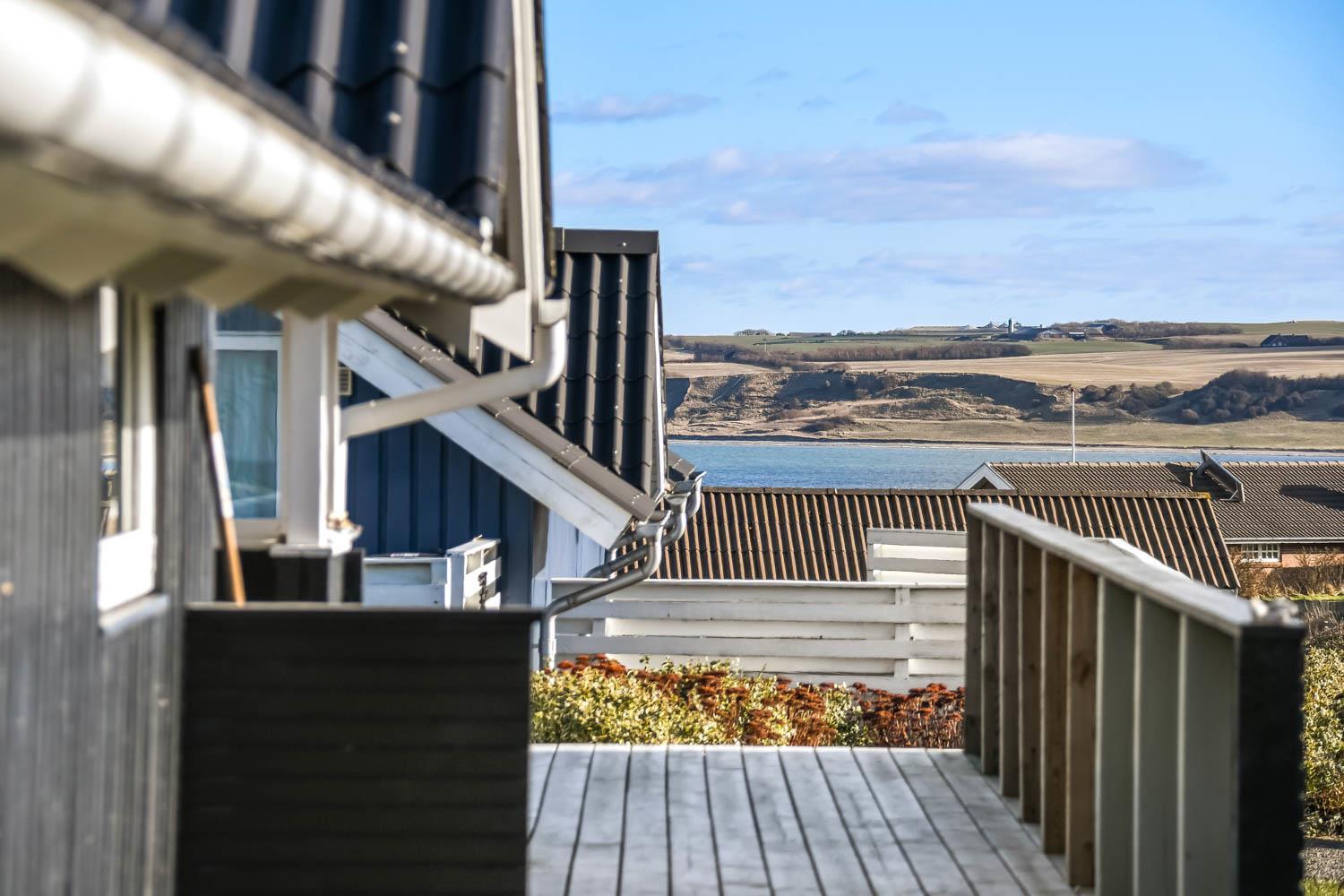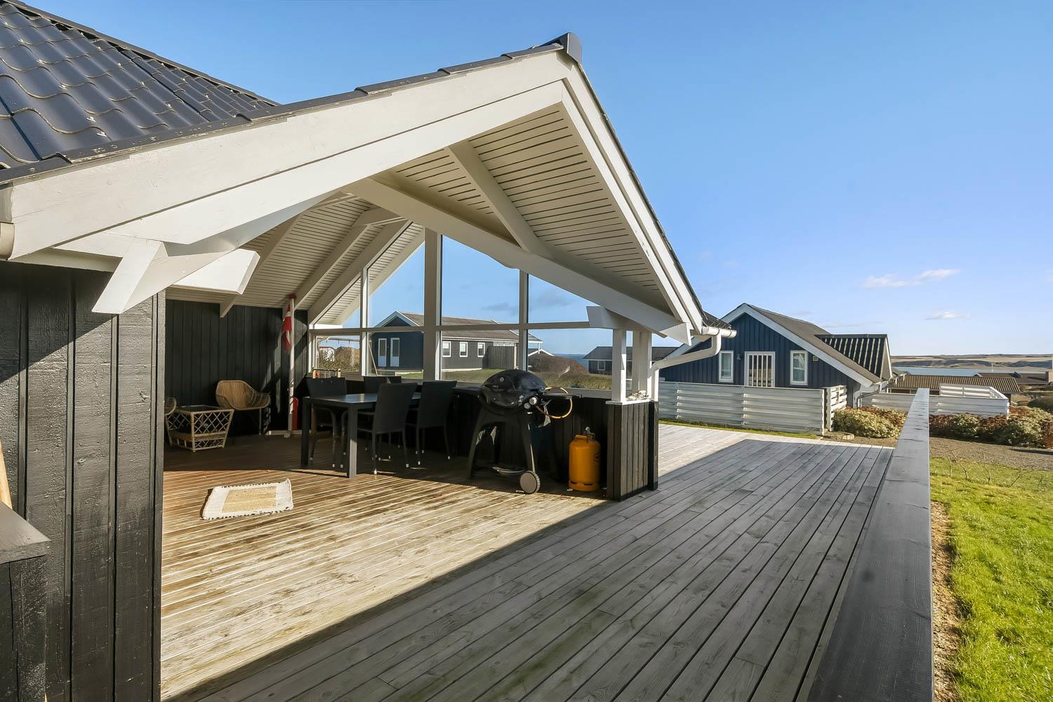 Husets store overdækket træterrasse er noget helt særligt. Herudover findes der også altid en plads i solen på huset terrasse som ikke er overdækket. Fra begge terrasser er der flot kig til Limfjorden. Havemøbler, solvogn og grill kan flyttes rundt på terrasserne efter behag. Højt, ugeneret beliggende på en stikvej på en velholdt grund på ca. 844 m2 kun 500 m. fra Limfjorden. Fra huset findes der stisystemer, som på få minutter fører direkte ned til fjord, badestrand og badebroer. Nær ved huset ligger også den nye flotte naturlegeplads i træ med rutsjebaner, gynger og meget andet. Her findes også iskiosk og restaurant. Der er i øvrigt kun ca. fire km til Lemvig by, som er en livlig handelsby med mange butikker, fiskerestaurant, biograf, skaterbane, museum mm.