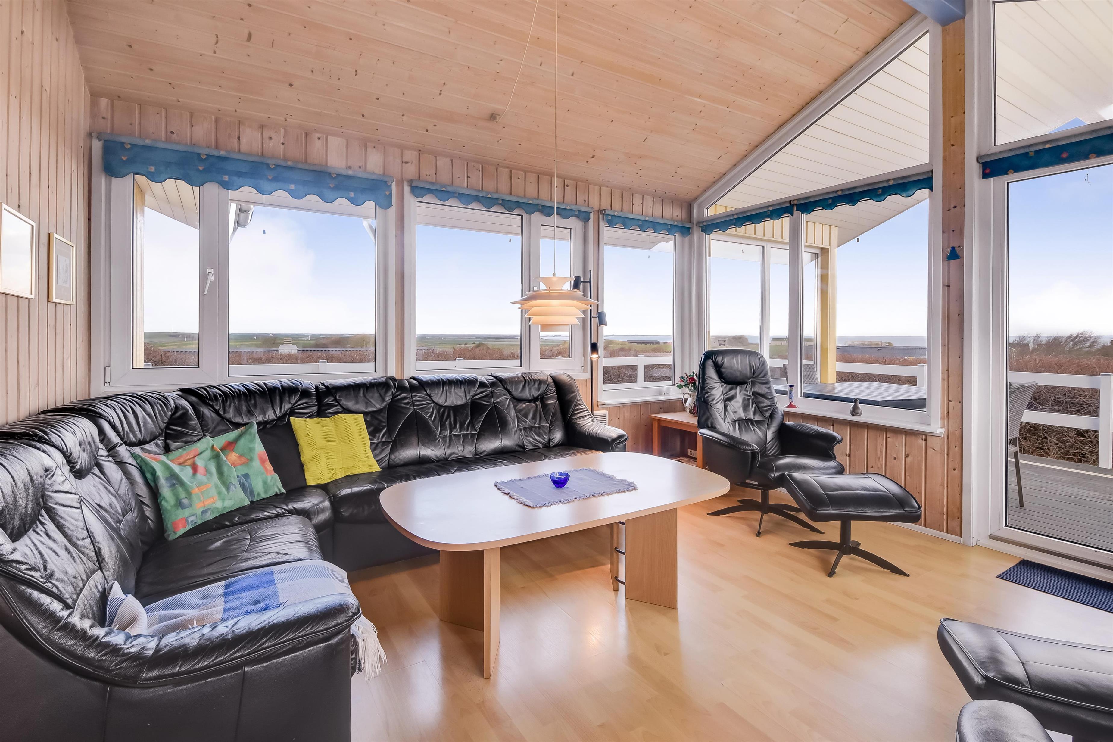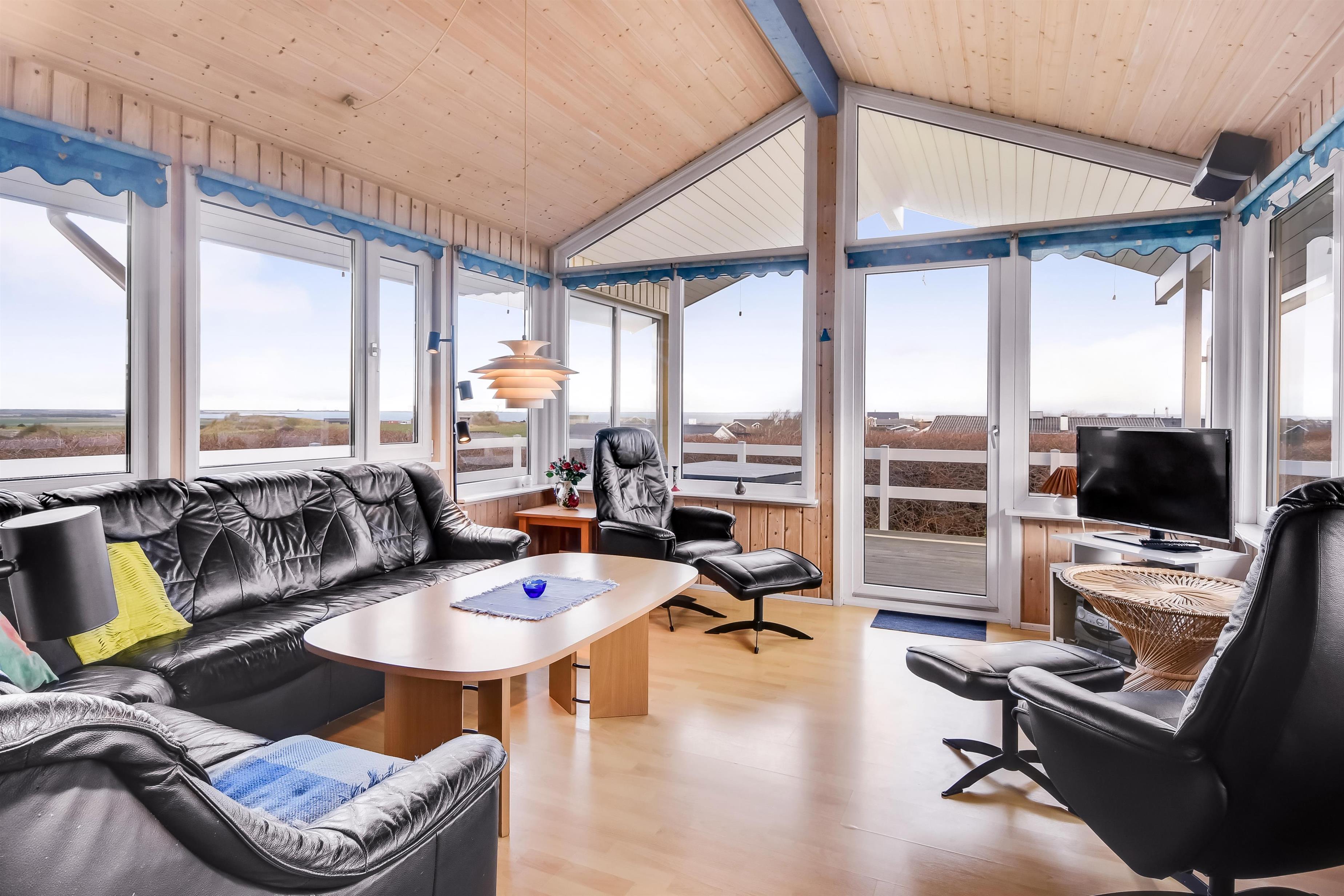 Dette dejlige træferiehus ligger ideelt på en 1.600 m² stor udsigtsgrund med en fantastisk panoramaudsigt over Limfjorden og det omkringliggende landskab. Husets store vinduer giver et lyst og venligt indeklima, og vægge og loft er beklædt med ludbehandlet træ. Overalt i huset ligger trægulve, mens badeværelserne har klinkegulve med gulvvarme.