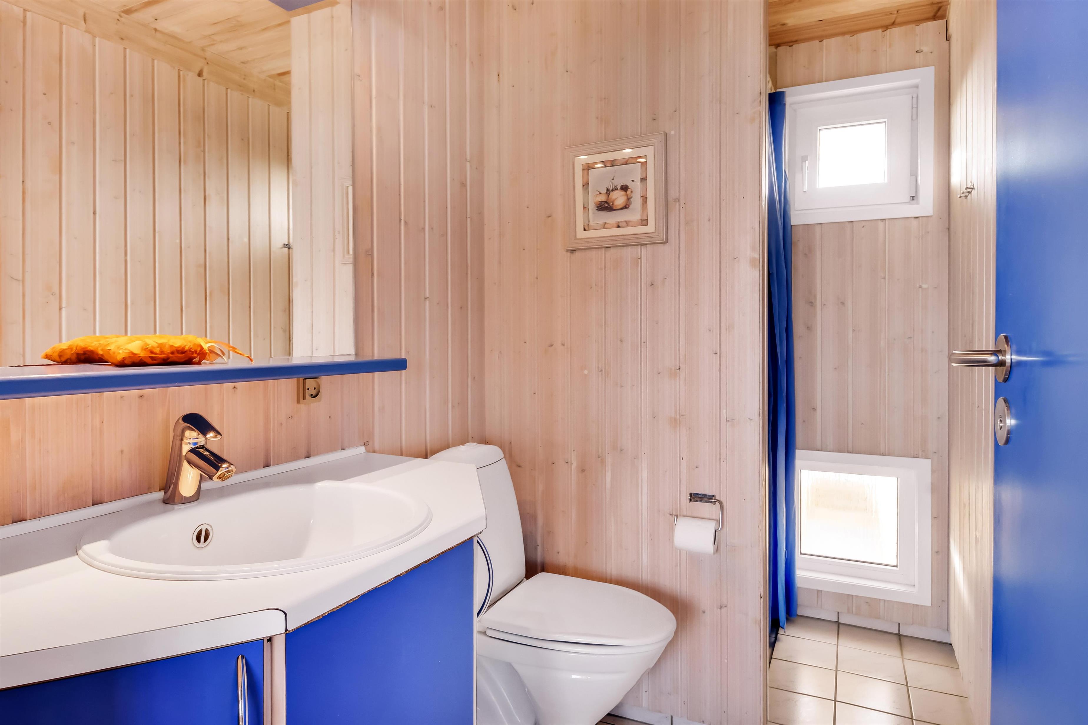 Huset rummer tre hyggelige soveværelser samt en hems med to ekstra liggepladser, hvilket gør det velegnet til en eller to familier. Der er to badeværelser med toilet, håndvask og bruser; det ene badeværelse har spa-bad og direkte adgang til saunaen.