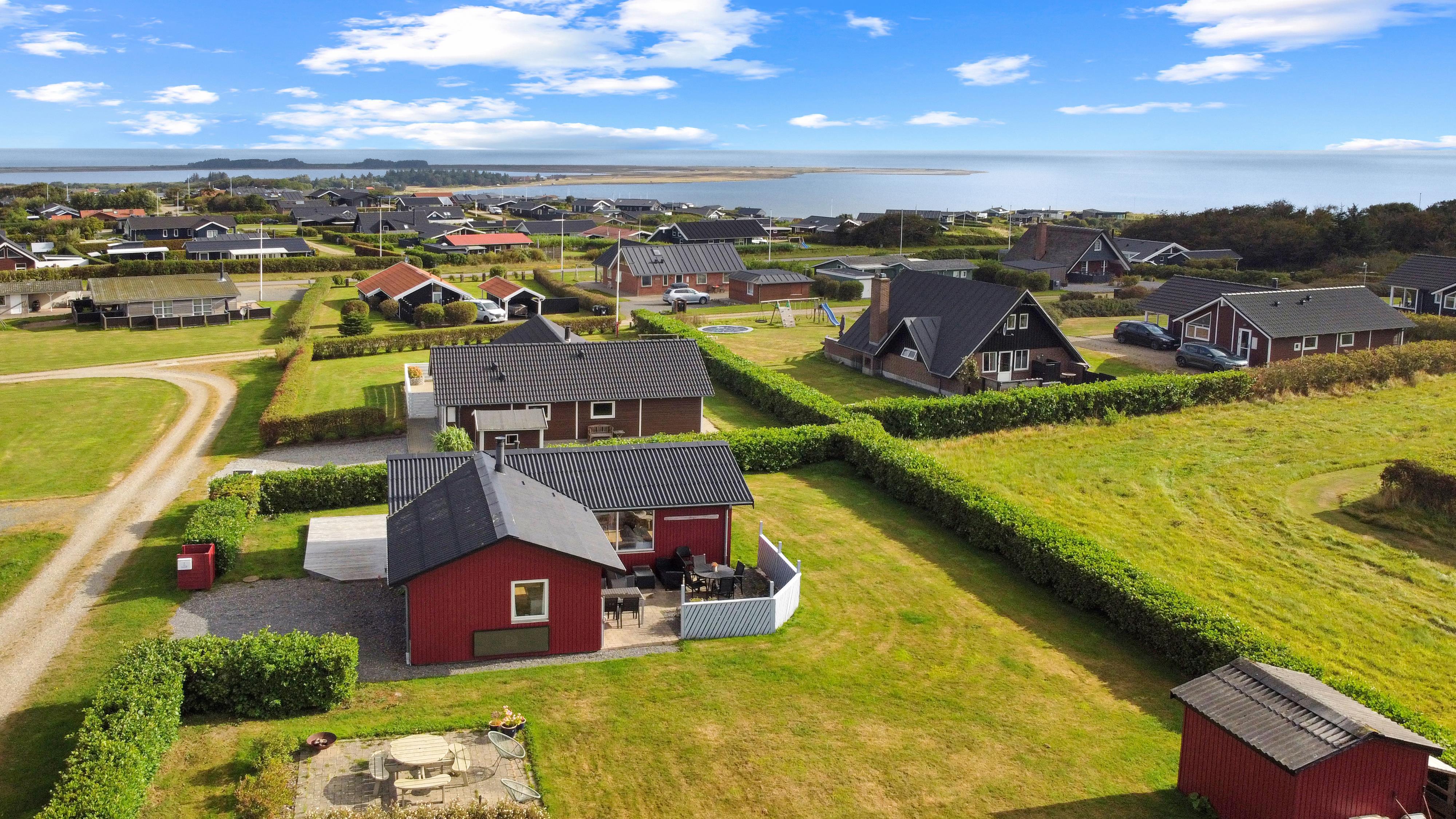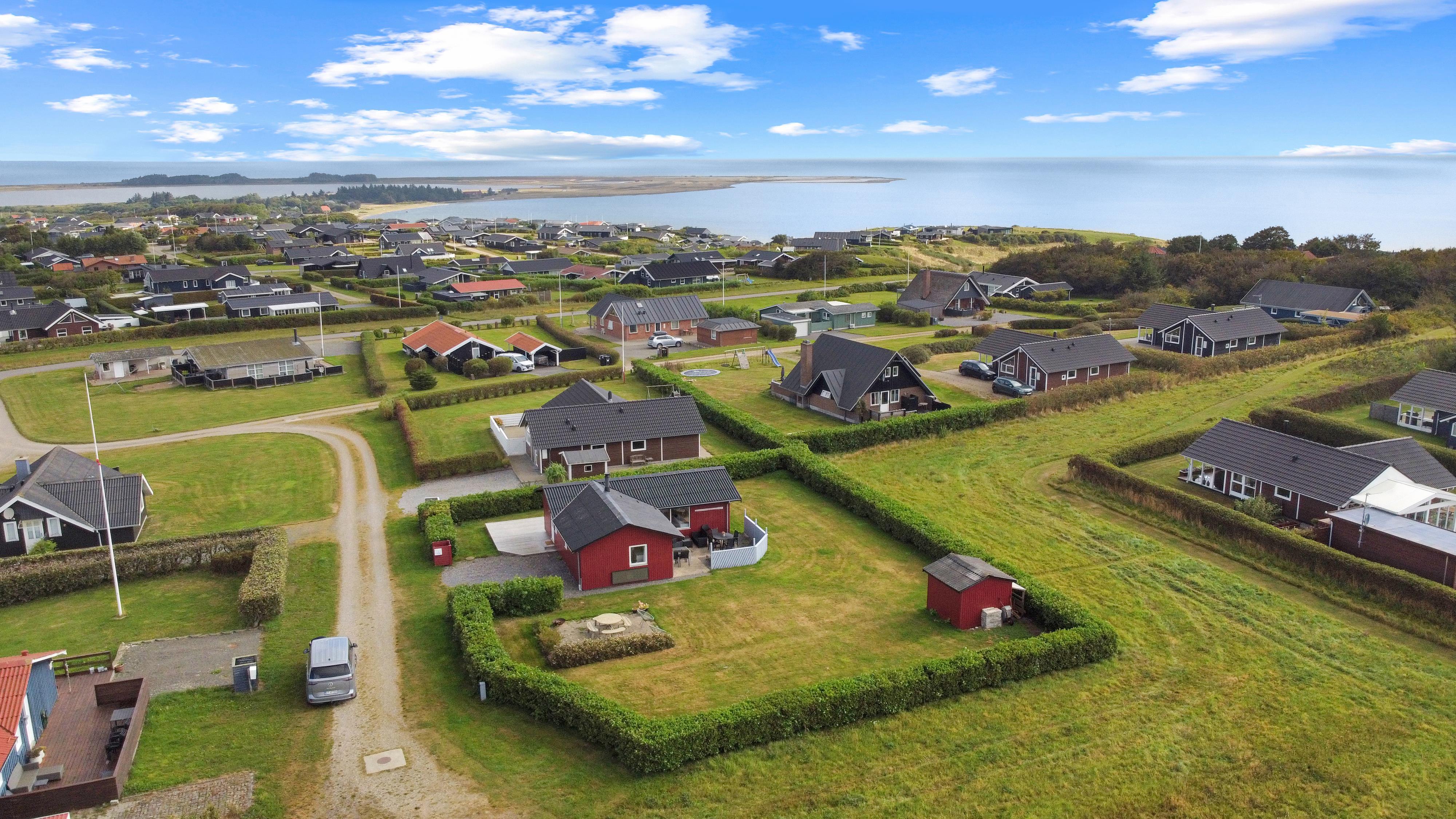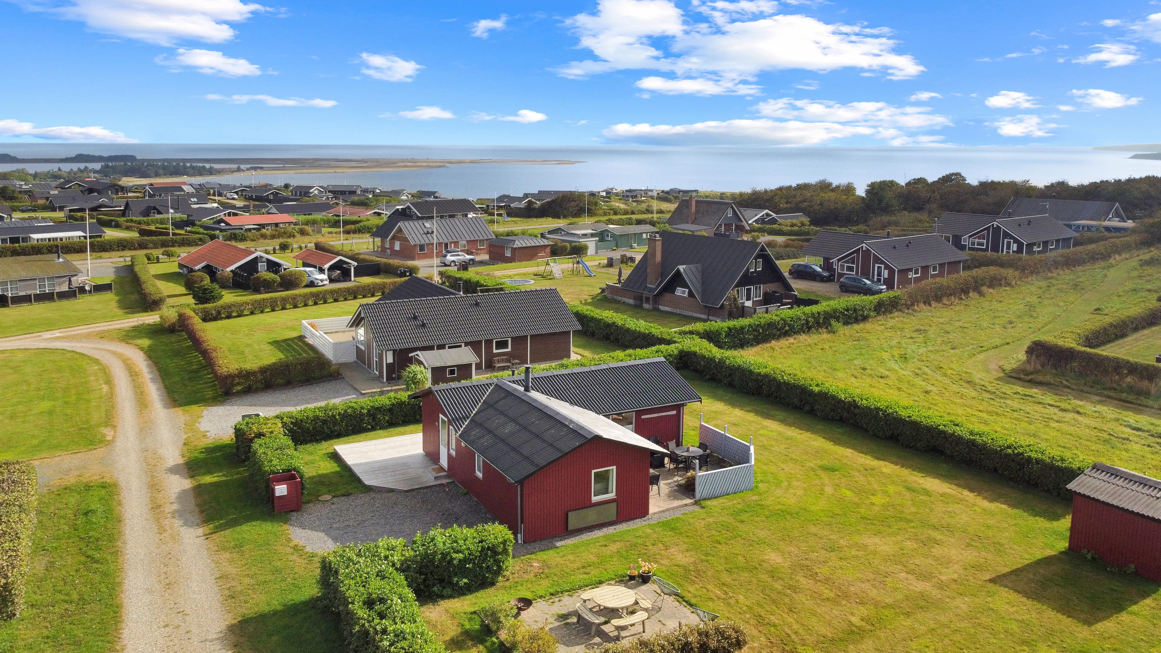 Beliggende på en ca. 895 m2 stor, velholdt grund for enden af en blind vej og ved sien af en ikke bebygget nabogrund. Der er flot udsigt over landskabet med Limfjorden i baggrunden. Dejlig indhegnet terrasse / gårdhave med havemøbler, solsenge og grill På den anden side af huset er er en nyanlagt terrasse med loungesæt samt udsigt til landskabet / Limfjorden. Fra huset findes der er dejligt stisystem som fører direkte ned til vandet på få minutter. Ca. 400 m fra huset ligger den nye flotte naturlegeplads i træ med fodboldbane og rutsjebane. Der er kun fire km til Lemvig, som er en livlig handelsby med mange butikker, fiskerestaurant, museum m.m. Tager man bilen er en tur til Thyborøn en oplevelse i sig selv og klares på 20 min. Her er der flere forskellige aktiviteter som fiskeriauktion, Sea War Museum eller besøg det spændende Jyllandsakvarie, hvor børnene kan se og røre ved fisk og krabber, eller besøg det helt unikke Sneglehus. Dagen sluttes af med is i hånden, mens at I går tur langs havnekajen og ser på alle fiskekutterne.