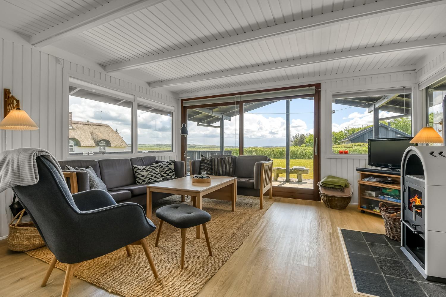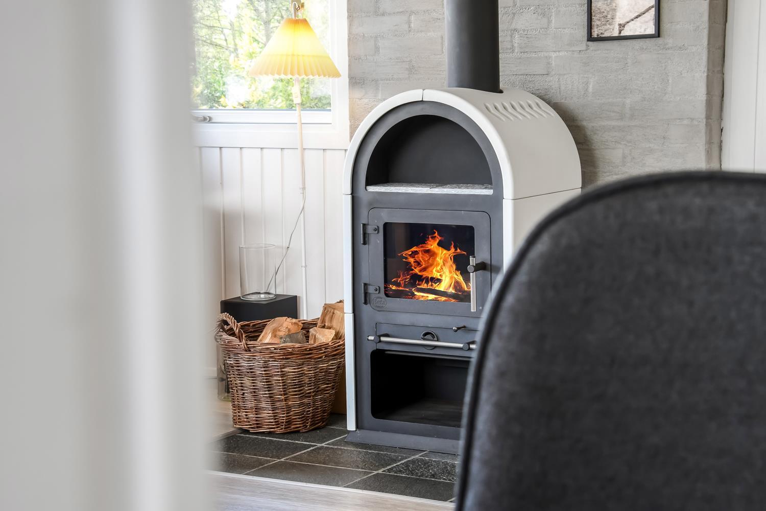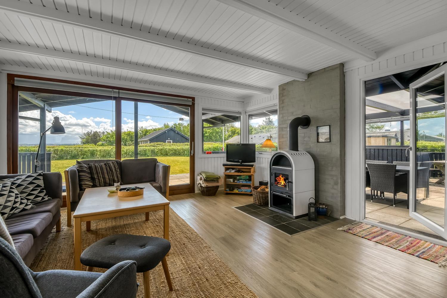 Den lyse, kombinerede stue og køkkenafdeling byder på polstermøbler, brændeovn for ekstra hygge og fiber-TV med både danske og tyske kanaler – perfekt til afslapning efter en dag i naturen.