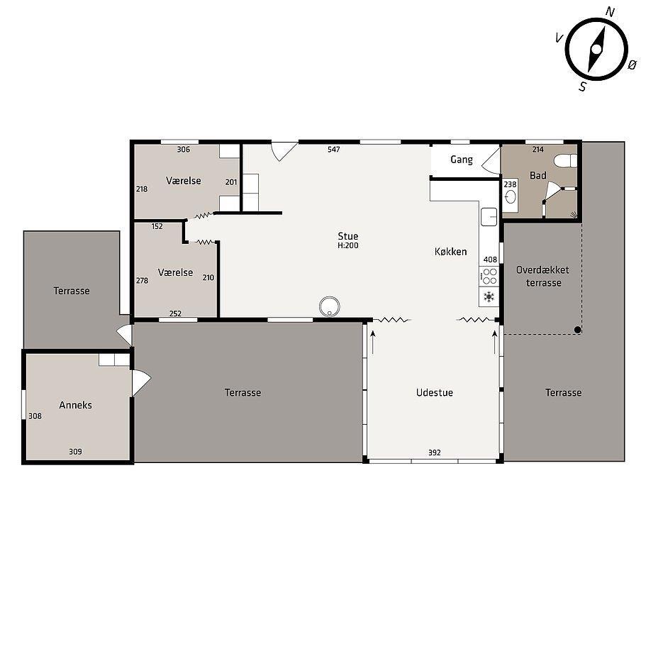 Huset har en dejlig terrasse med havemøbler og grill, hvor man kan nyde solen, læse en bog eller spise udendørs med familien. Grunden byder på masser af plads og grønne områder med træer, som skaber en hyggelig og fredelig atmosfære. Huset er udstyret med varmepumpe, hvilket sikrer en behagelig temperatur året rundt. Huset er et ikke-ryger hus.