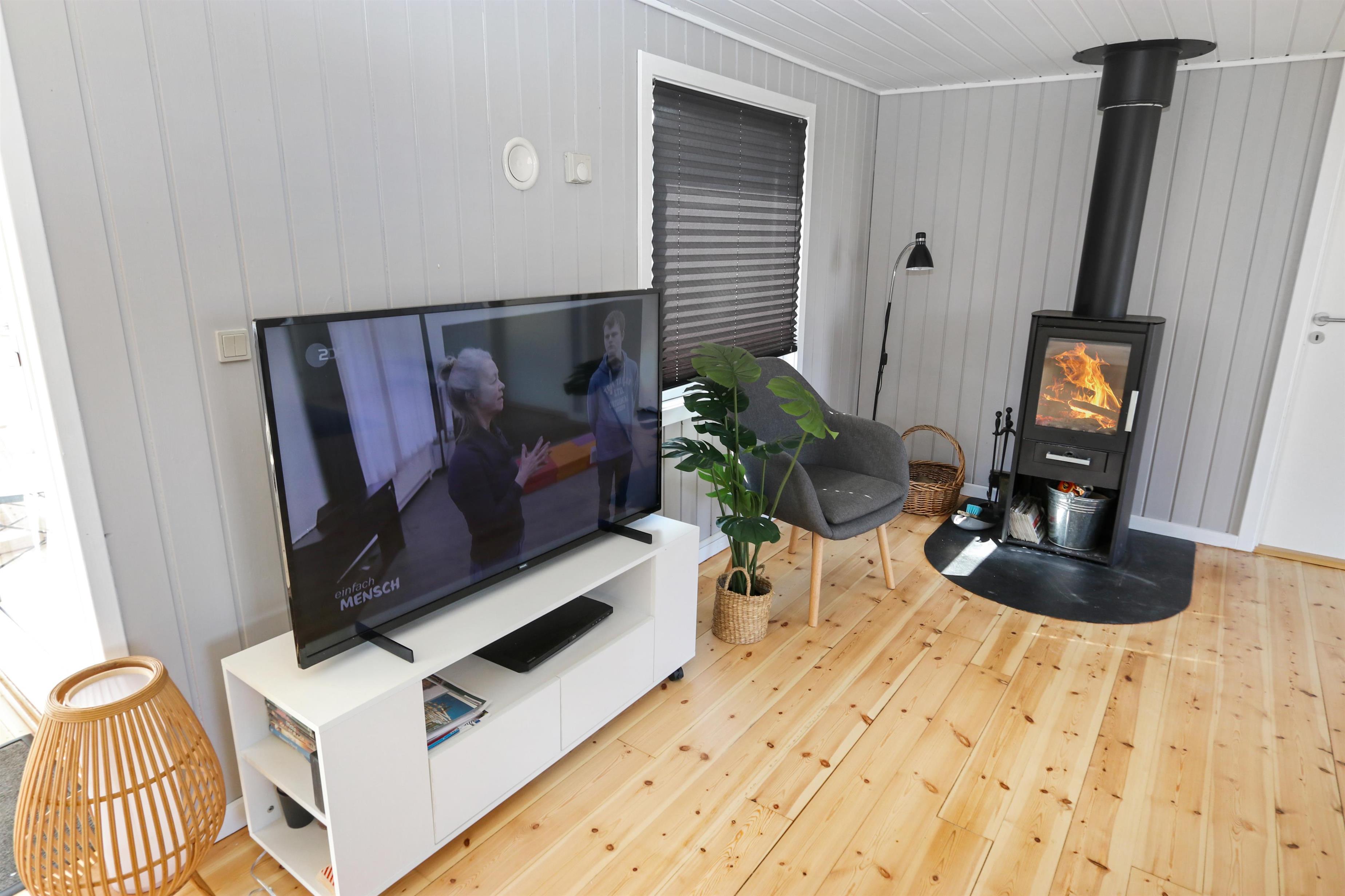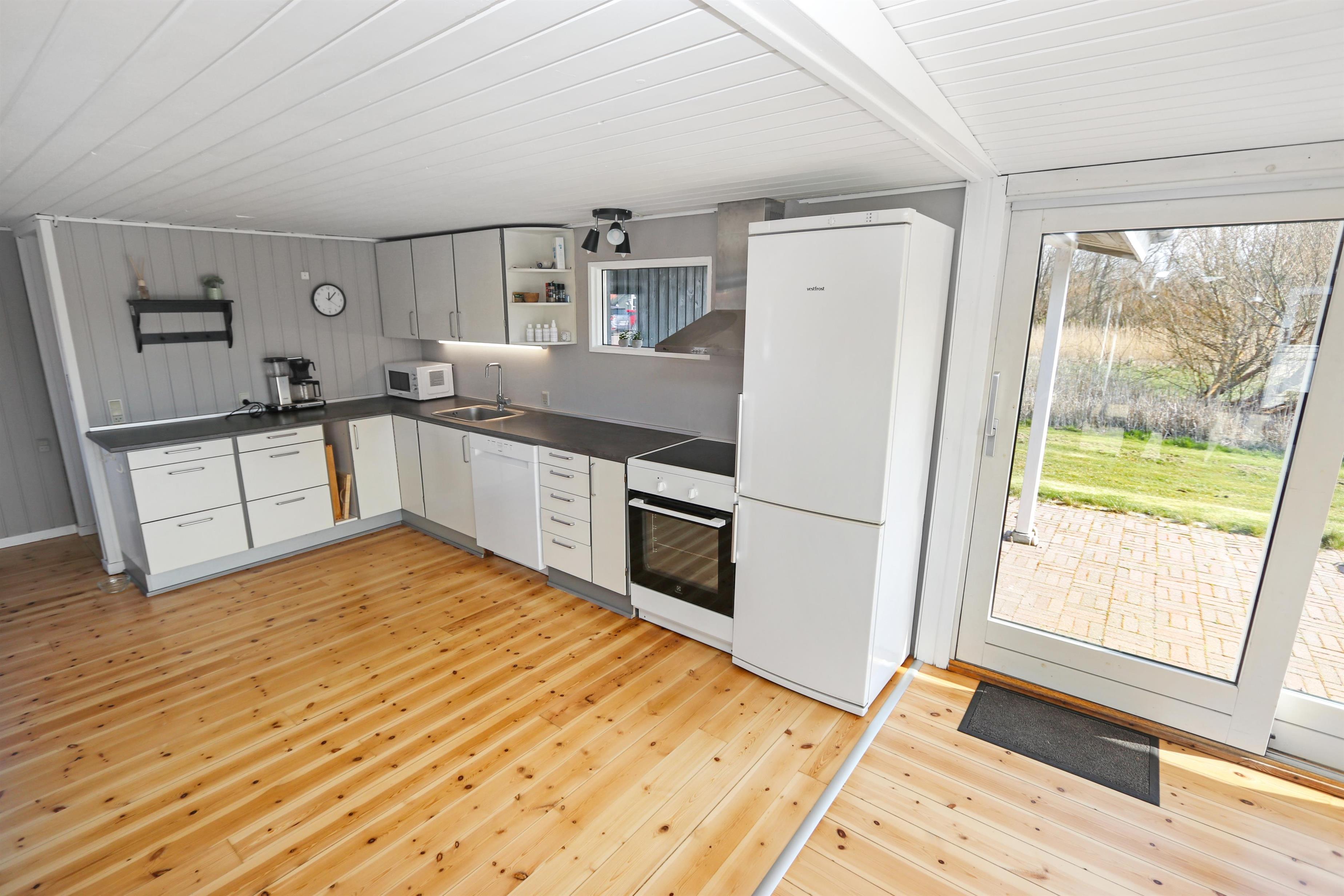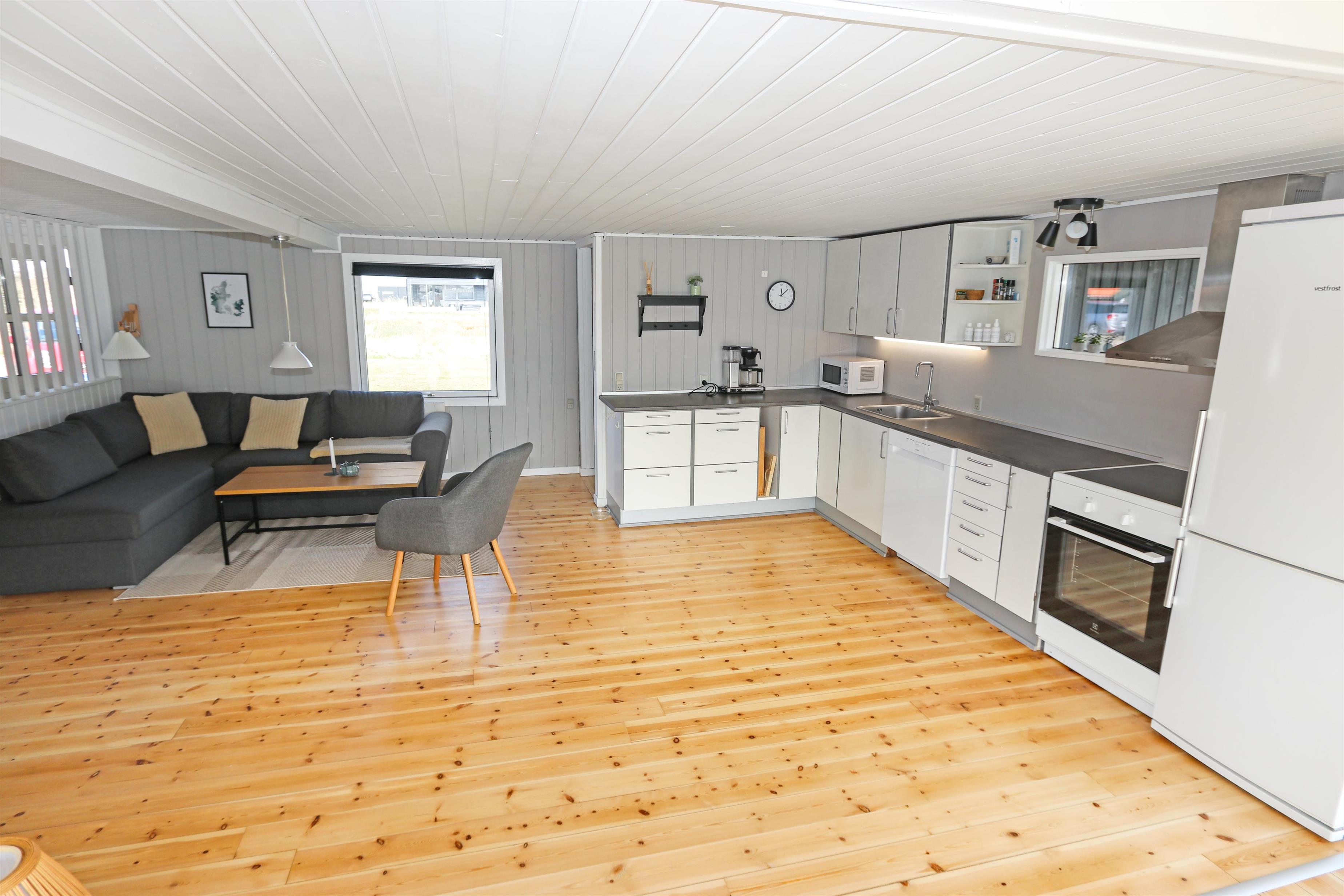 Stuen er indrettet med hyggelig brændeovn, farve-tv med DR-kanaler og TV2 samt et stereoanlæg, så der er mulighed for både afslapning og underholdning. Der er gratis internet, så man kan holde kontakten eller streame sine yndlingsprogrammer. Køkkenet er godt udstyret med el-komfur, køleskab, mikroovn og opvaskemaskine, hvilket gør det nemt at tilberede lækre måltider under ferien.
