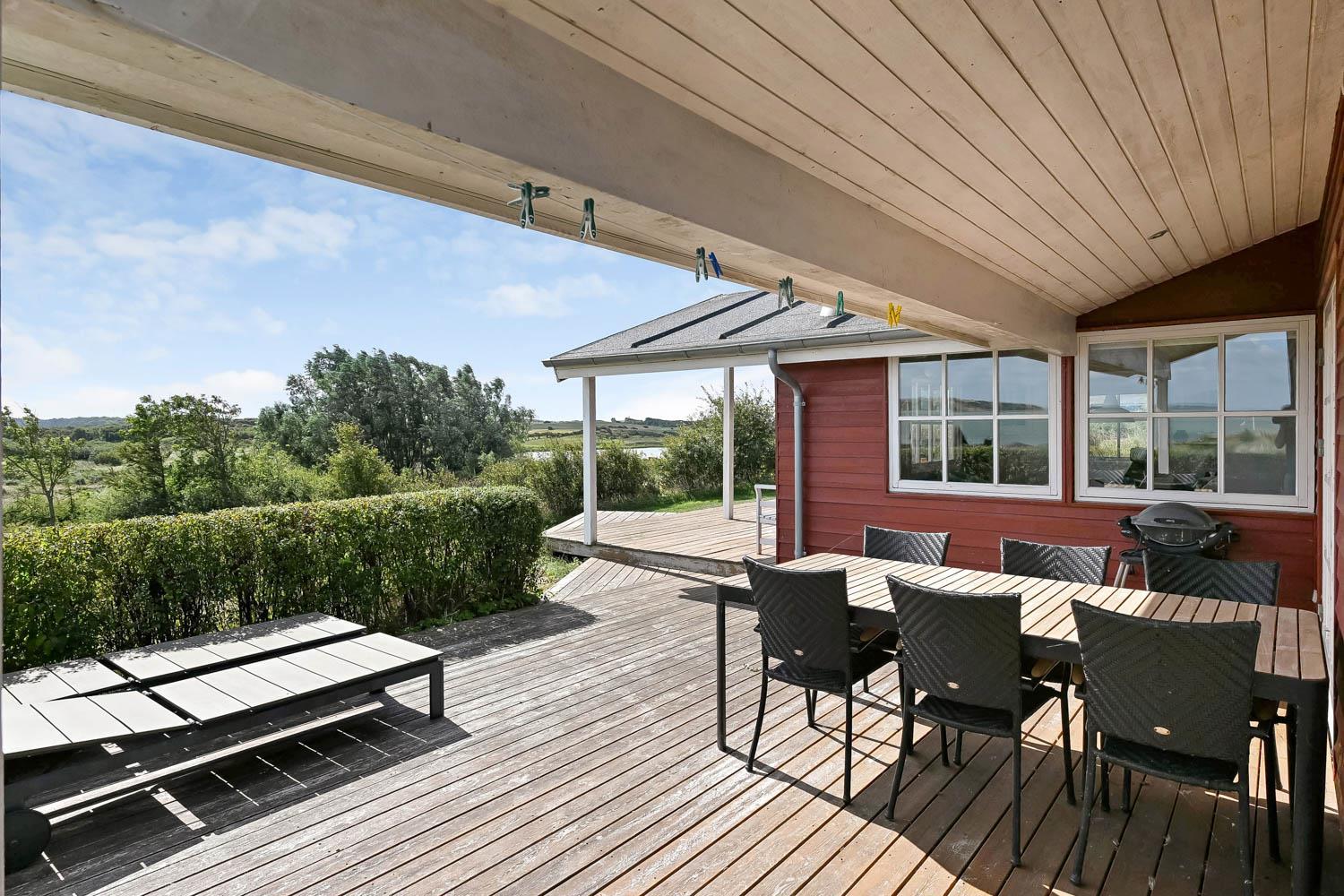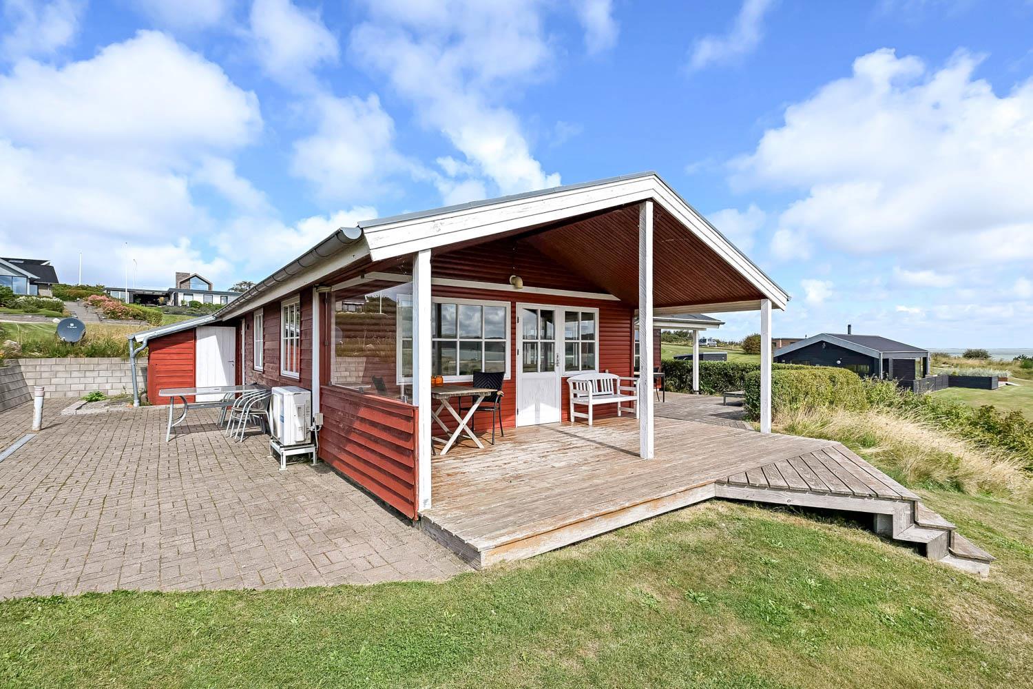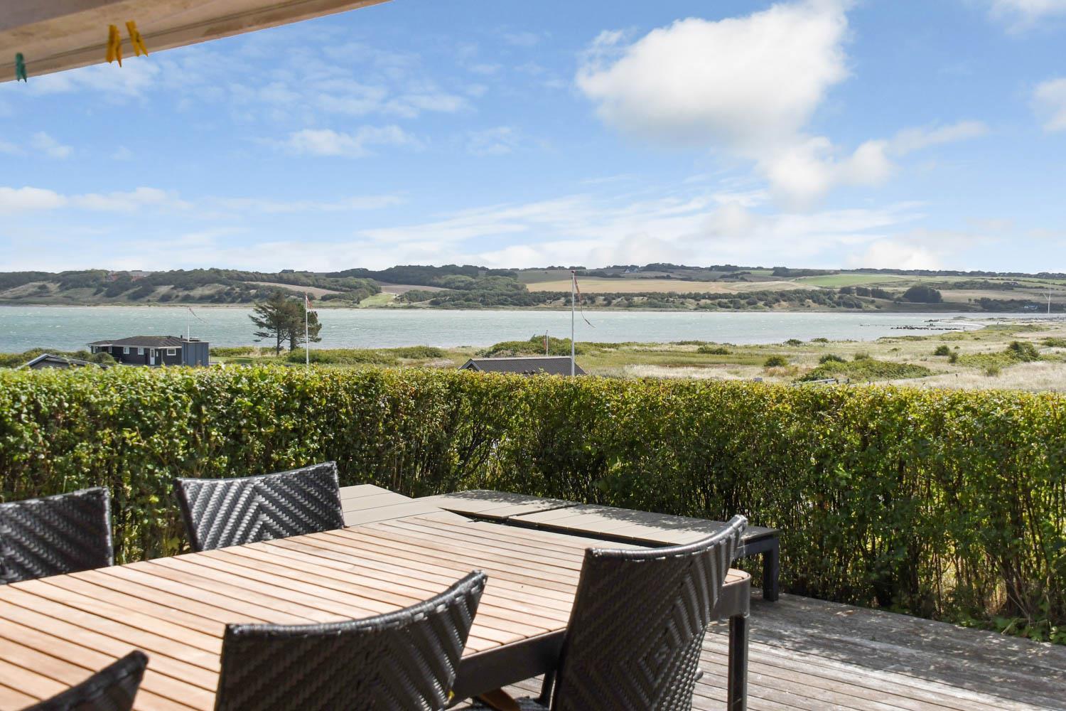 Huset er beliggende på en 1000 m2 panorama grundstykke med flot fri udsigt over landskabet. Huset er beliggende blot 150 m fra Limfjorden og Lemvig By ligger ca. 5300 m fra huset. Fra stuen er der udgang til 2 delvis overdækkede terrasser, med havemøbler og liggestole, fra begge terrasser der er ligeledes en fantastisk udsigt over vandet. Der er en bålplads. Huset er beliggende tæt på Lemvig by, hvor der er gode restauranter og butikker. Ønsker man at besøge fiskerbyen Thyborøn så ligger det også blot ca. 15 min kørsel i bil fra huset. Det perfekte hus for en familie som ønsker at bo med en fantastisk udsigt tæt på Limfjorden.