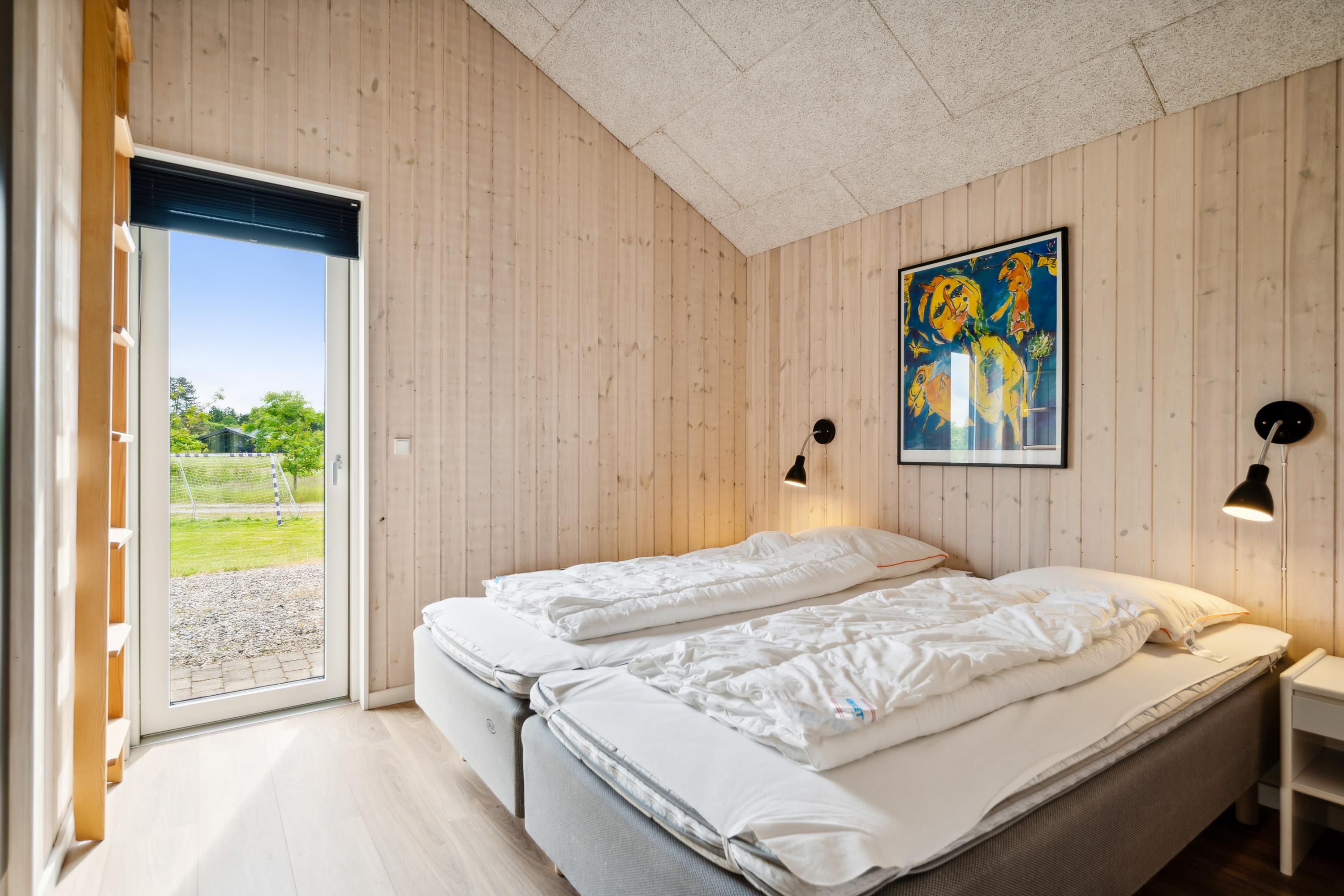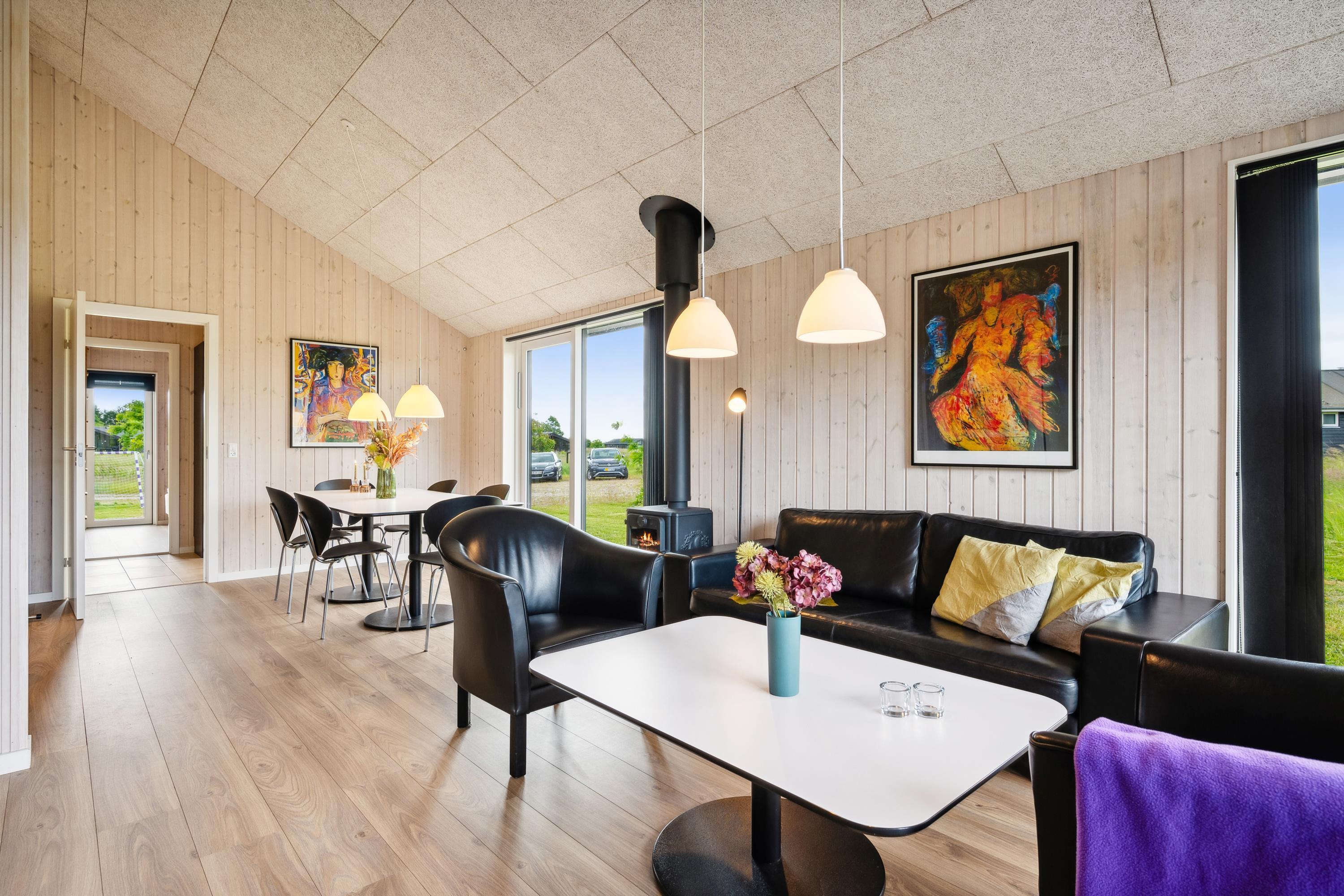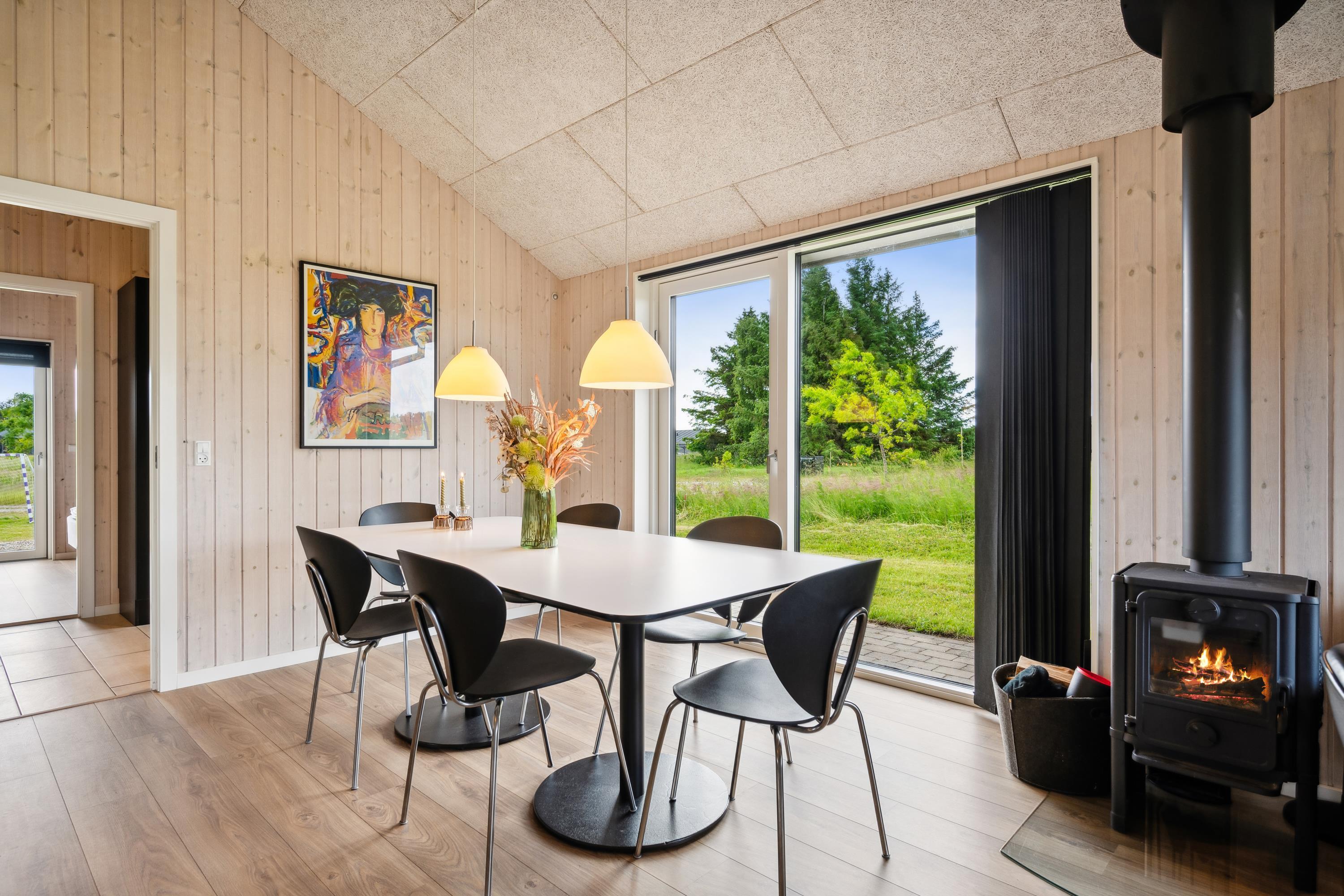Dette moderne og rummelige sommerhus med 3 dejlige soveværelser har plads til op til 6 voksne og 2 børn (hemsepladser med madras). Et flot og lyst badeværelse med gulvvarme og bruseniche. Sæt jer godt til rette ved brændeovnen i stuen, lyt til den knitrende ild og nyd den vidunderlige udsigt over omgivelserne gennem gulv til loft-vinduerne, der også giver et dejligt lysindfald i huset. Der er både vaskemaskine, tørretumbler og opvaskemaskine til rådighed i feriehuset.