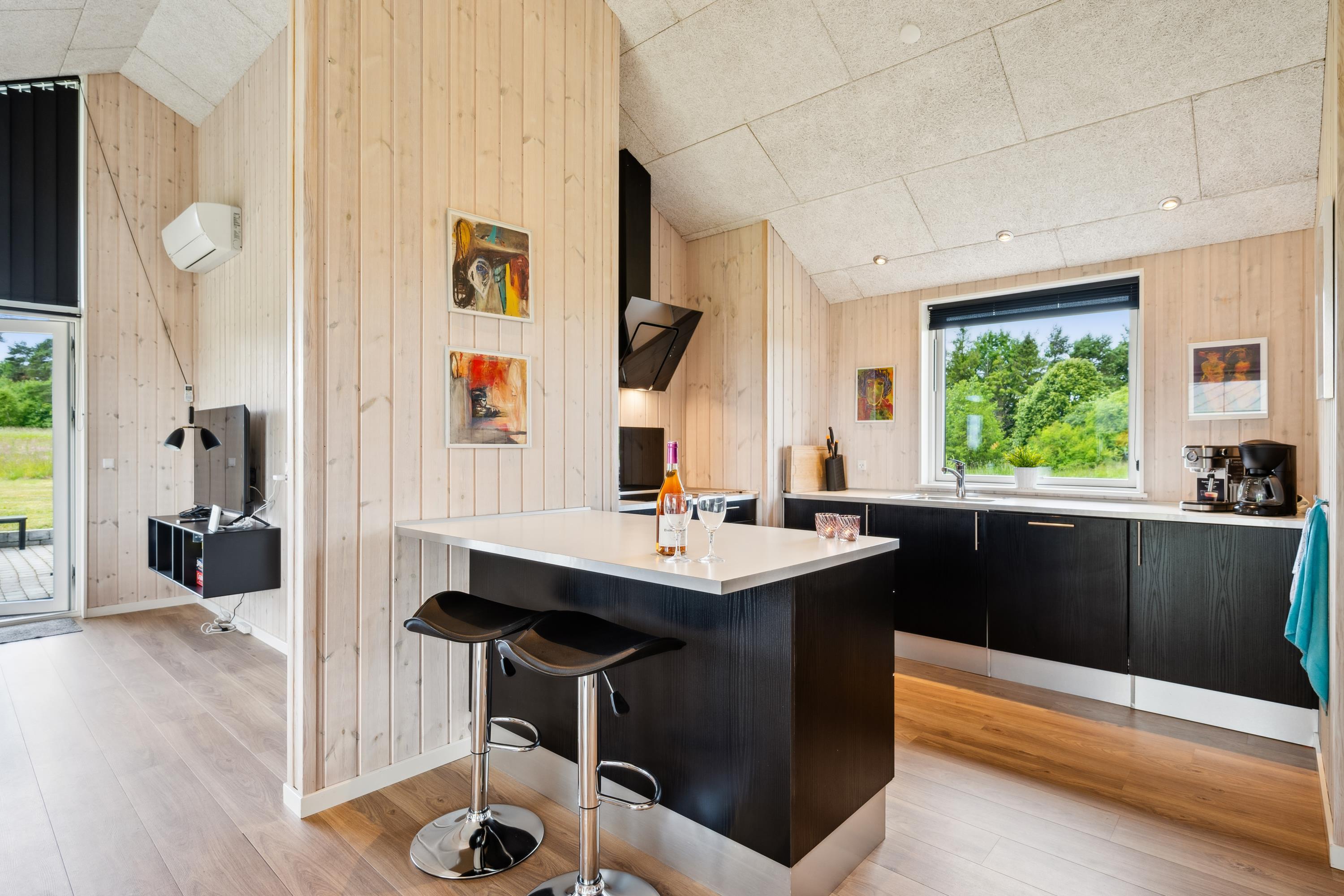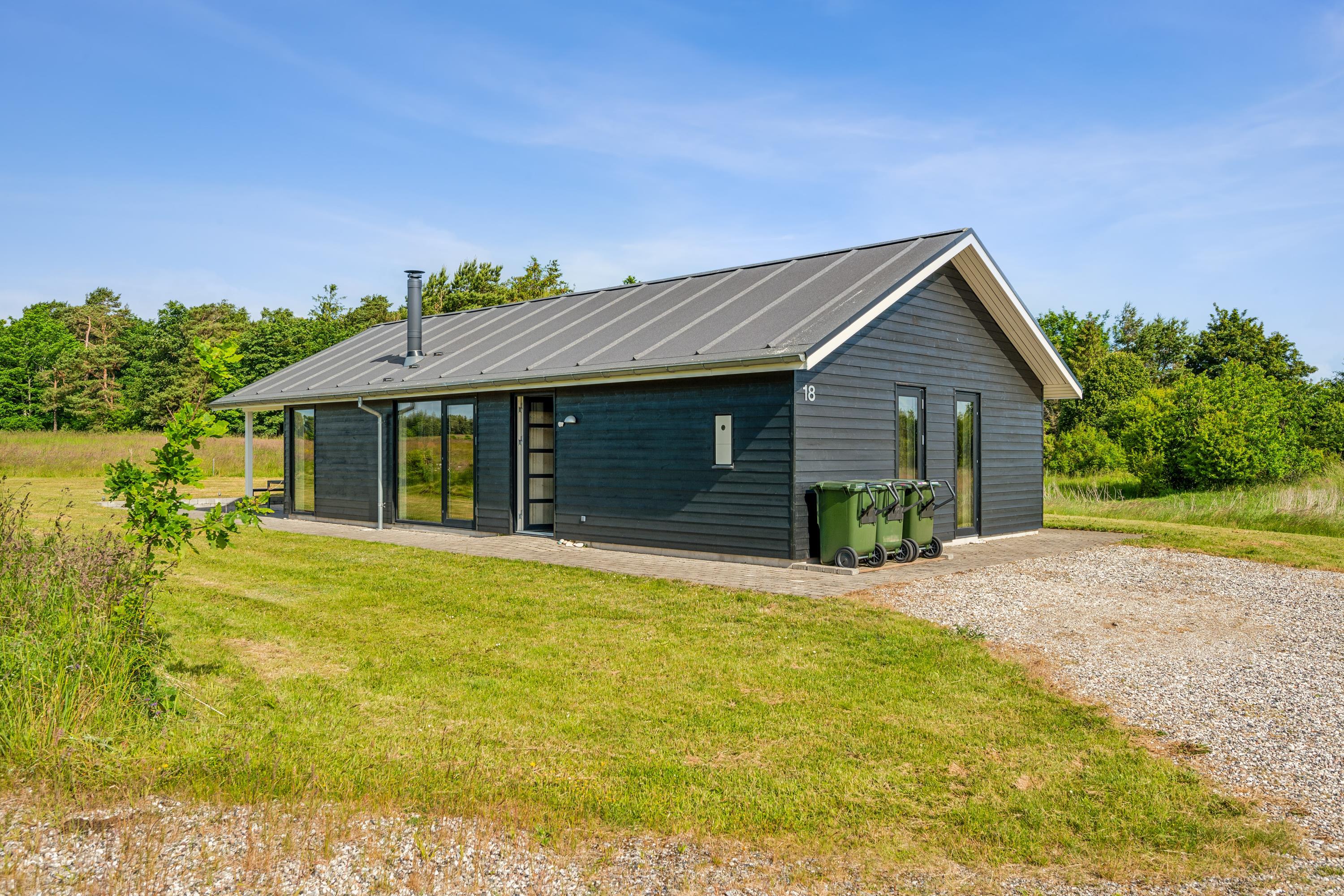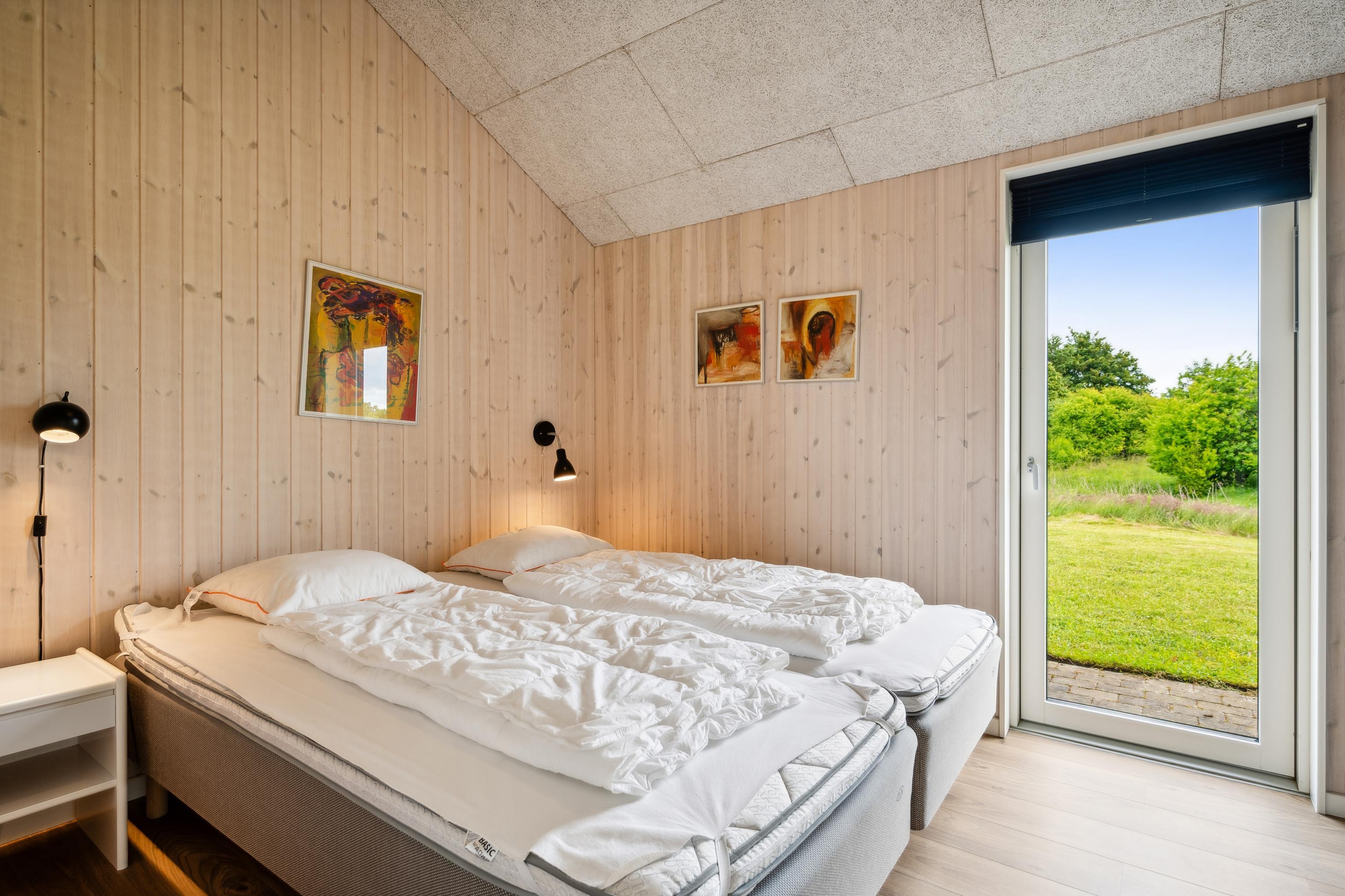 Dette moderne og rummelige sommerhus med 3 dejlige soveværelser har plads til op til 6 voksne og 2 børn (hemsepladser med madras). Et flot og lyst badeværelse med gulvvarme og bruseniche. Sæt jer godt til rette ved brændeovnen i stuen, lyt til den knitrende ild og nyd den vidunderlige udsigt over omgivelserne gennem gulv til loft-vinduerne, der også giver et dejligt lysindfald i huset. Der er både vaskemaskine, tørretumbler og opvaskemaskine til rådighed i feriehuset.