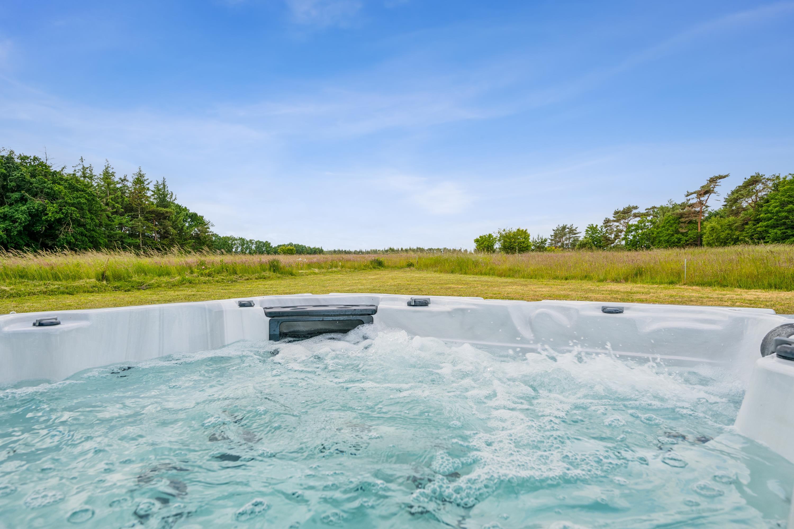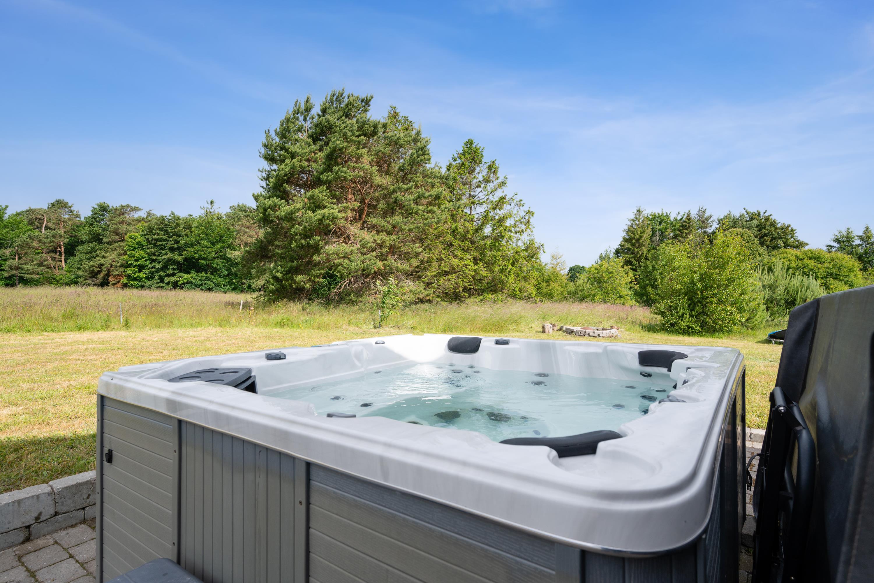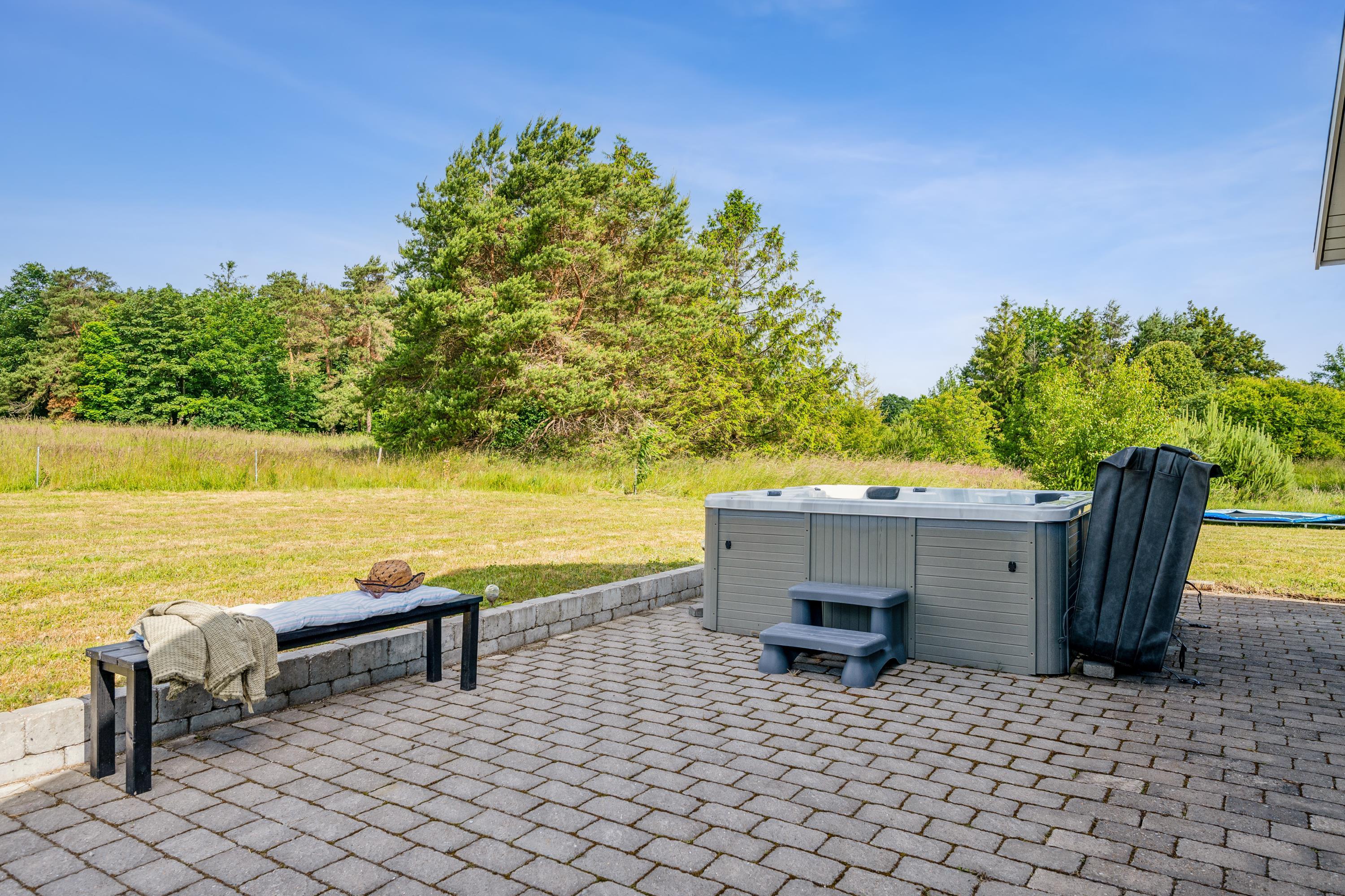 Moderne feriehus ved Gjerrild Nordstrand med spabad og trampolin for en aktiv familieferie.