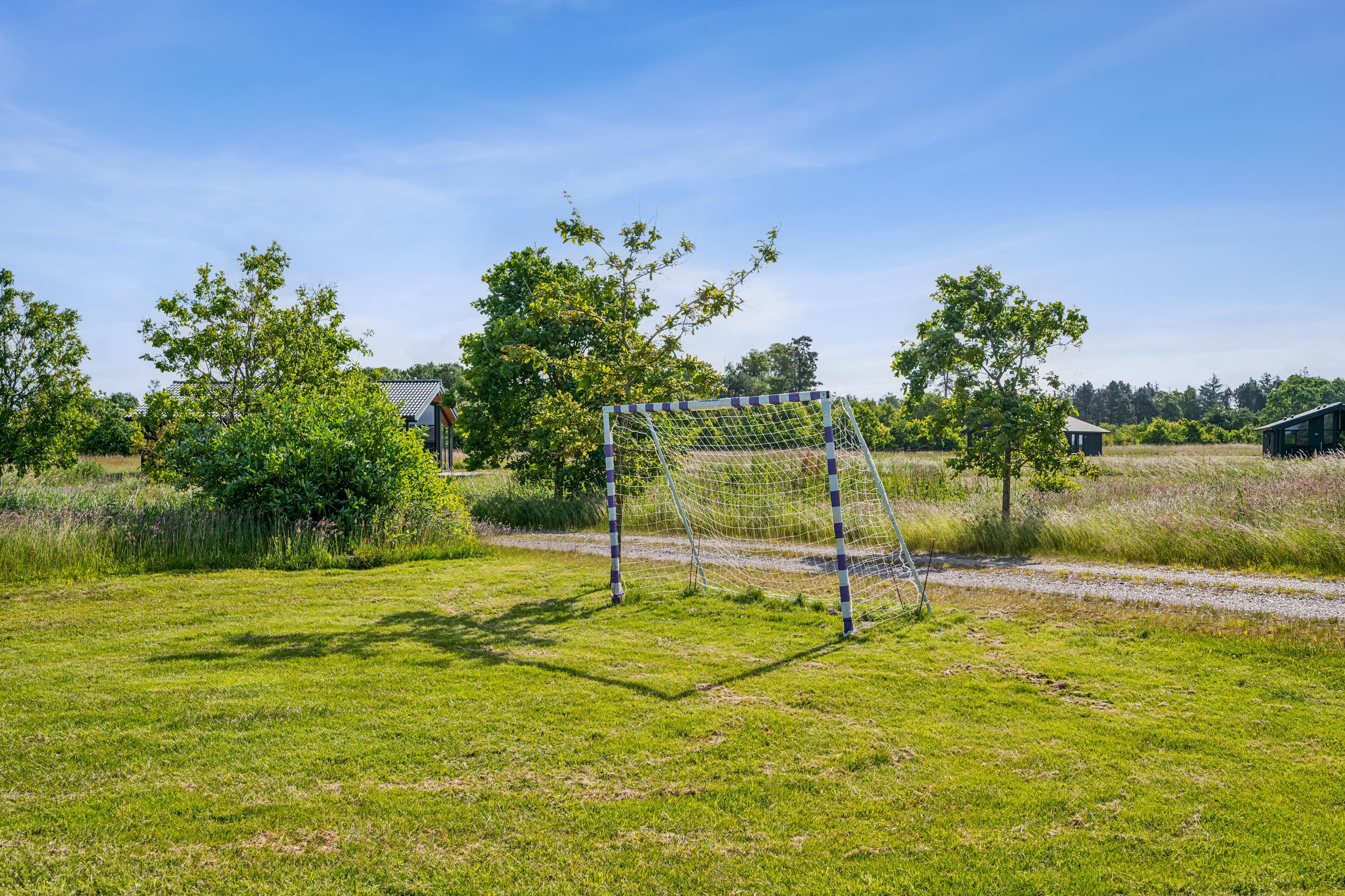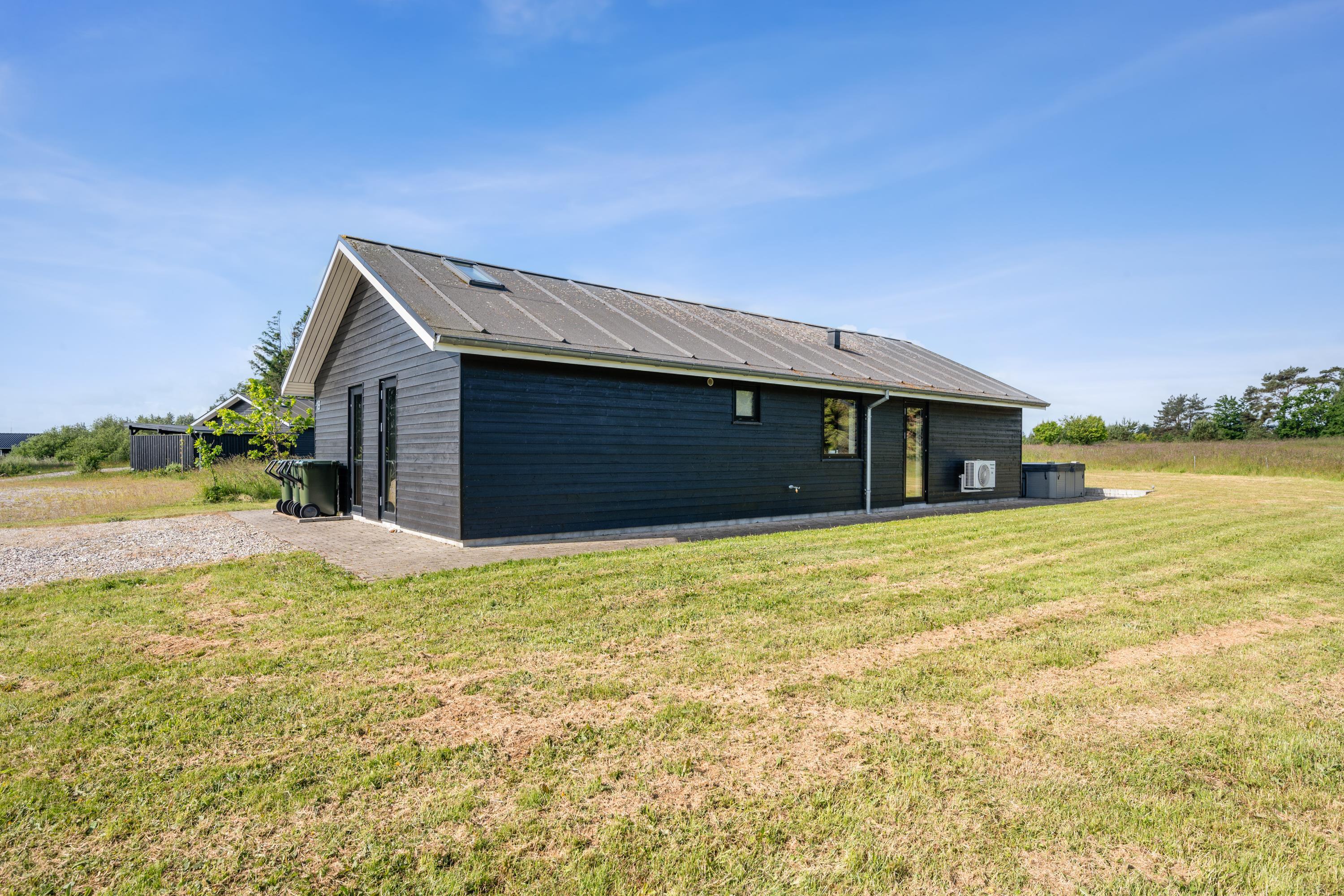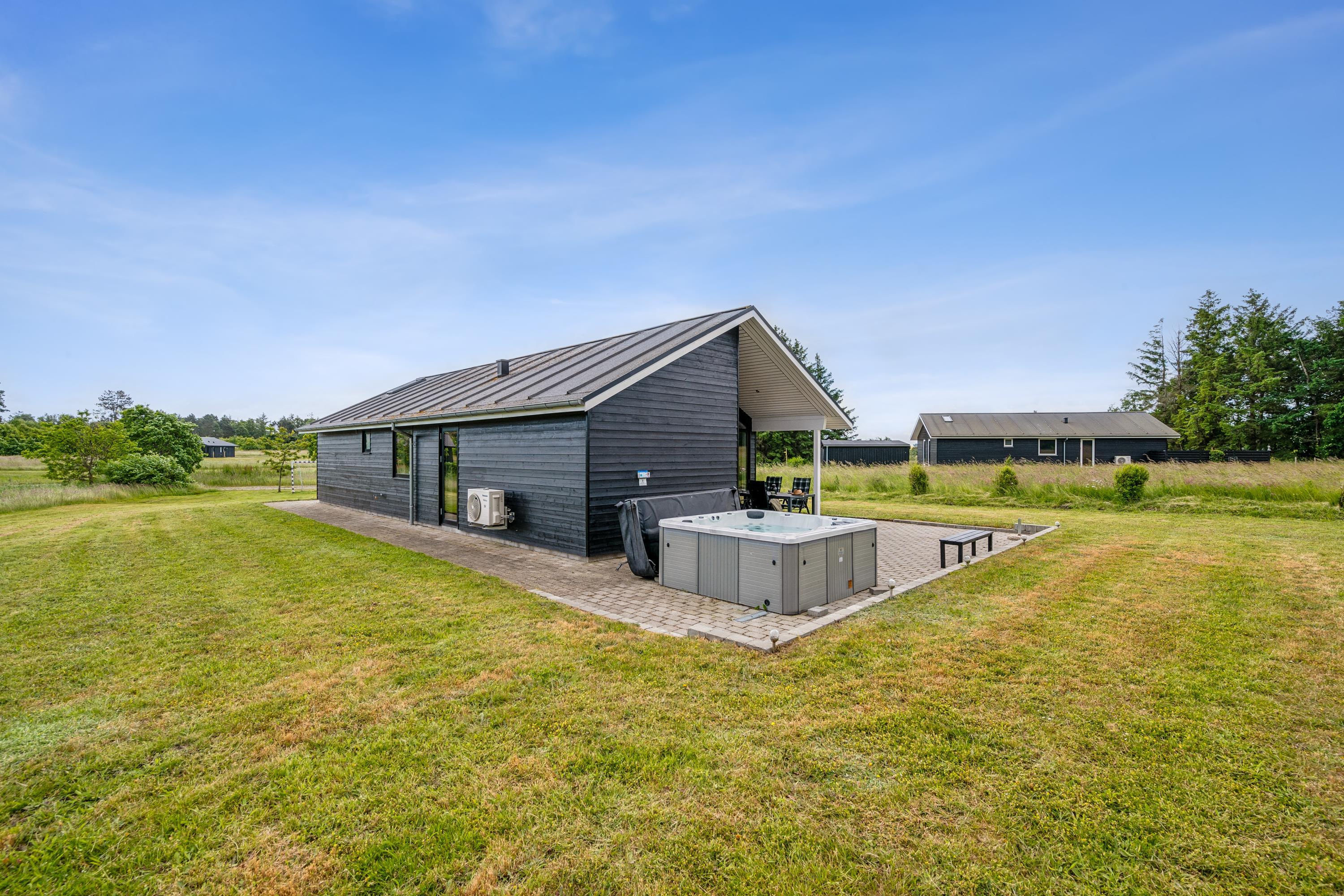 Moderne feriehus ved Gjerrild Nordstrand med spabad og trampolin for en aktiv familieferie.
