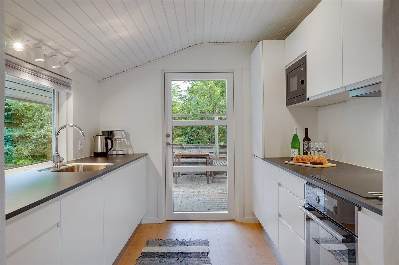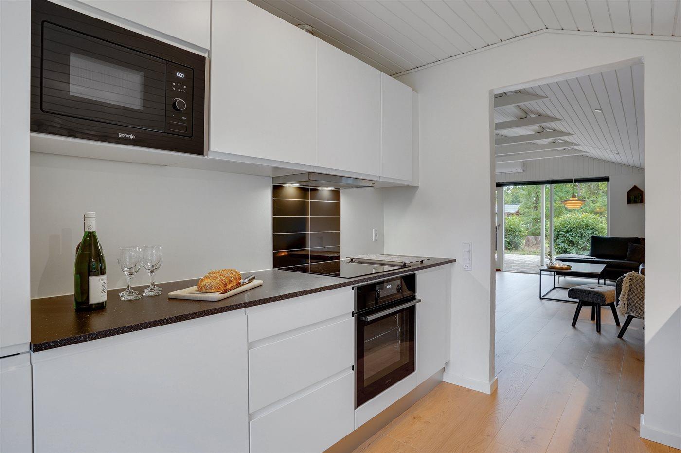 Køkkenet er udstyret med 1 køleskab. Der er 4 elkogeplader, varmluftovn, mikrobølgeovn samt opvaskemaskine.