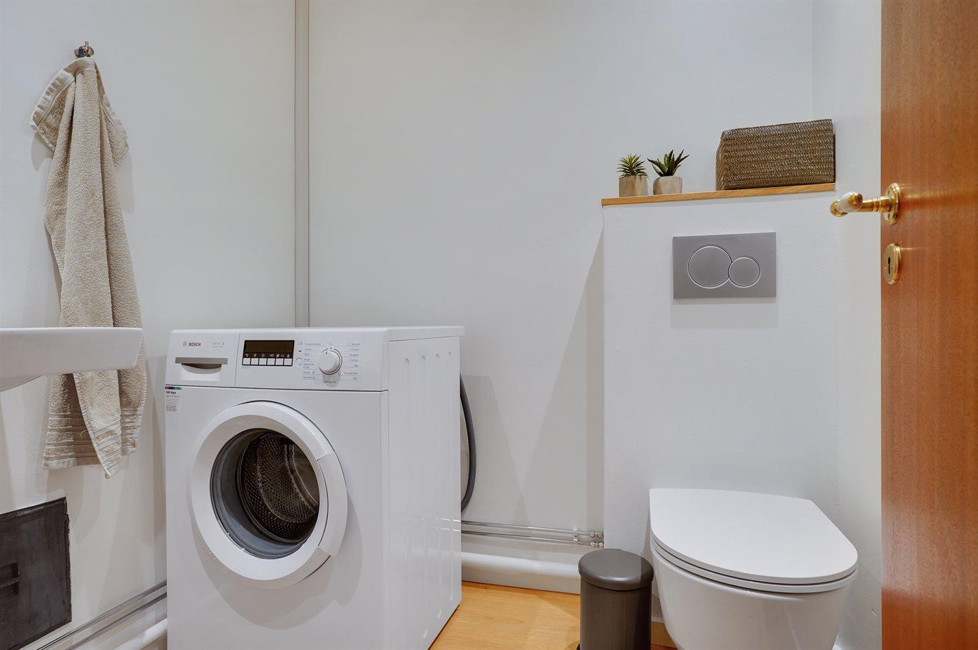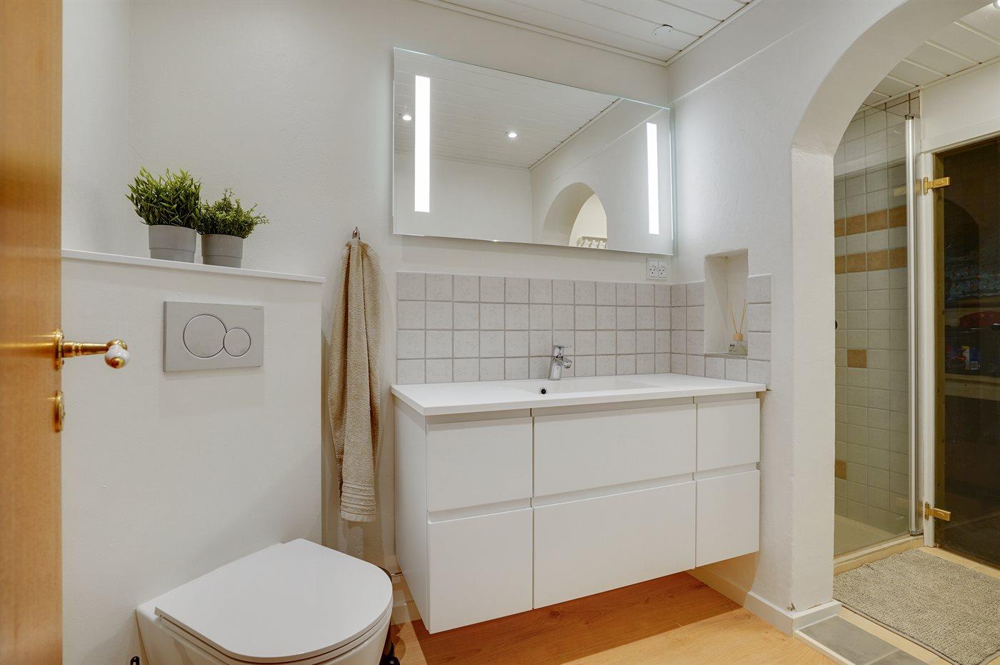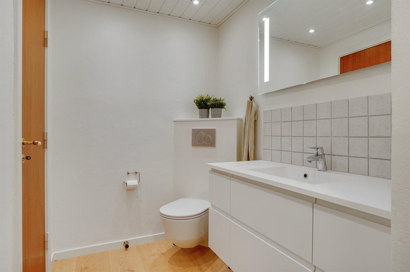 Der er 1 badeværelse med bruseniche og 2 toiletter, heraf 1 gæstetoilet.