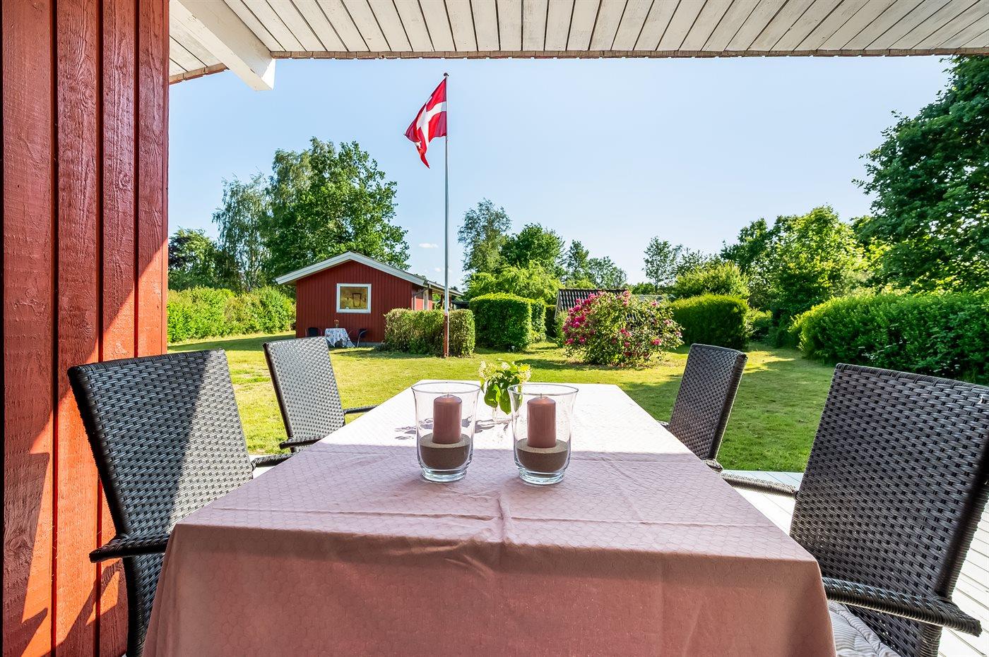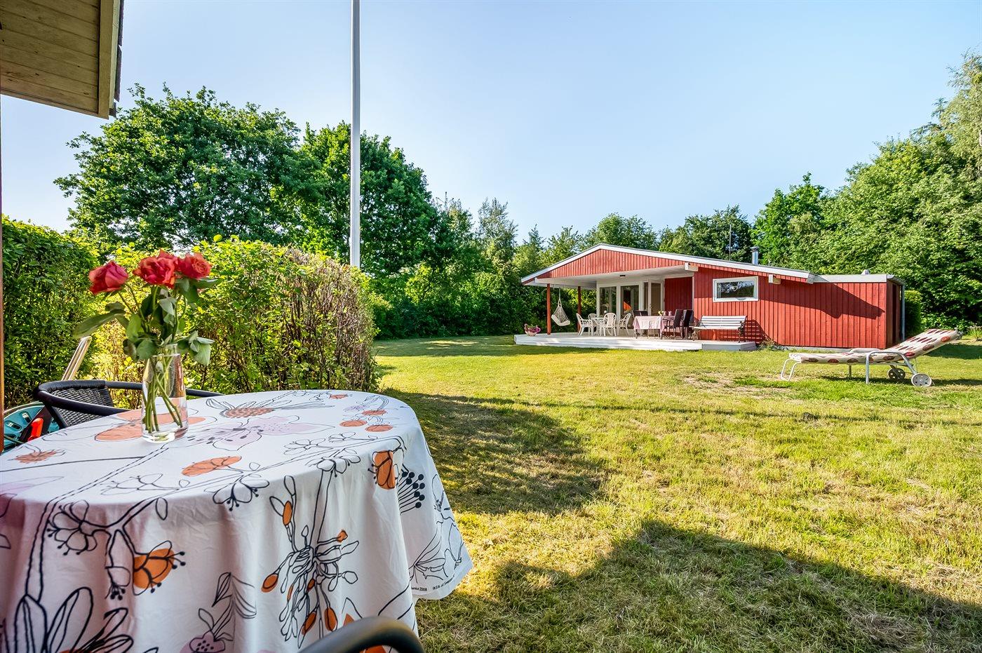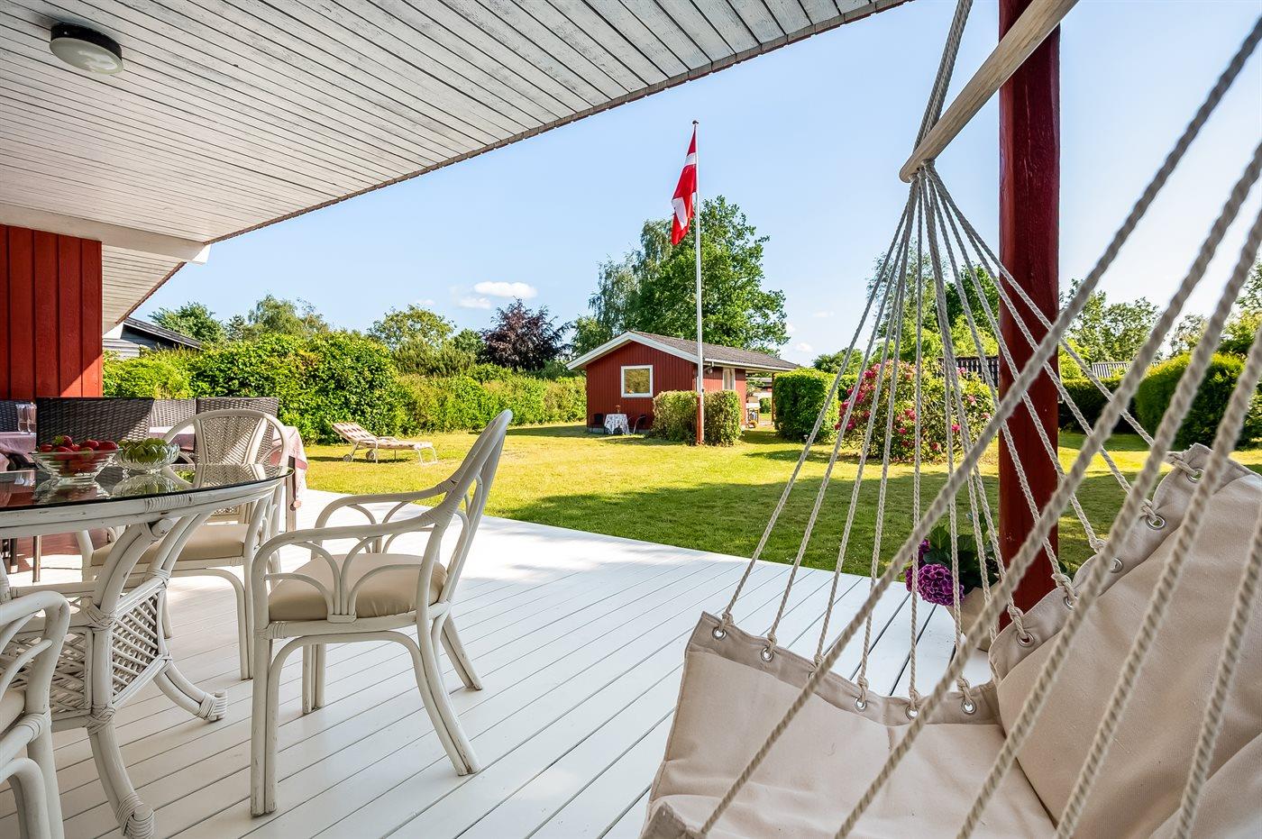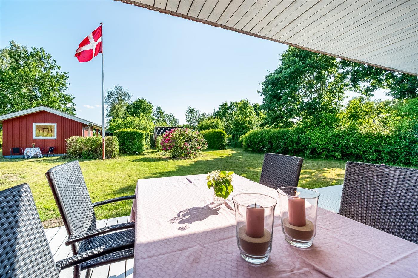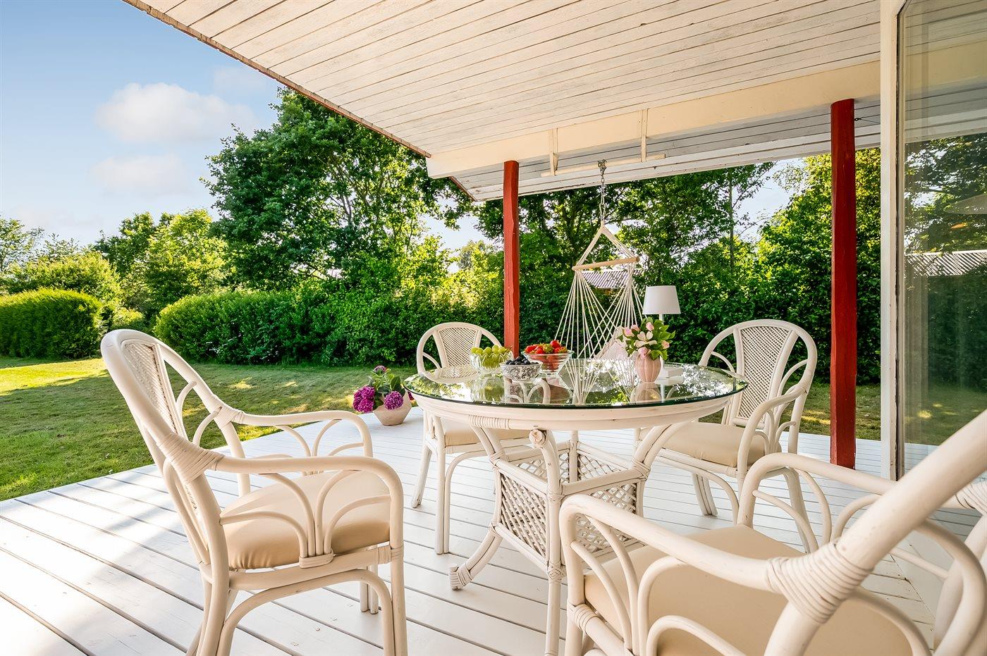 Sommerhuset ligger helt ugeneret på den dejlige grund og der findes gode terrassearealer, som er delvist overdækkede. Herfra kan du i særdeleshed nyde de skønne omgivelser med en kop kaffe eller et glas vin, og det er altid muligt at finde et hjørne med læ, hvor du kan nyde solen.