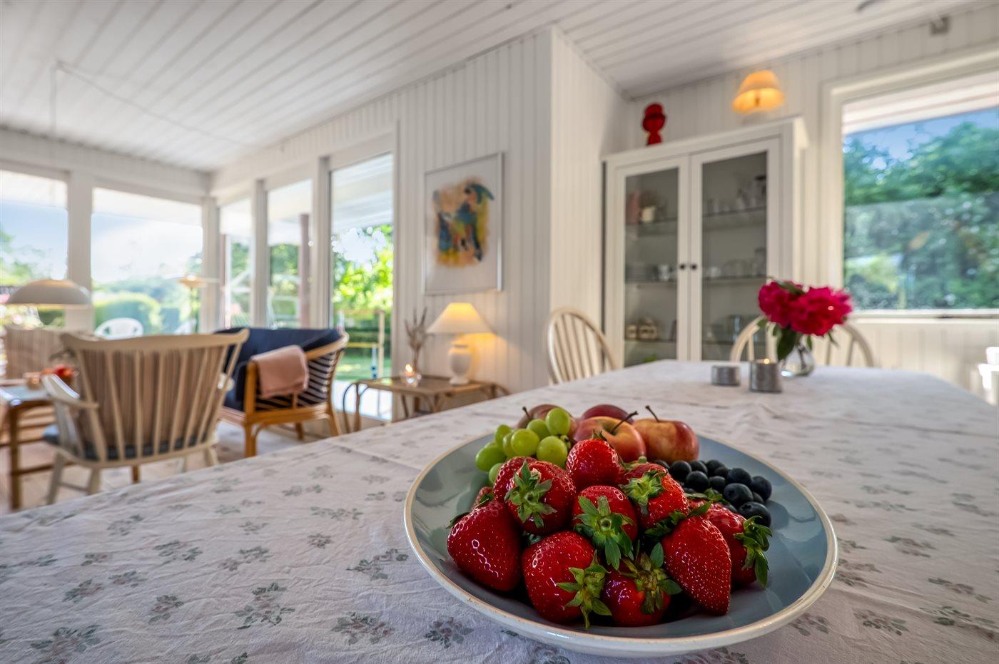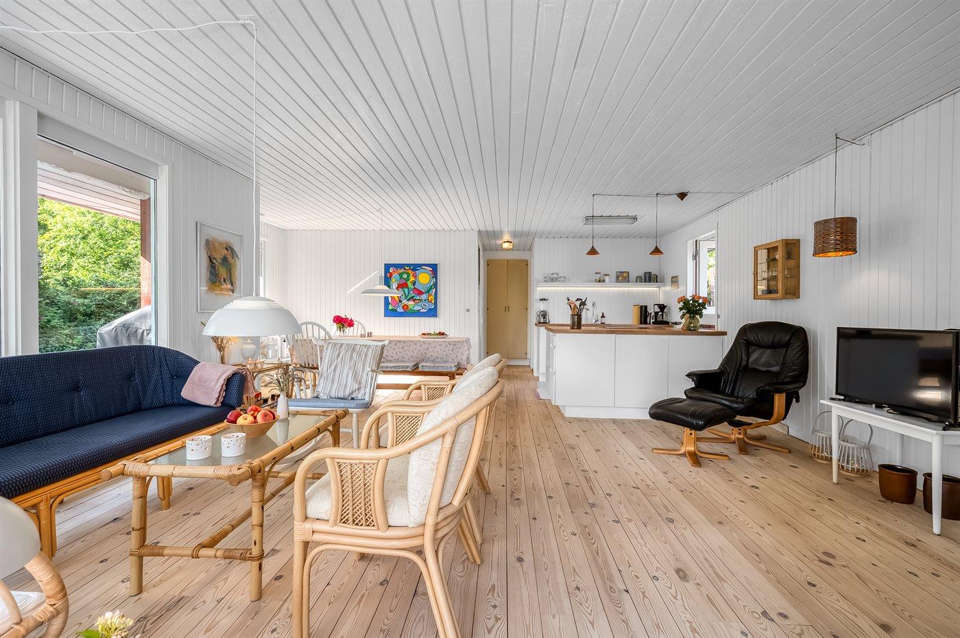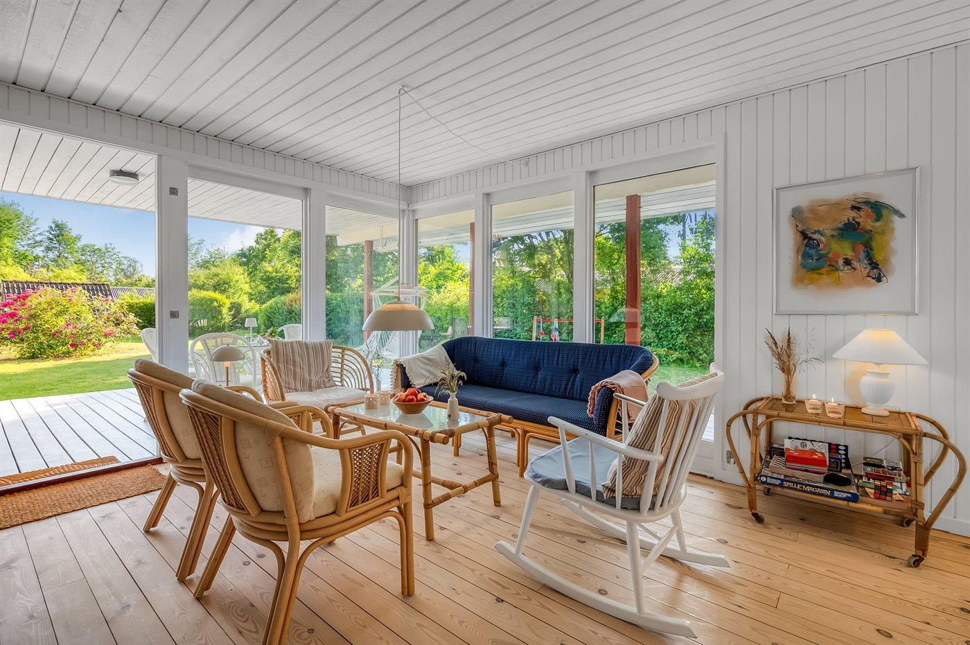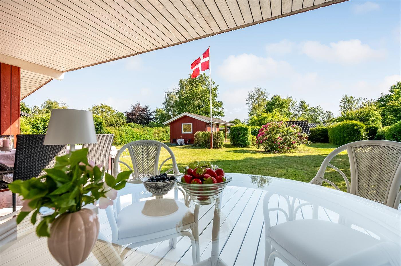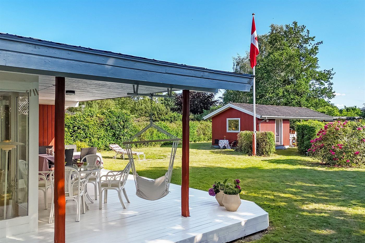 Sommerhuset ligger helt ugeneret på den dejlige grund og der findes gode terrassearealer, som er delvist overdækkede. Herfra kan du i særdeleshed nyde de skønne omgivelser med en kop kaffe eller et glas vin, og det er altid muligt at finde et hjørne med læ, hvor du kan nyde solen.