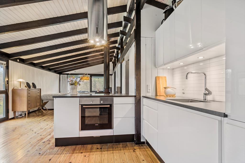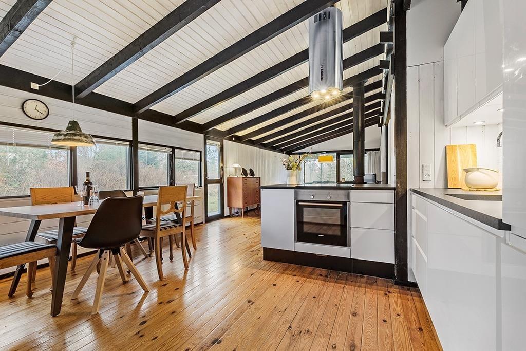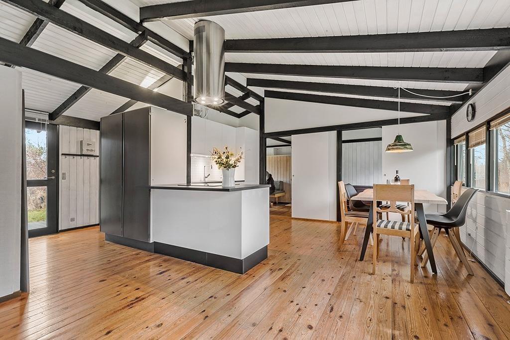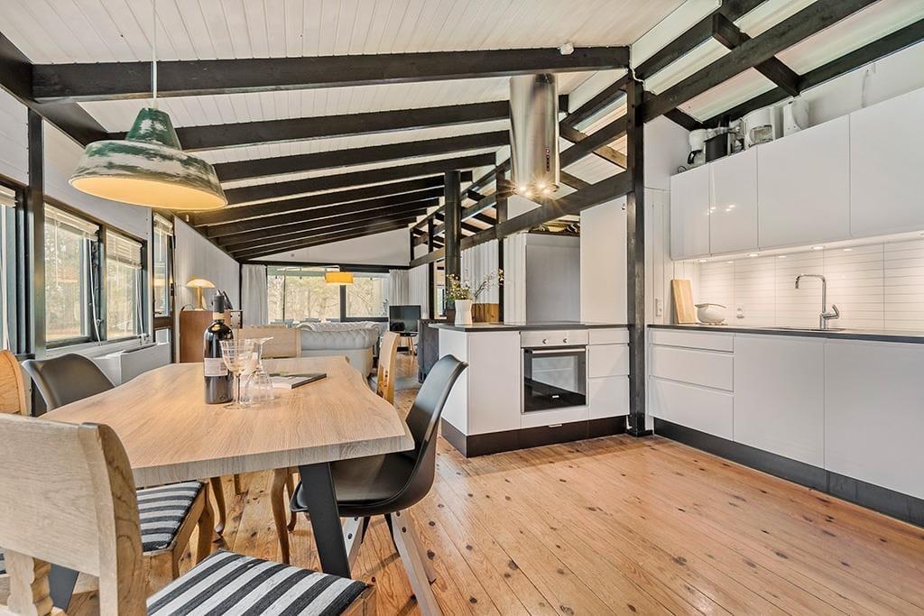 Resten af huset er en kærlig blanding af gammelt og nyt. Møblerne fortæller hver sin historie, og det hele smelter sammen i en varm og indbydende atmosfære. De originale, lakerede trægulve knirker let, som de har gjort det i generationer, og de synlige loftsbjælker under loftet til kip minder om en tid, hvor ting blev bygget med hænder og hjerte. De indvendige skydedøre giver plads og frihed – lige det, der er brug for på ferien.