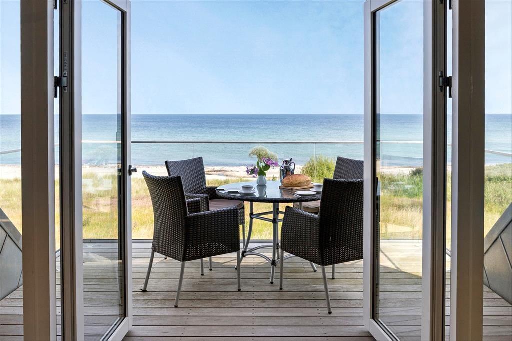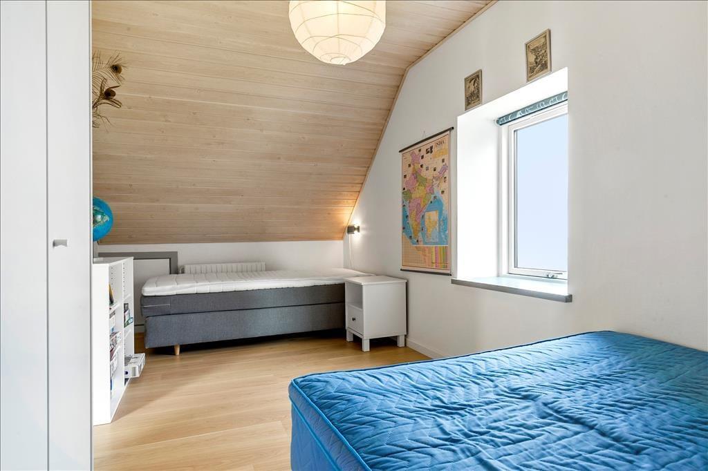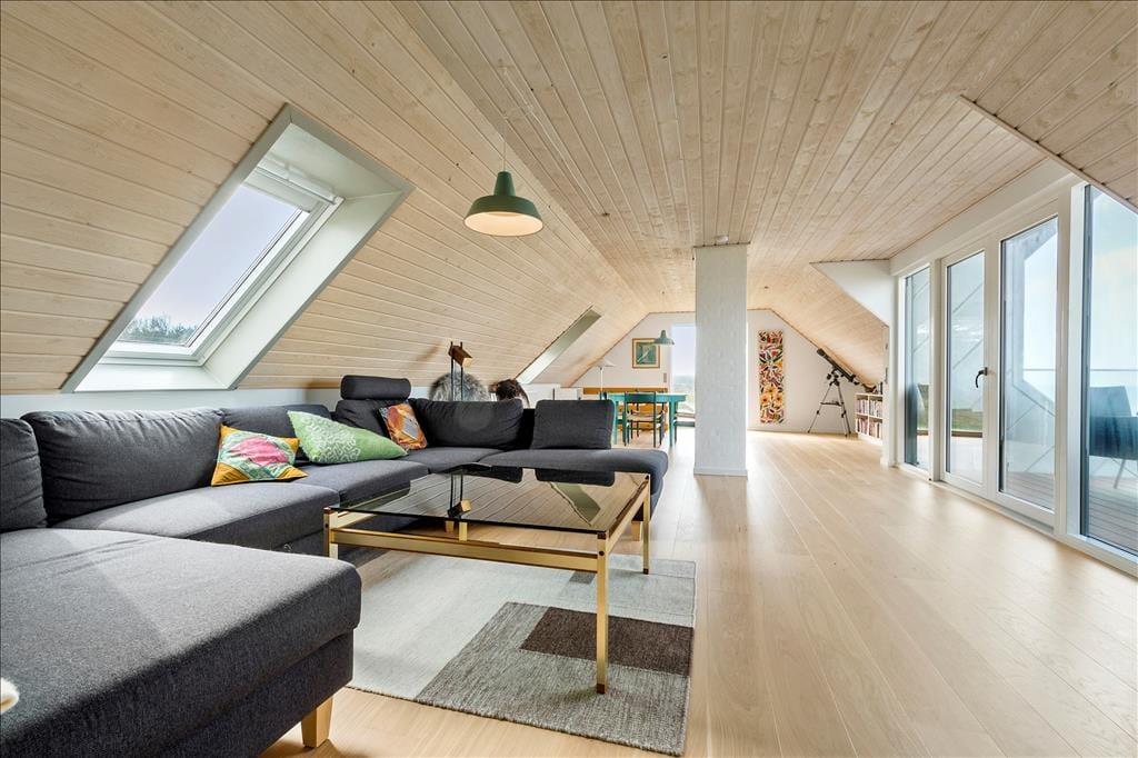 Fra entréen fører trappen dig op til første sal, hvor husets magi for alvor udfolder sig. Her venter en stor, lys opholdsstue, der indbyder til rolige stunder, spil, grin og ren afslapning. Gennem terrassedøren træder du direkte ud på en helt unik terrasse med panoramaudsigt over havet. Her kan du nyde morgenkaffen, aftenvinen eller bare lade blikket glide ud over horisonten, mens verden falder til ro. Et rummeligt soveværelse med tre sovepladser fuldender etagen – perfekt til en god nats søvn til lyden af havet.
